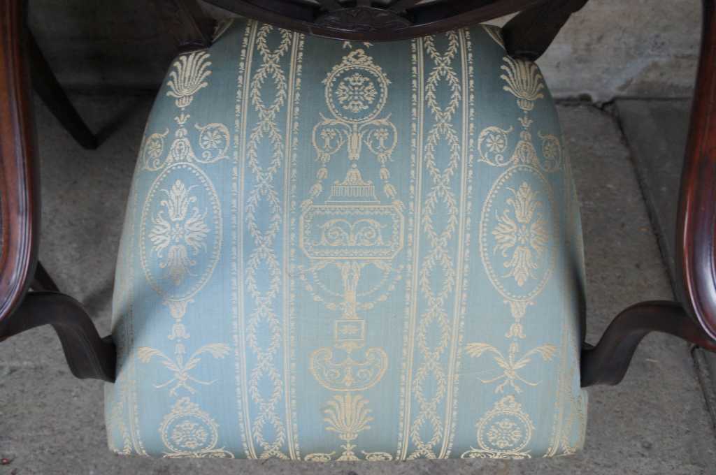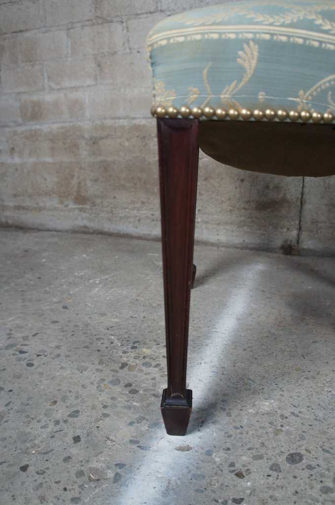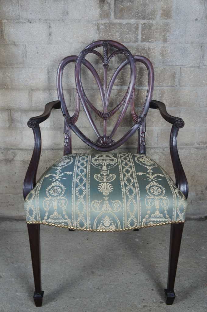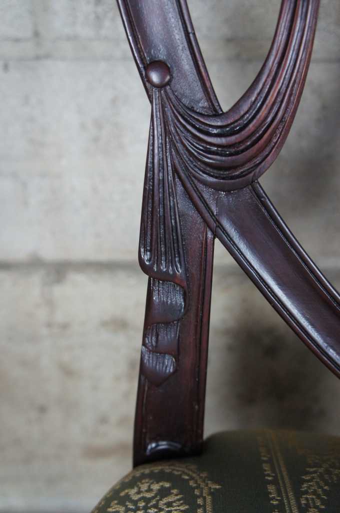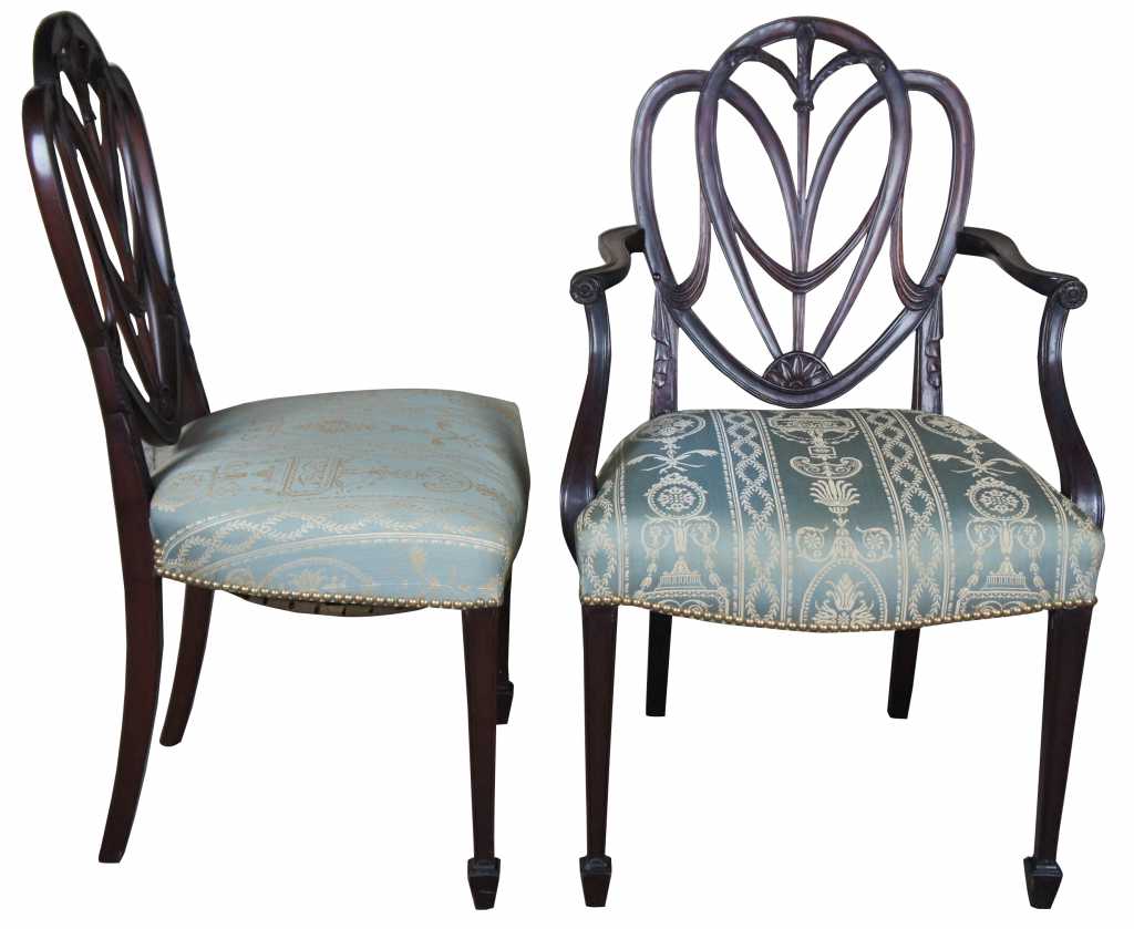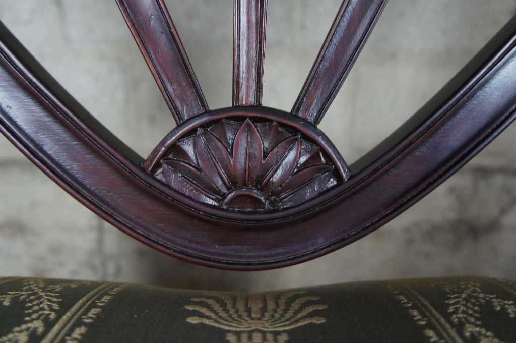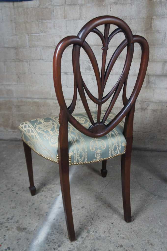 8 hepplewhite or sheraton inspired 20th century dining chairs. Made from mahogany with intricatly carved back leading to scalamandre style fabric, nailhead trim, tapered legs over spade feet.