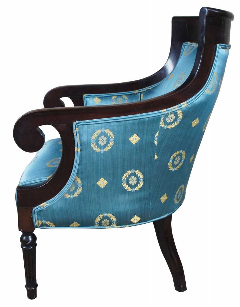 Circa 1920s American Empire style club chair. Features a curved back leading to scrolled arms, over turned and fluted legs. Uphosltered in a blue and gold silk scalamandre fabric.