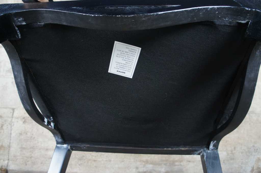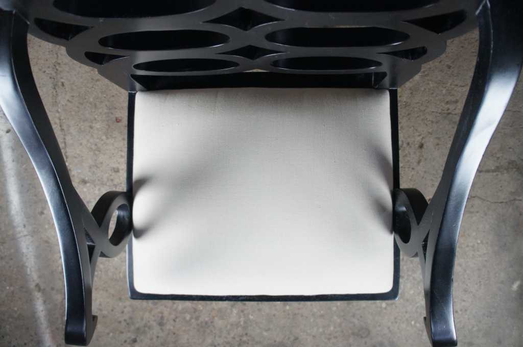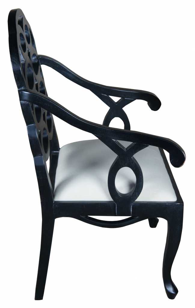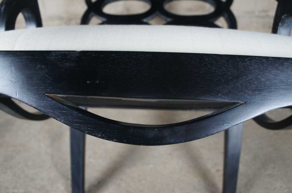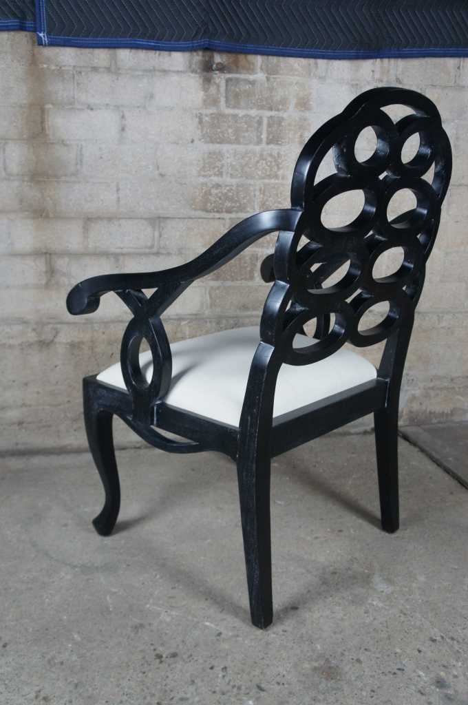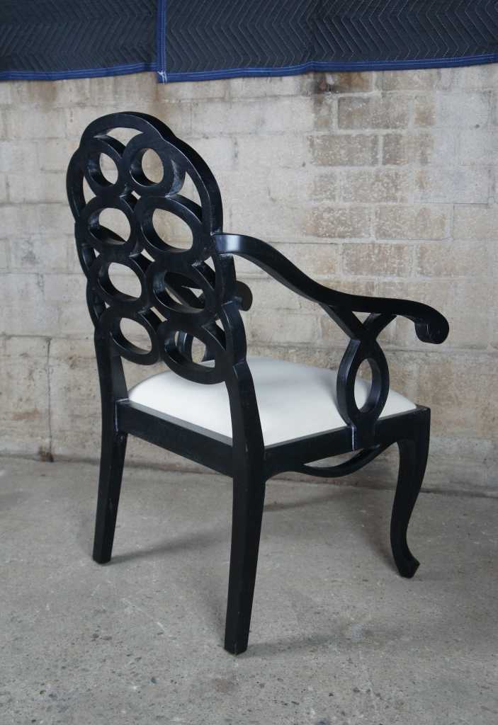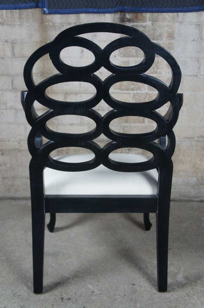 Two oversized black geometric circular back armchairs.