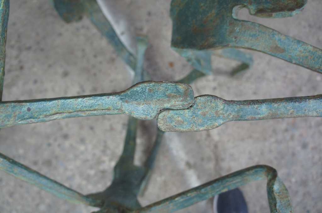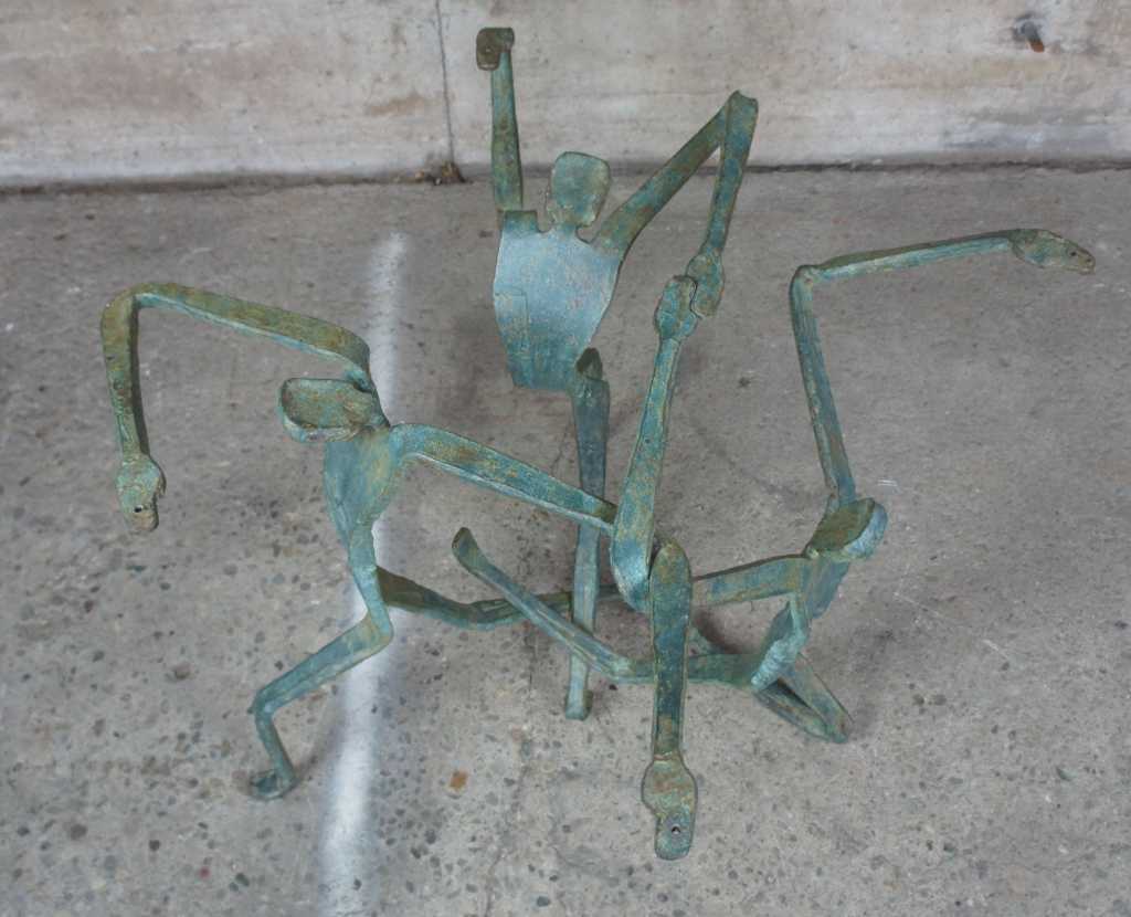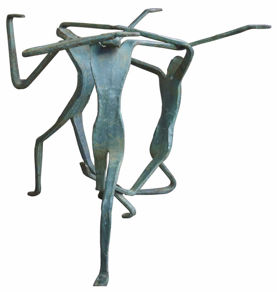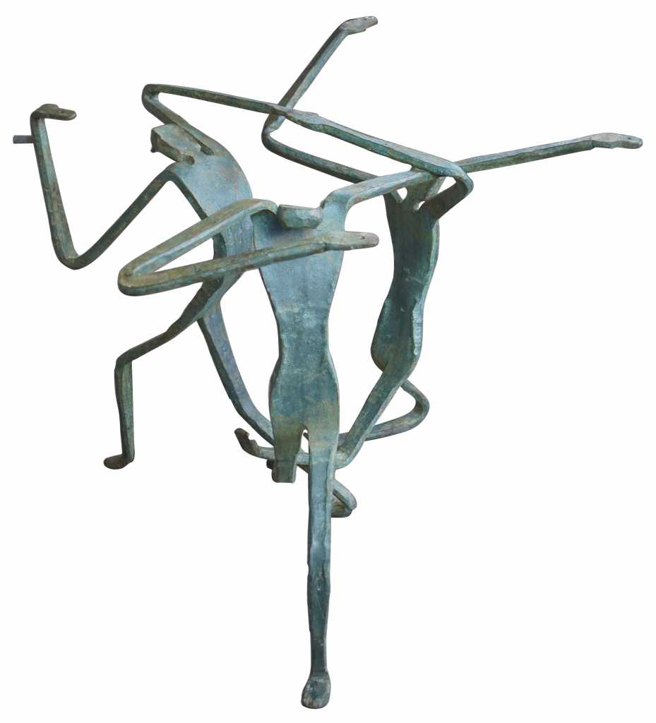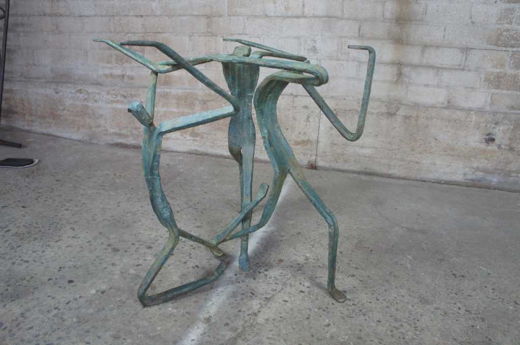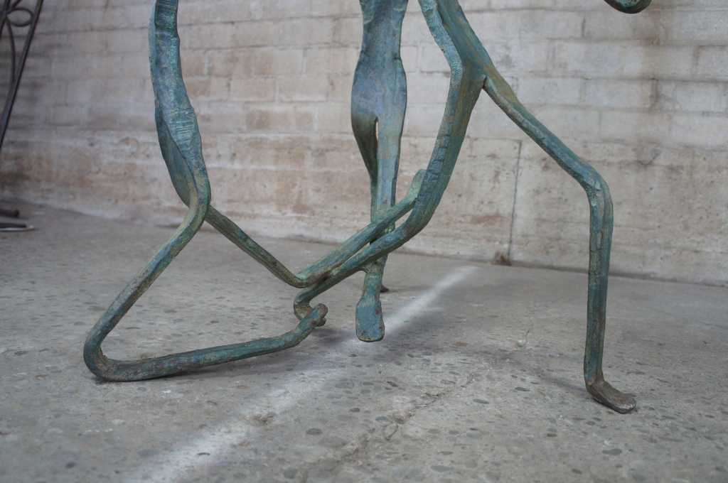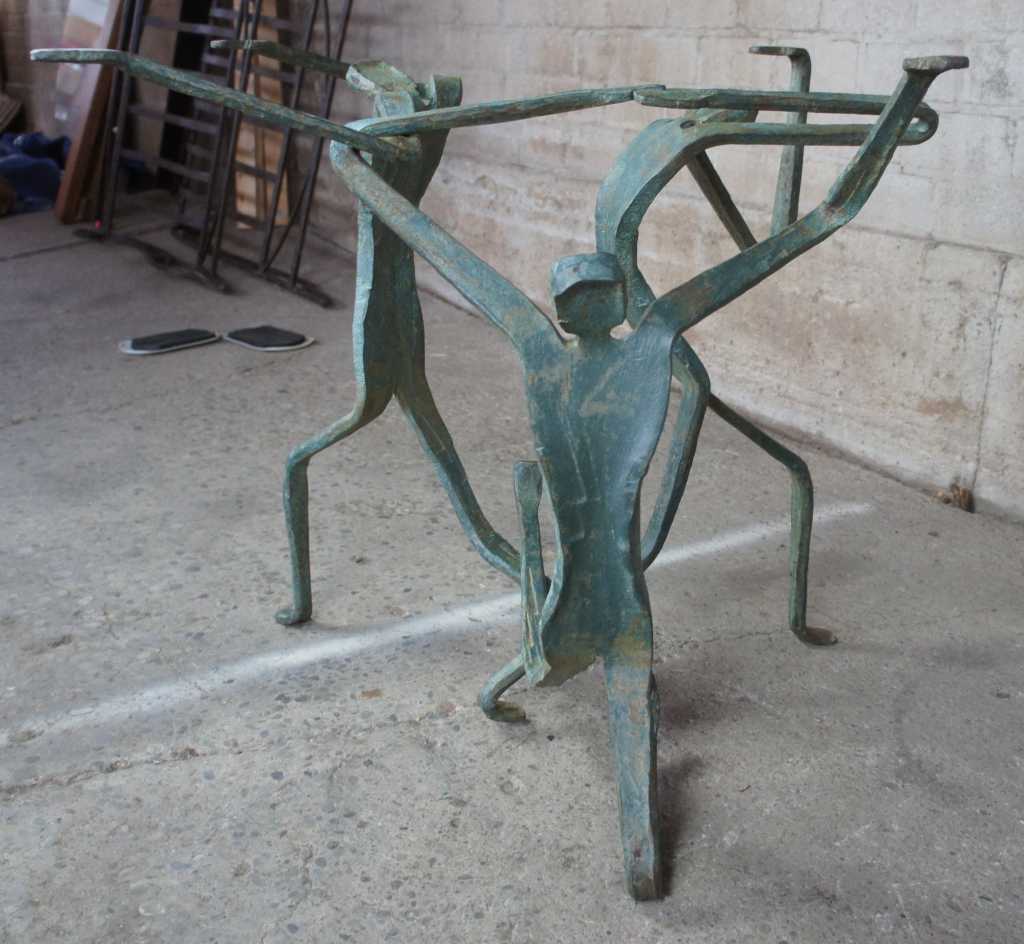 Sculptural cast bronze table base. Finished in a patenated green. Features three interwoven figures with their hands outstretched to support a table top. Great for use indoors, outdoors or stand alone.