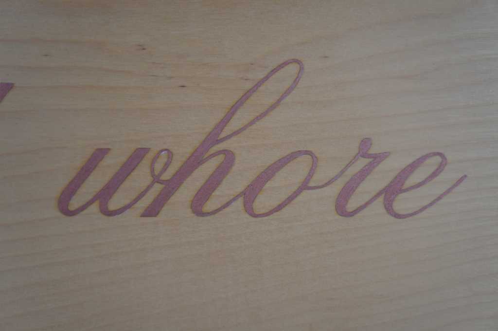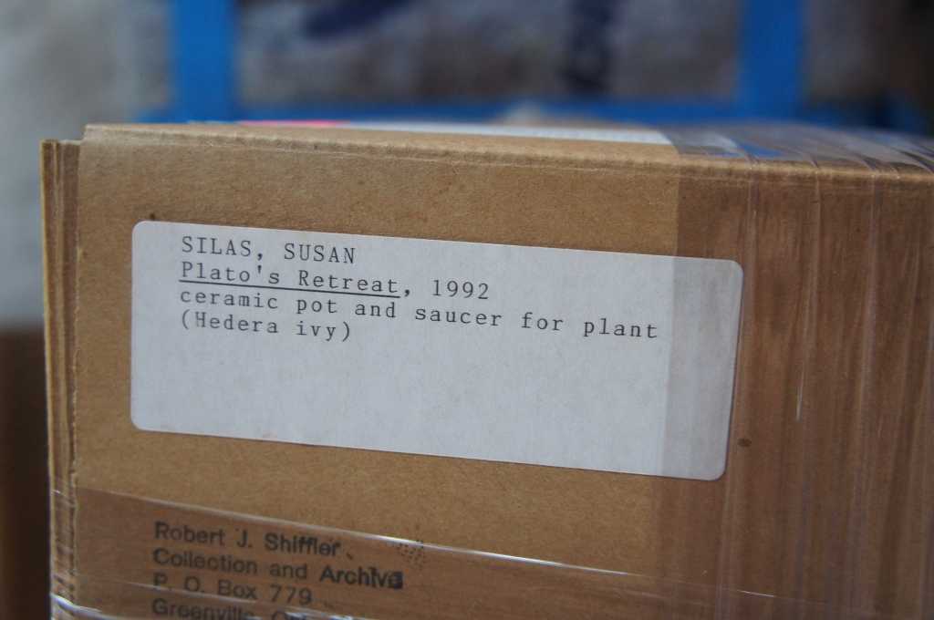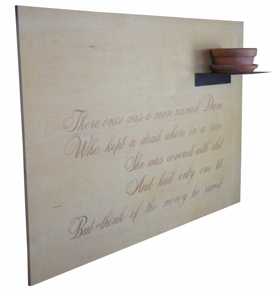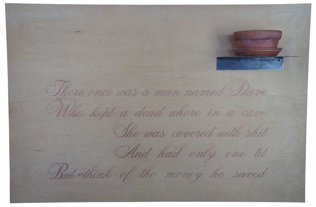 1992 Mixed media by Susan Silas, from the Exquisite Corpse Series. The pot and saucer are for a Hedera Ivy plant that would have adorned the original piece in the exhibit. The classical font or text is painted in a light purple tone ink on wood. ""There once was a man named Dave Who kept a dead whore in a cave She was covered with shit And had only one tit But think of the money he saved"". Susan Silas (American, b. 1953)