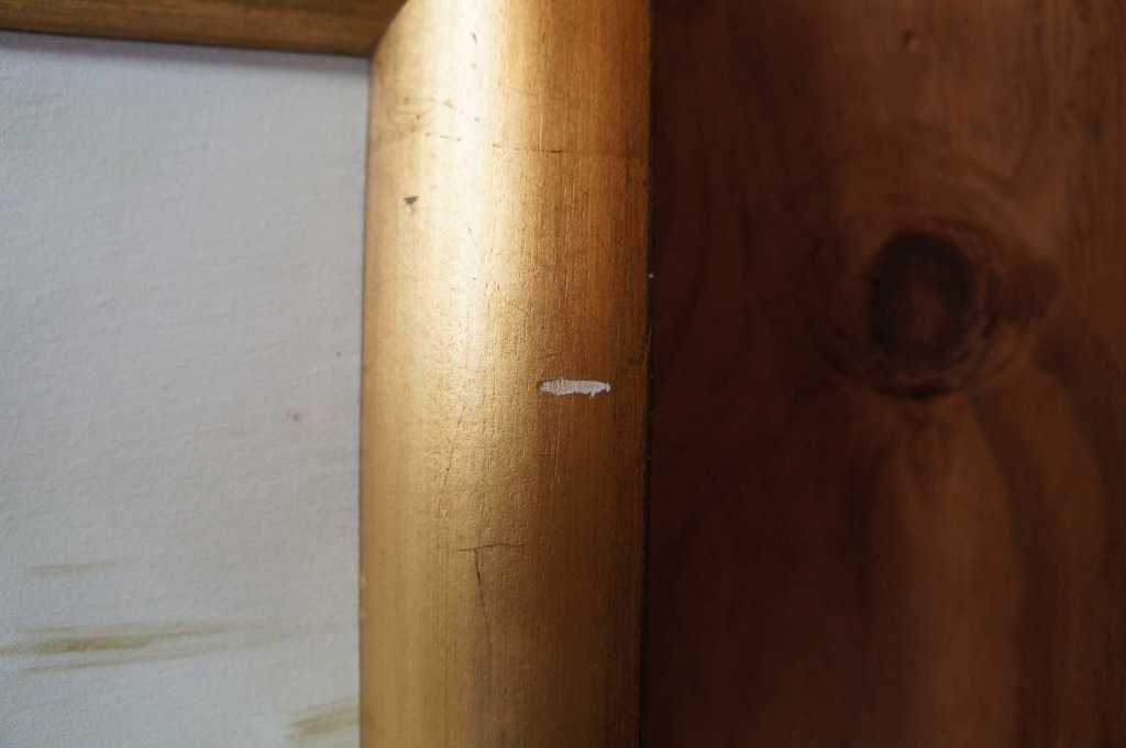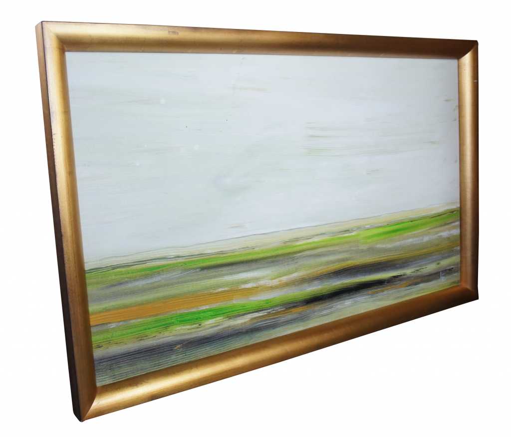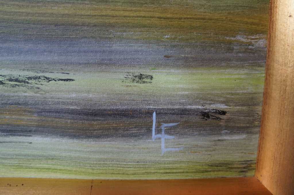 Abstract impressionist landscape singed LE. Features land along the horizon with greens and blues and oranges, painted by a university of Michigan grad student in the 1990s. Oil on canvas, framed in gold.