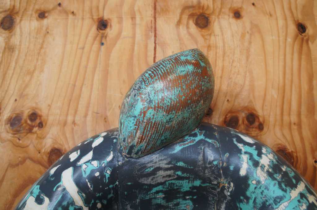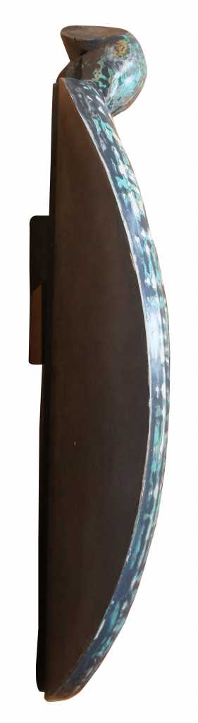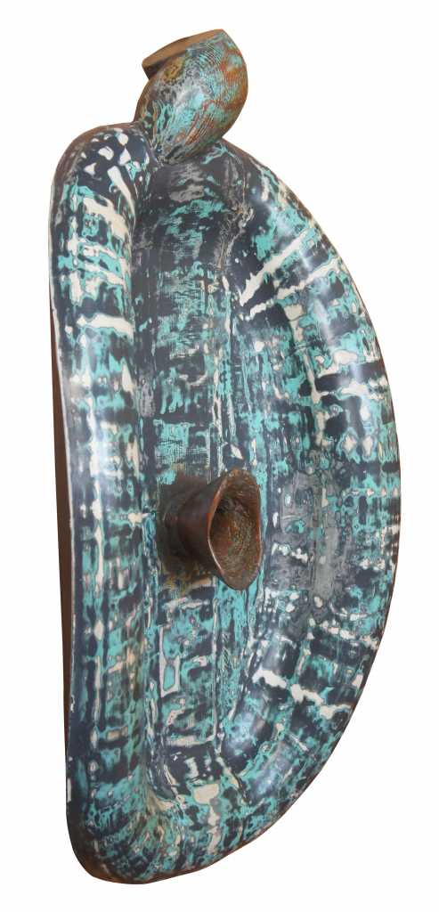 1991 Jack Carter wall medallion sculpture. Features modern styling with tortoise shell shape and hand carved detail / painted finish.