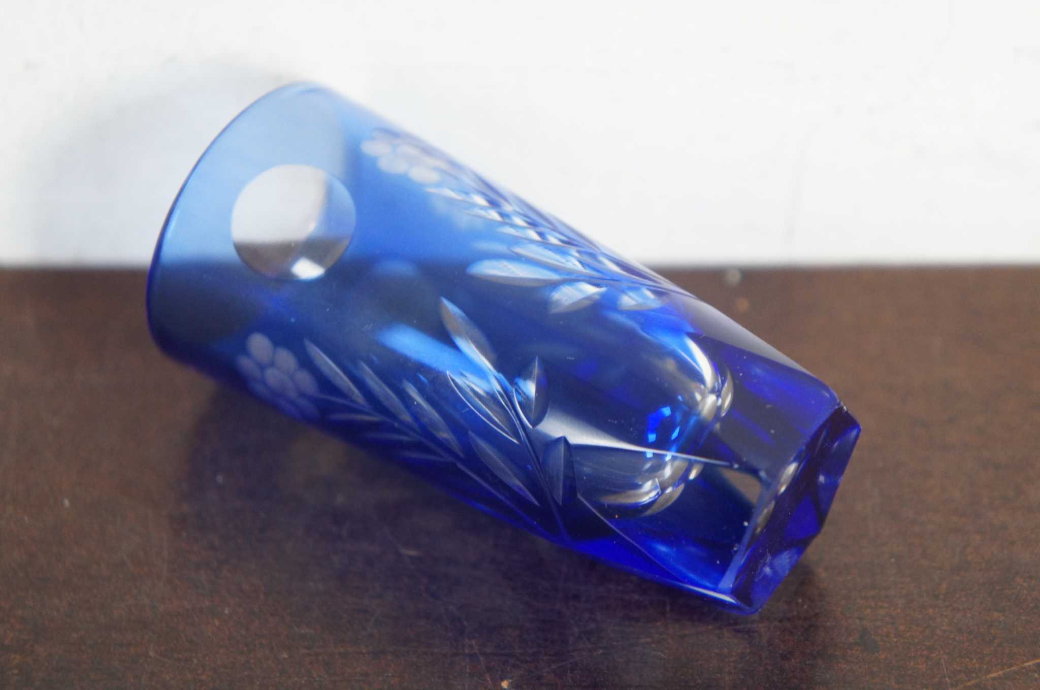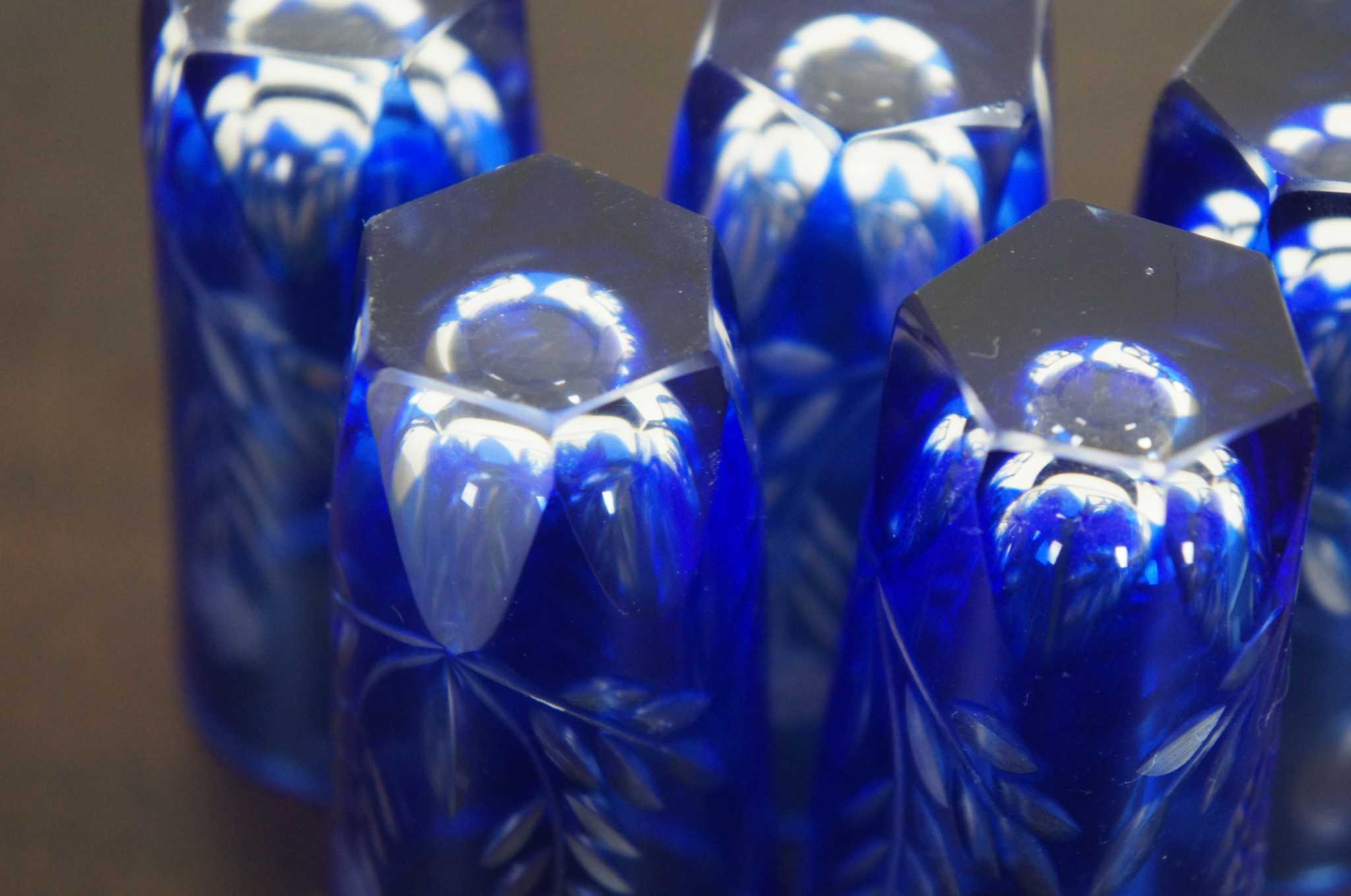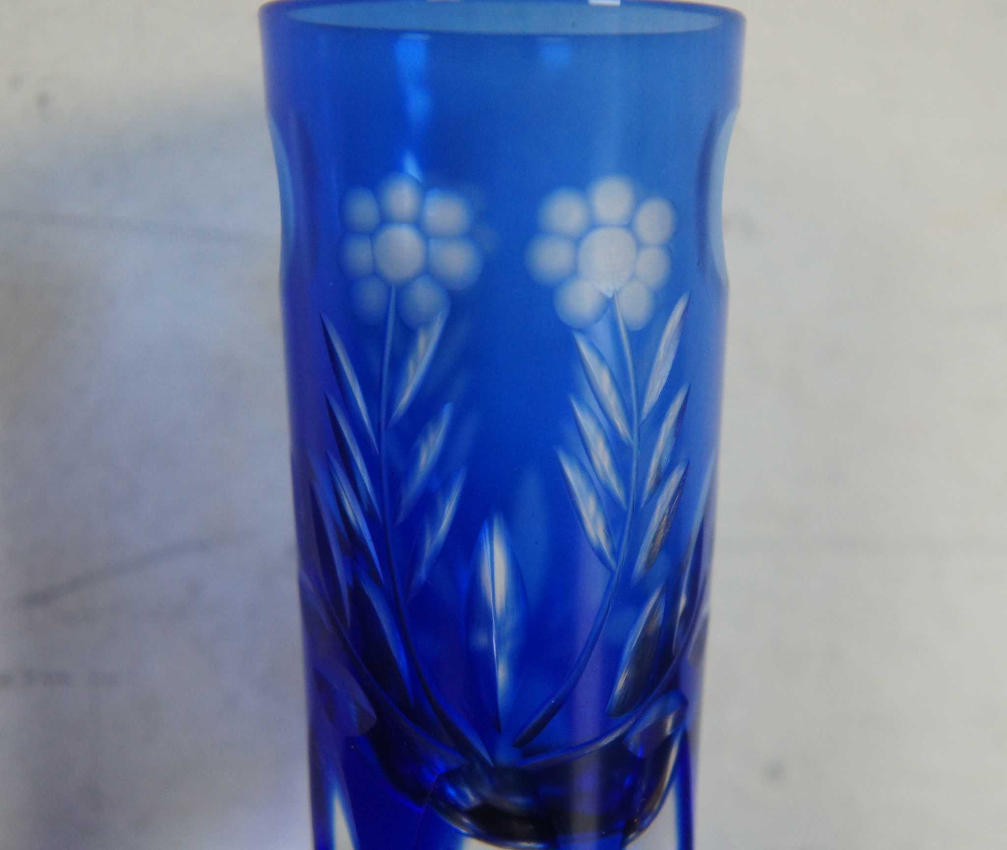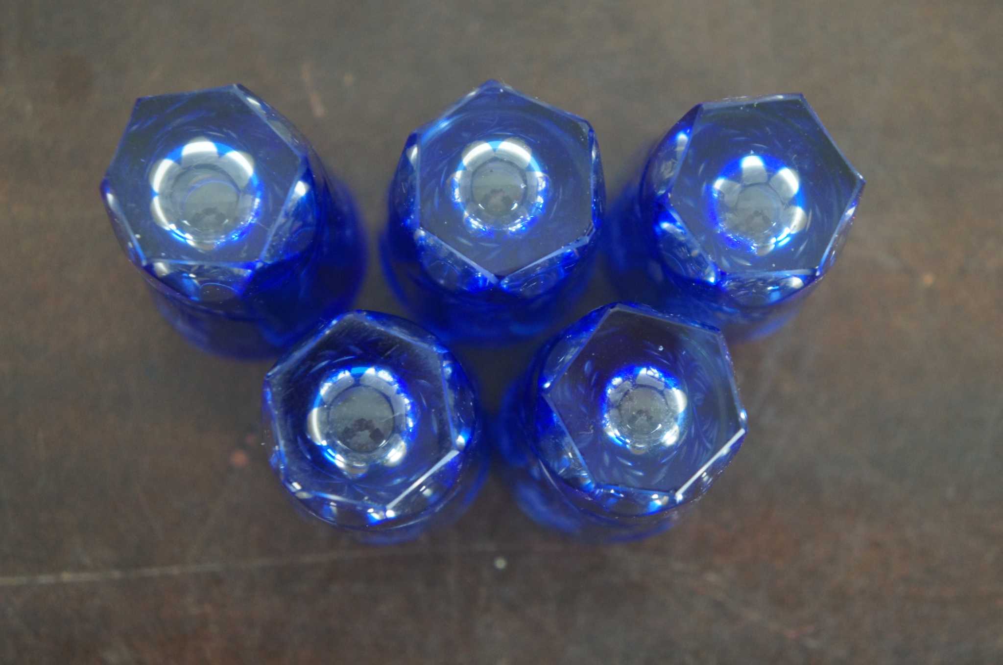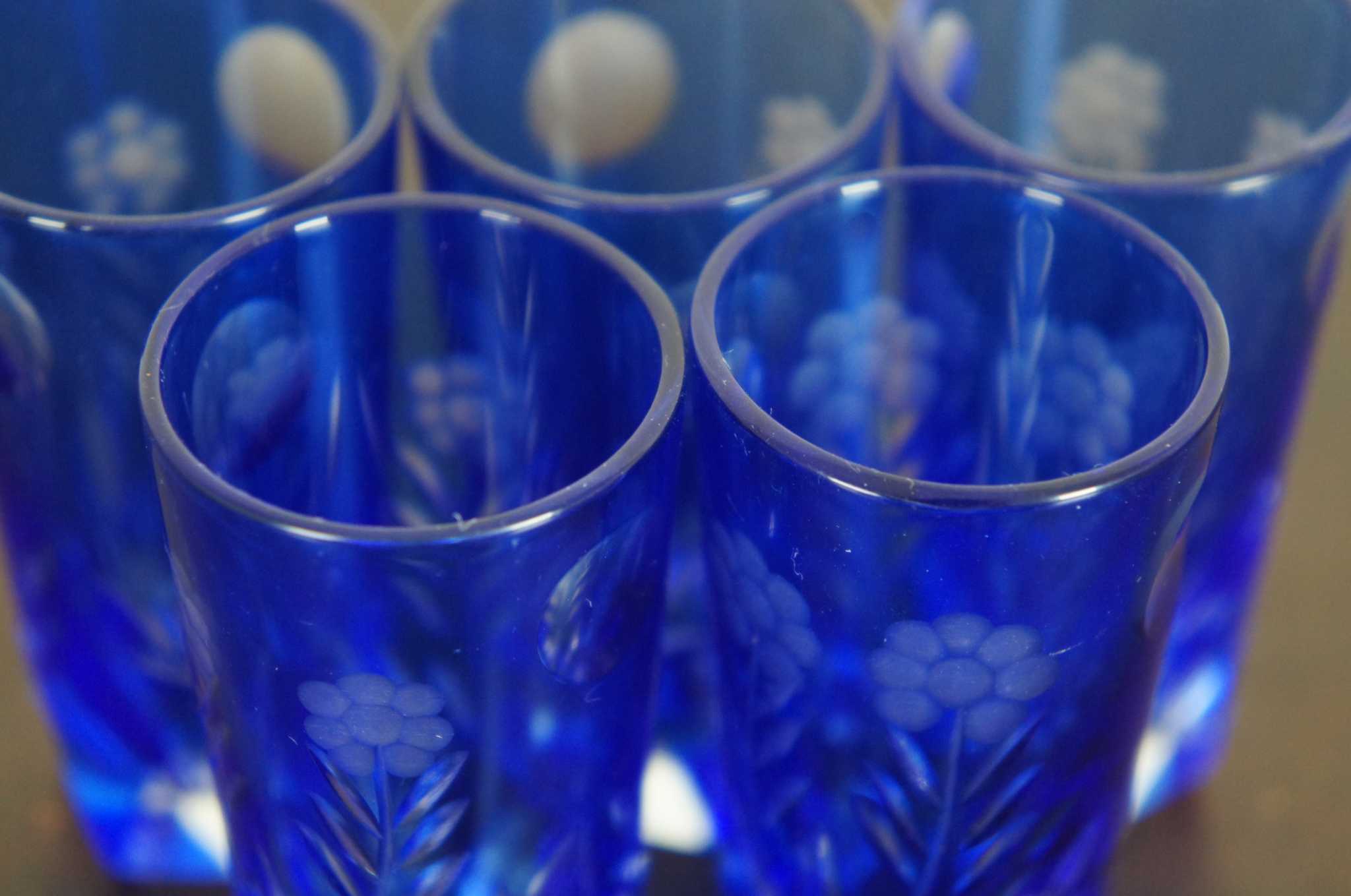 5 Vintage Bohemian Cobalt Blue Cut to Clear Sunflower Etched Crystal Bar Shot Glasses Aperitif