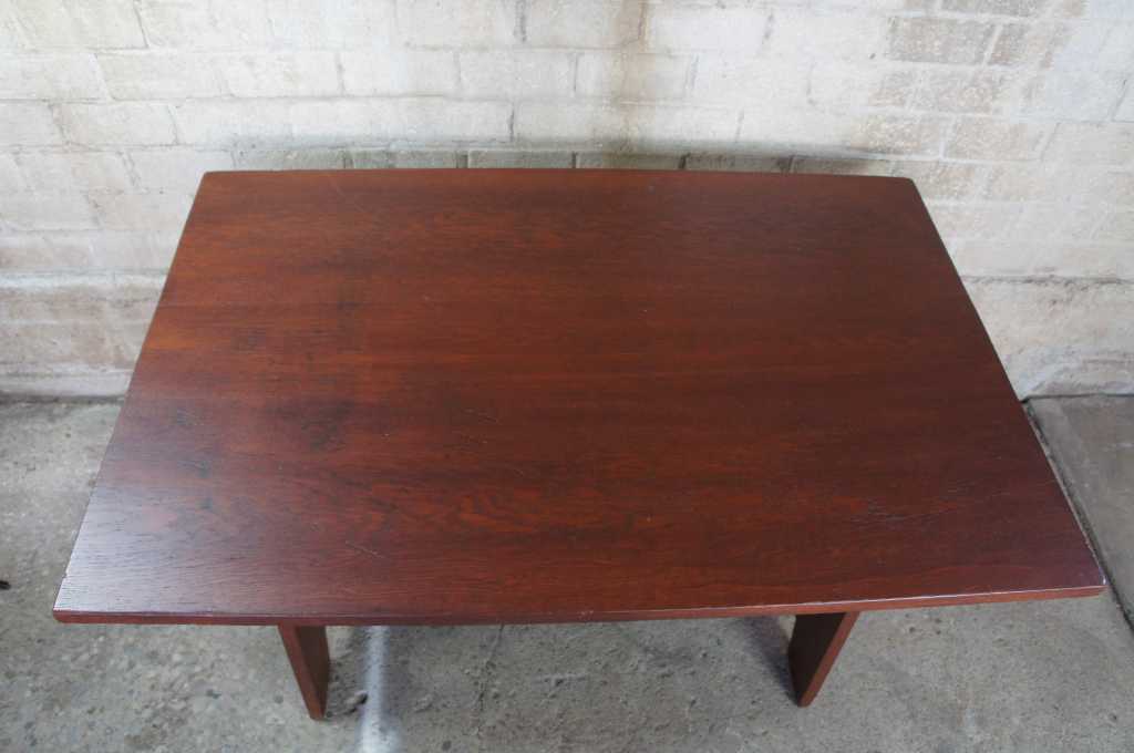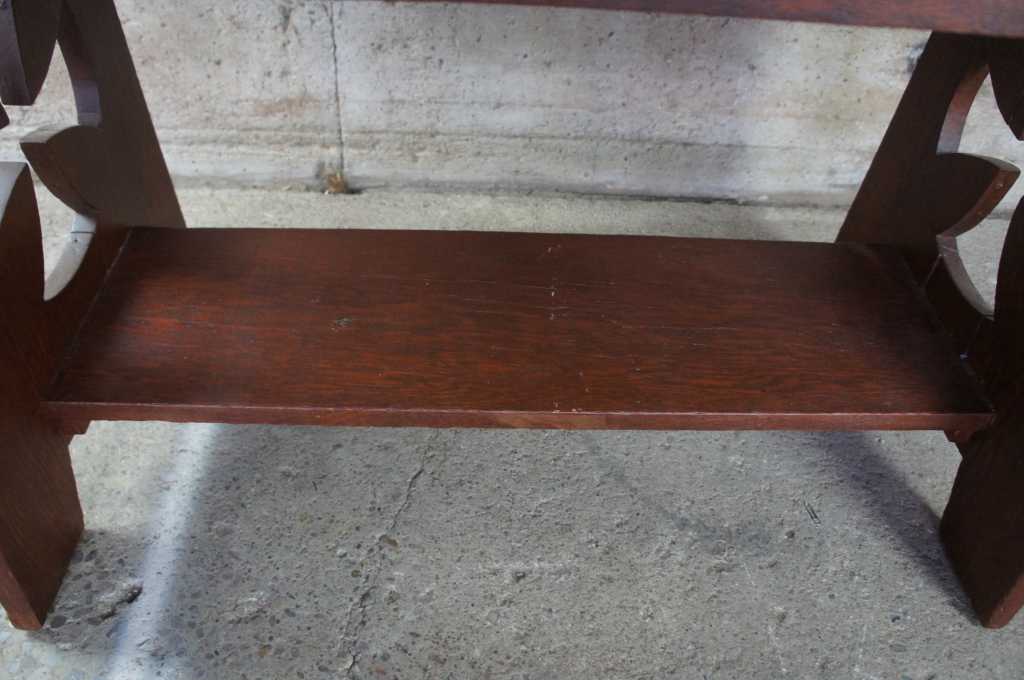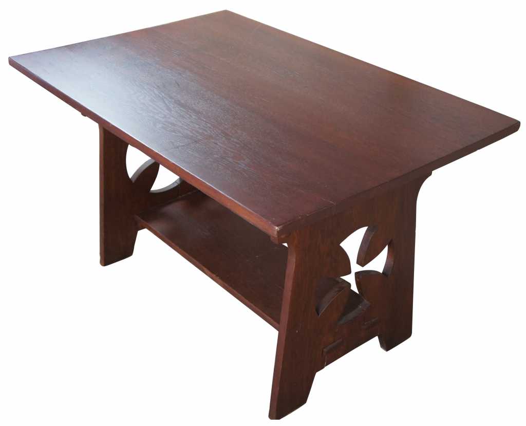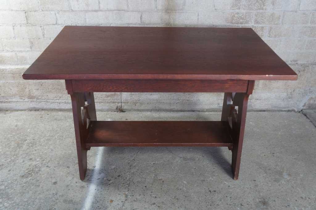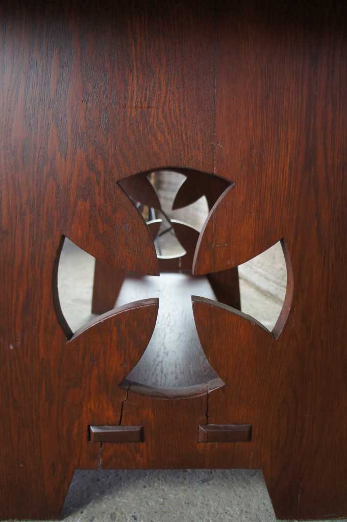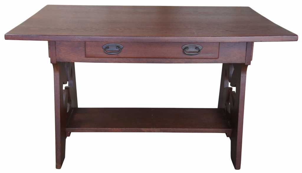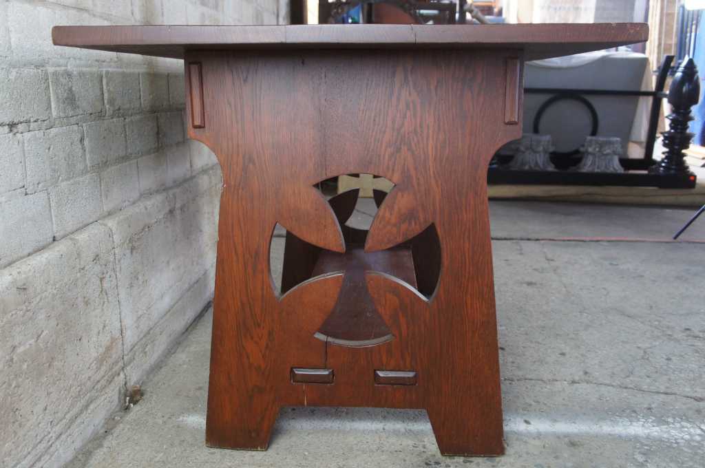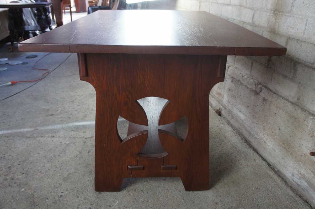 Circa 1908 library table. Made from oak using mortise and tenon joints in arts and crafts style. Features a trestle base with pierced Maltese or Celtic Crosses along the sides. Desk includes one central drawer.