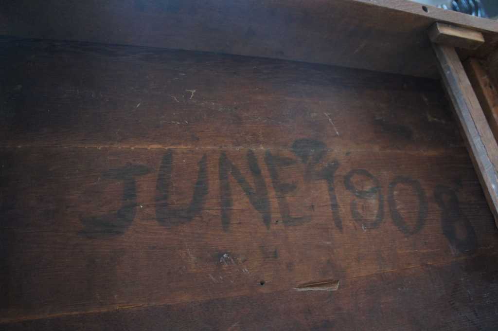 Good antique condition, Splits along sides near mortise and tenon, some surface wear to top, very slight bow to top