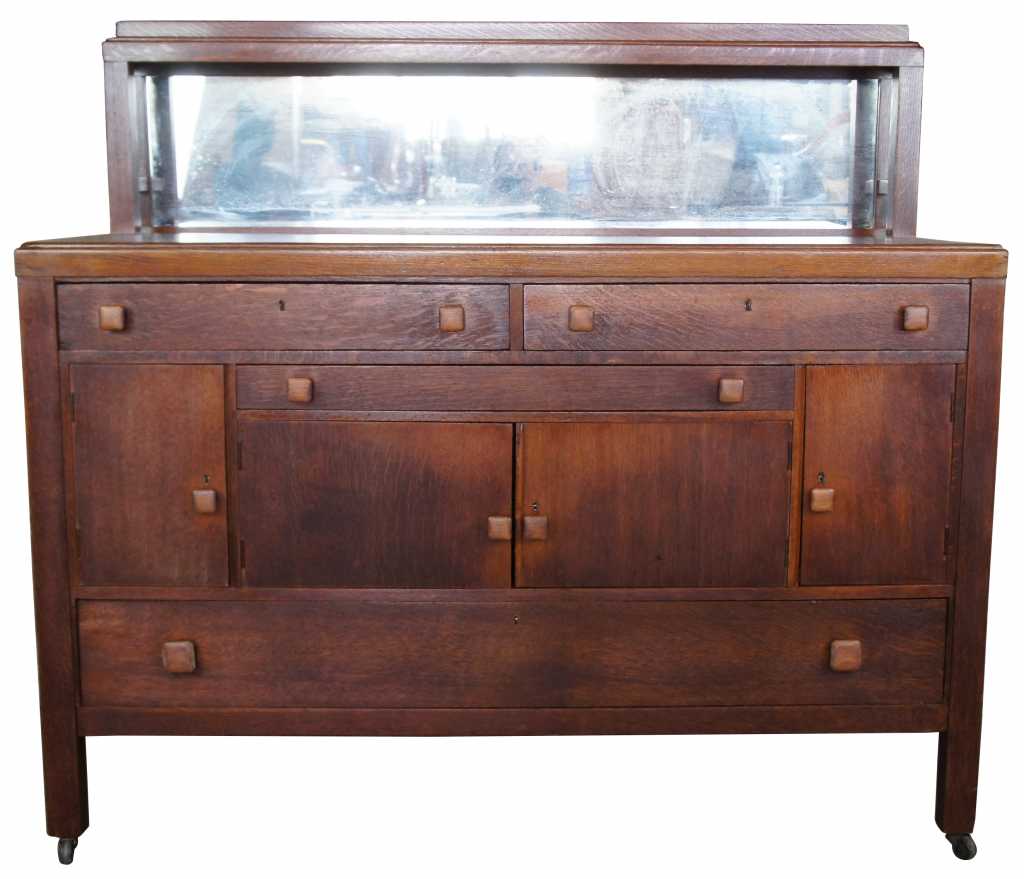 Early 1900s mission quartersawn oak sideboard. A large and stately buffet, featuring four large drawers and three cabinets for storage. Includes a backsplash with mirror and castors for ease of movement and square pulls for knobs.