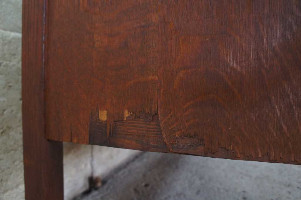 Good antique condition. Some veneer loss to lower left side, split in trim panel on middle cabinet drawer, gap between middle drawers, wear and distressing commensurate with age