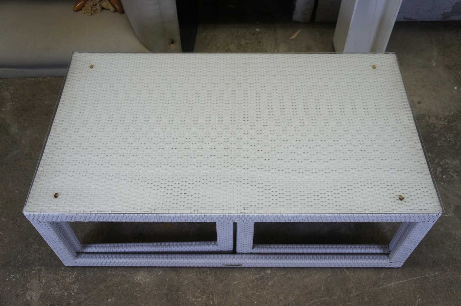 Palermo Nesting glass-overlay coffee table set. Features three piece; two small square tables neatly tuck below the rectangular coffee table. All three tables are wrapped in wicker, feature sleigh legs, glass top.