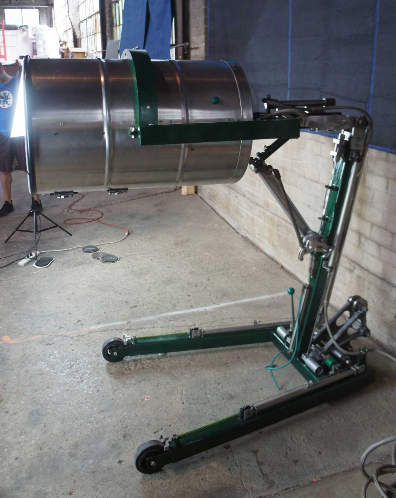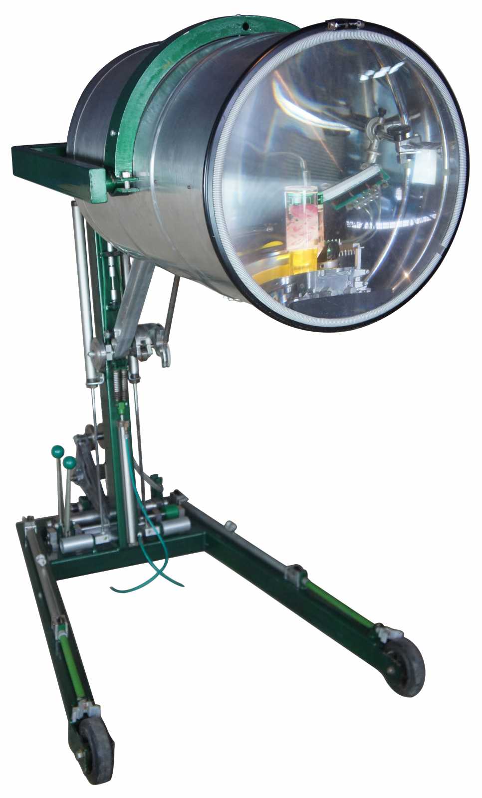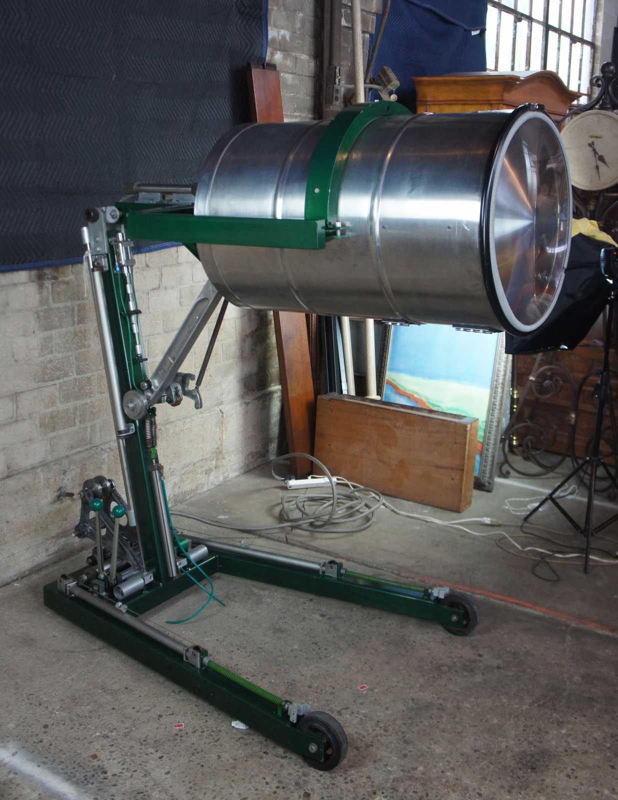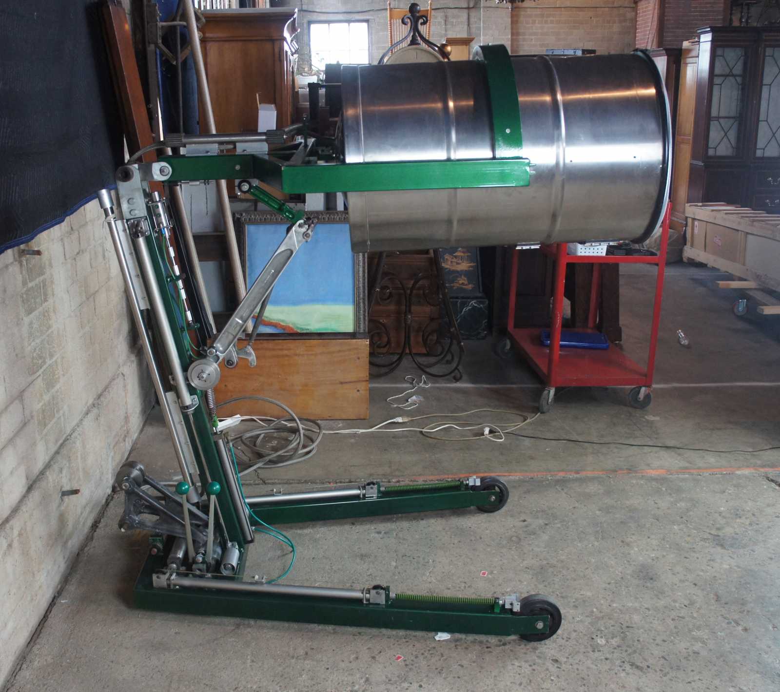 TODT lifesize art installation sculpture, titled Barrel Lift, 1993. One of a kind art sculpture by TODT. Features a green barrel lift with metal drum. If you plug it in and look through the drum, you will find a sci-fi scene complete with test tube alien remains / replicas and illuminated crosshair. For more than thirty years TODT has created provocative and challenging installations that focus on the historical, social and political implications of the present. Originally based in New York City, the collective relocated to Cincinnati in the mid-eighties to, ""expand and establish a more centralized studio and materials supply source."" Their mid-west base of operations has proven bountiful providing a wealth of raw materials that serve as the components of the hybrid constructions they create. TODT refers to their collaborative process as one that is ""based on anomaly and anonymous accumulation."" ""TODT is an architecture that continues to explore the immediate experiences of history, sexuality, mimicry, and modern angst. It is an art of structural perceptions – one which regards the object as the realism of ourselves.""