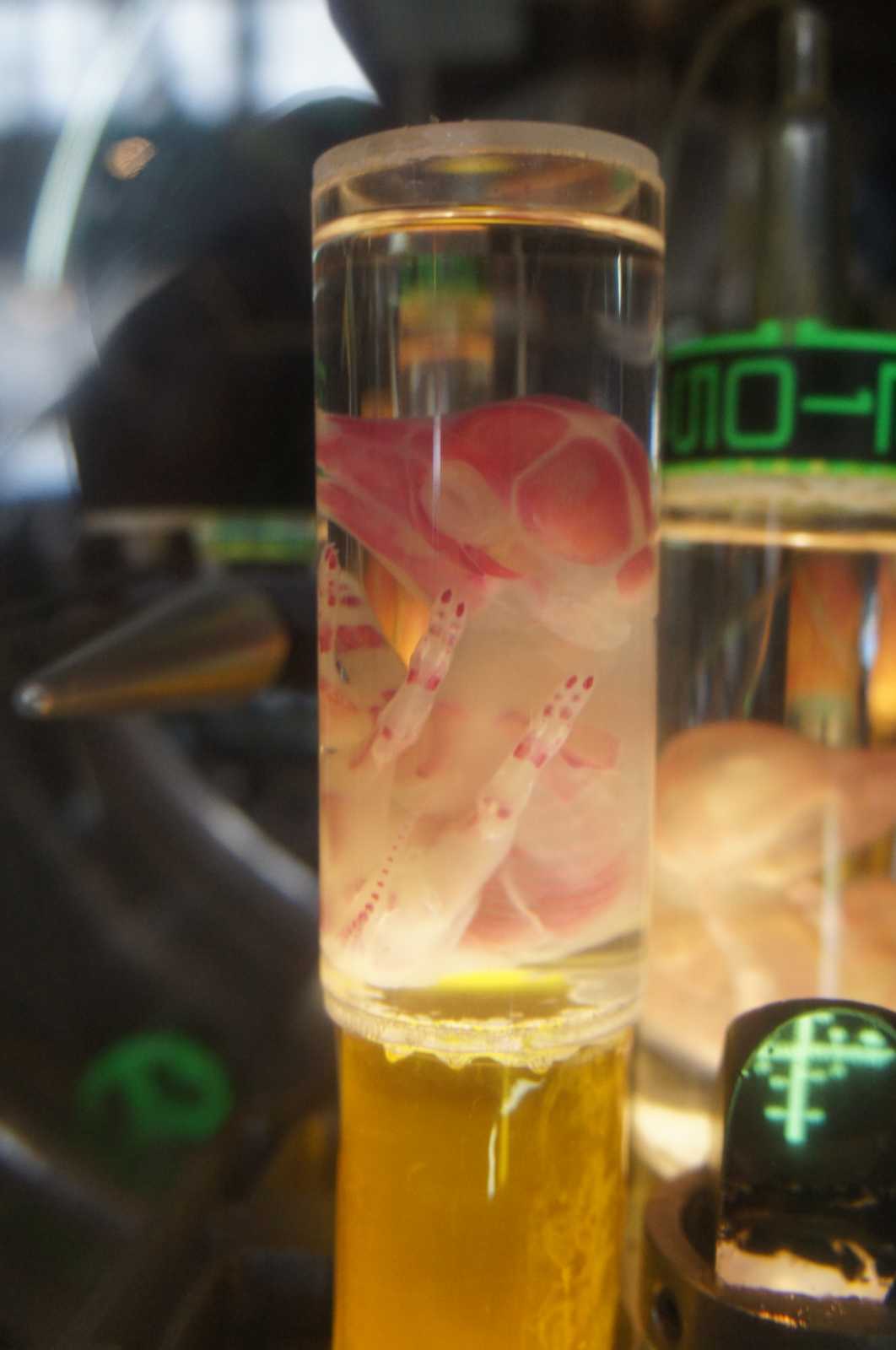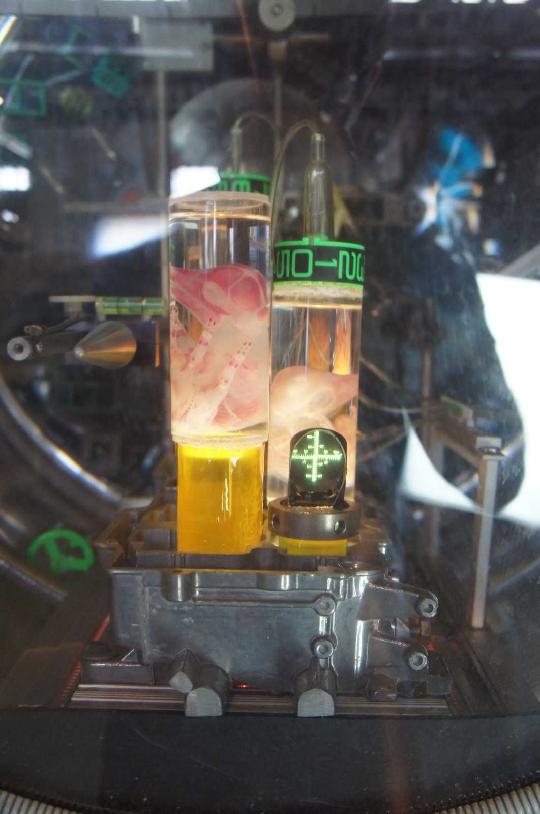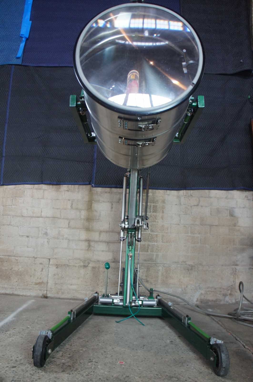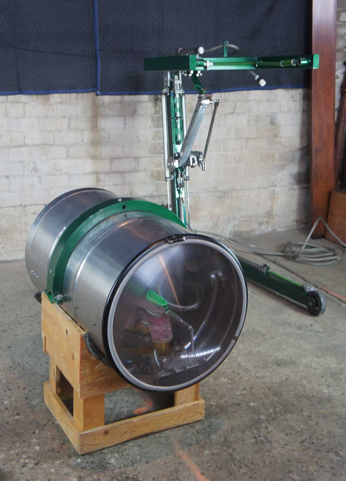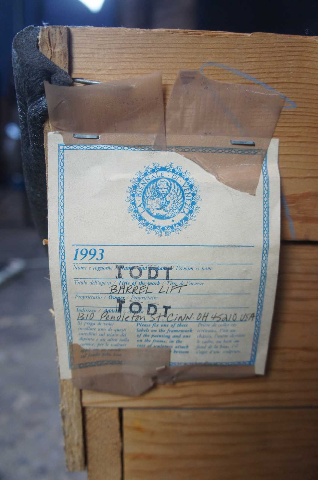 TODT lifesize art installation sculpture, titled Barrel Lift, 1993. One of a kind art sculpture by TODT. Features a green barrel lift with metal drum. If you plug it in and look through the drum, you will find a sci-fi scene complete with test tube alien remains / replicas and illuminated crosshair. For more than thirty years TODT has created provocative and challenging installations that focus on the historical, social and political implications of the present. Originally based in New York City, the collective relocated to Cincinnati in the mid-eighties to, ""expand and establish a more centralized studio and materials supply source."" Their mid-west base of operations has proven bountiful providing a wealth of raw materials that serve as the components of the hybrid constructions they create. TODT refers to their collaborative process as one that is ""based on anomaly and anonymous accumulation."" ""TODT is an architecture that continues to explore the immediate experiences of history, sexuality, mimicry, and modern angst. It is an art of structural perceptions – one which regards the object as the realism of ourselves.""