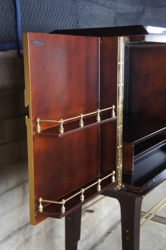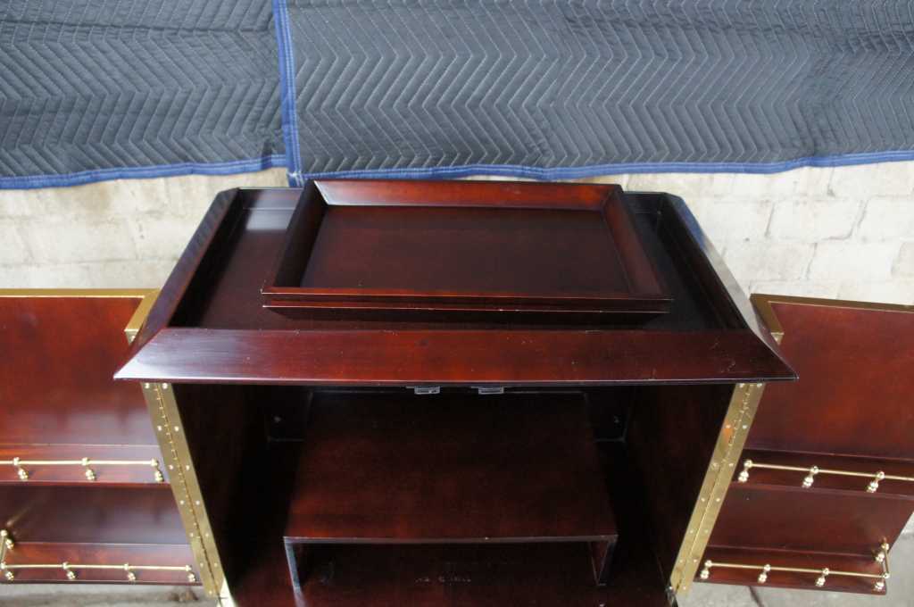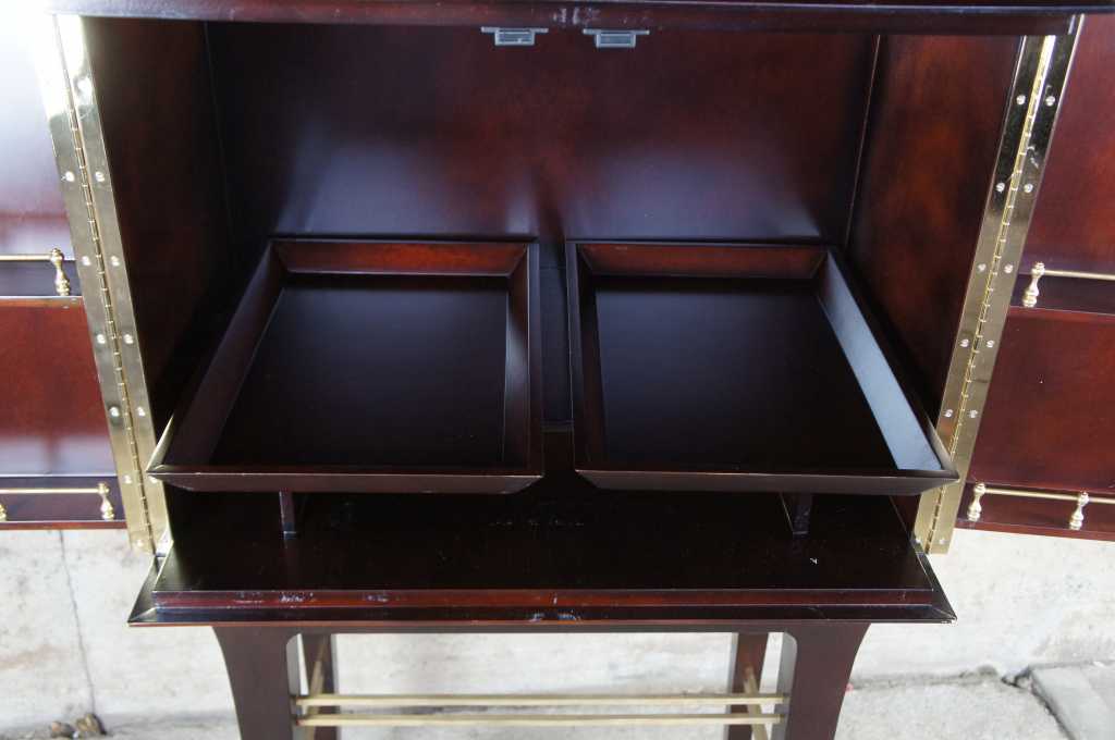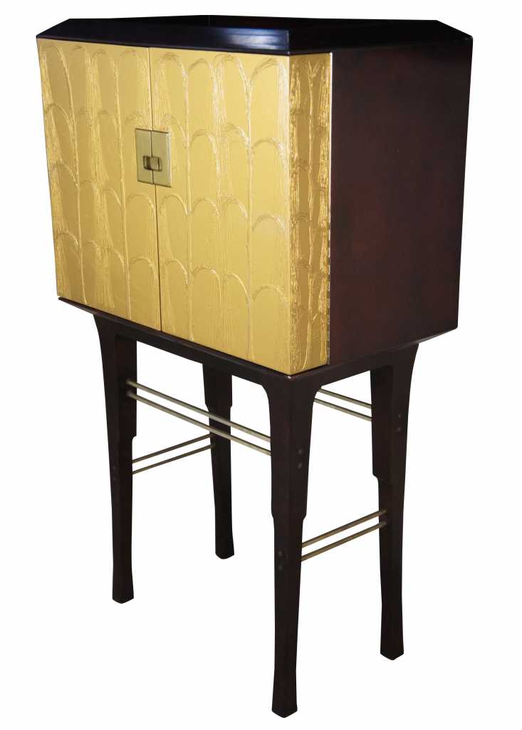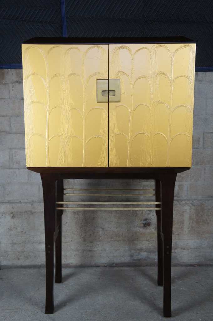 A lovely transitional dry bar cabinet. Styled after Bill Sofield for Baker Furniture 4070 Kiosk Butlers Cabinet. Features a low relief gold toned arched design along front. Opens to a serving station with space for liquor and glasses as well as serving trays.