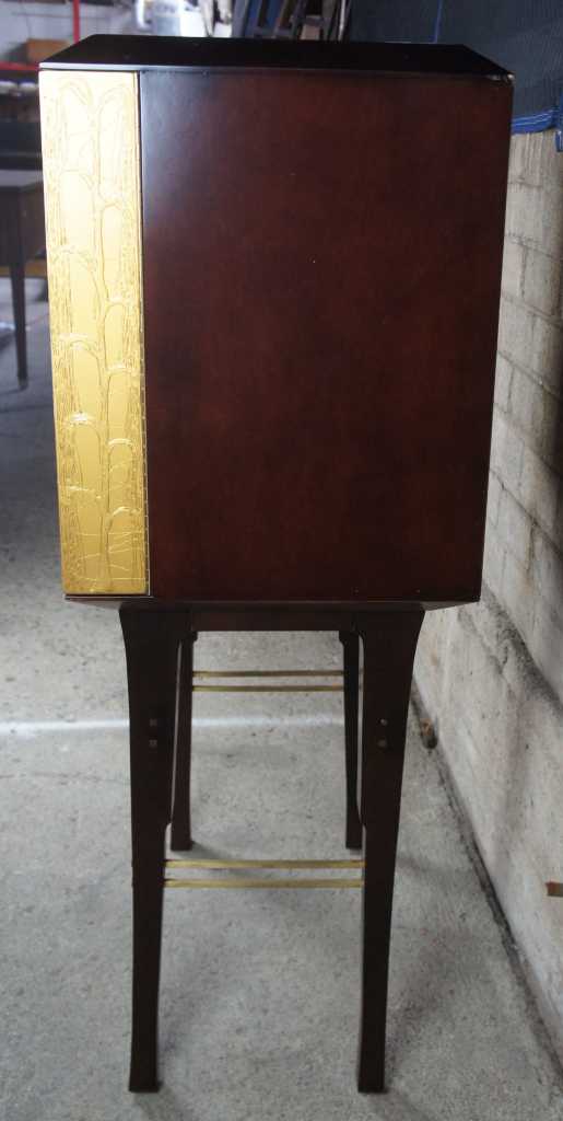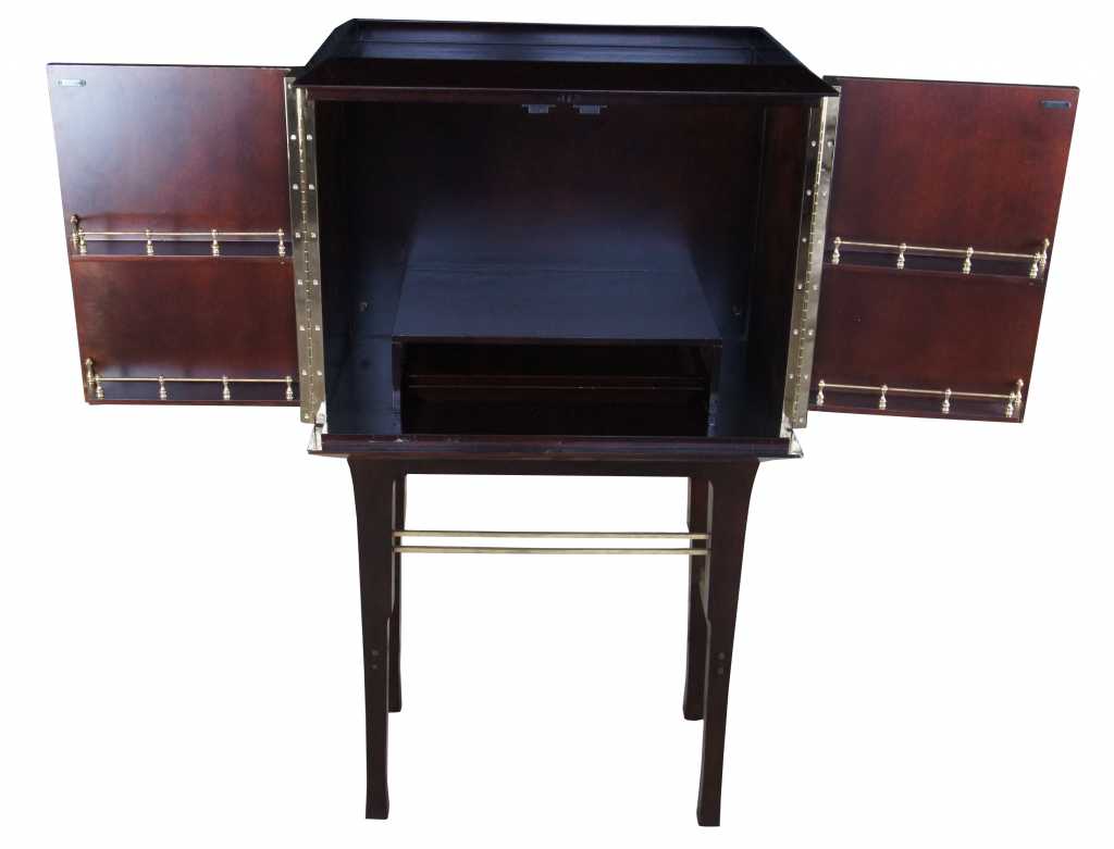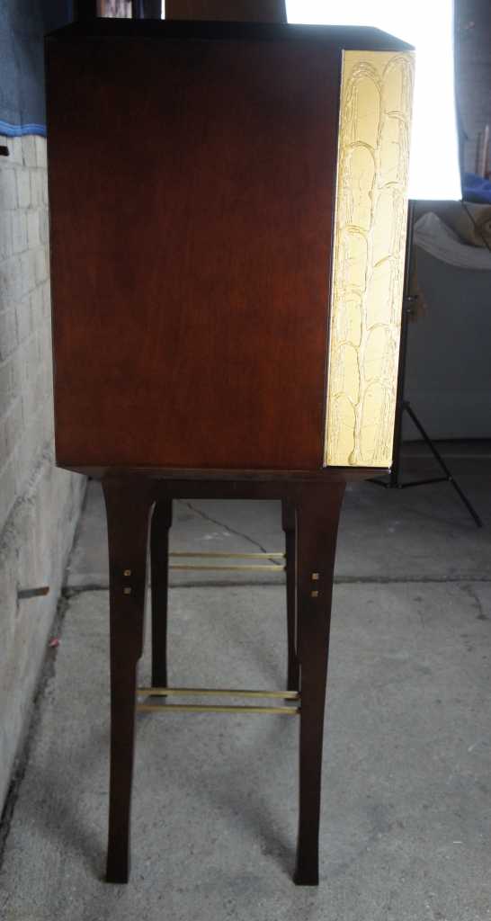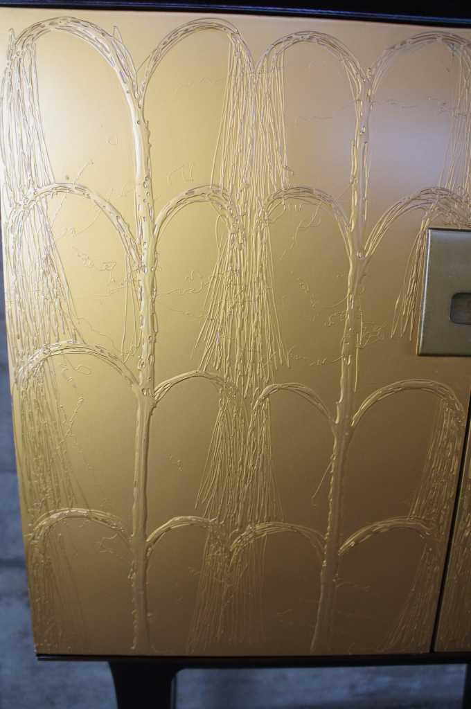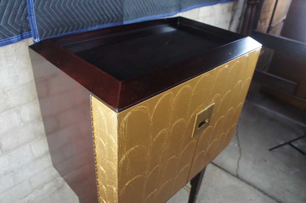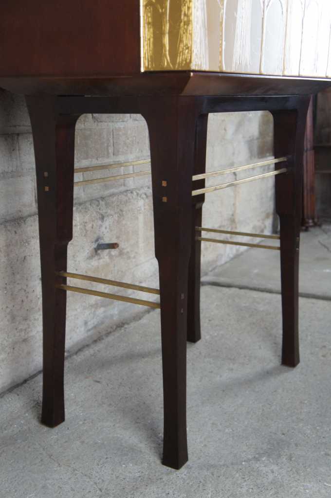 A lovely transitional dry bar cabinet. Styled after Bill Sofield for Baker Furniture 4070 Kiosk Butlers Cabinet. Features a low relief gold toned arched design along front. Opens to a serving station with space for liquor and glasses as well as serving trays.
