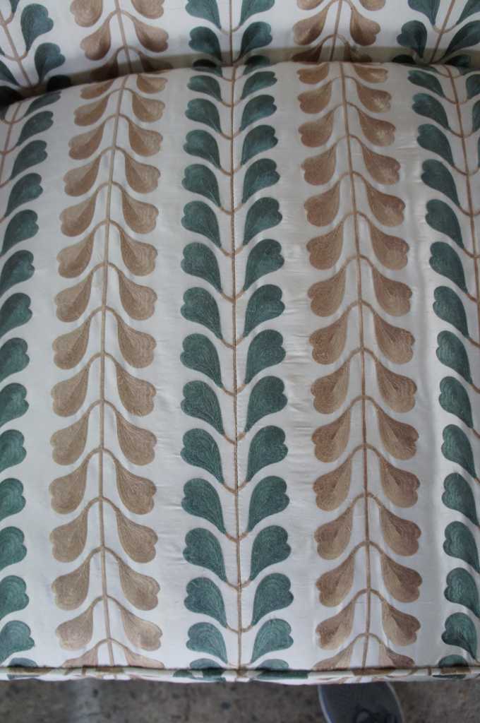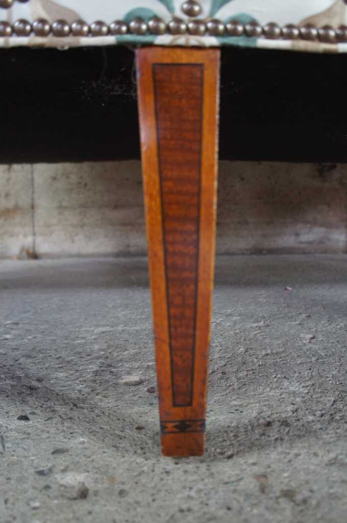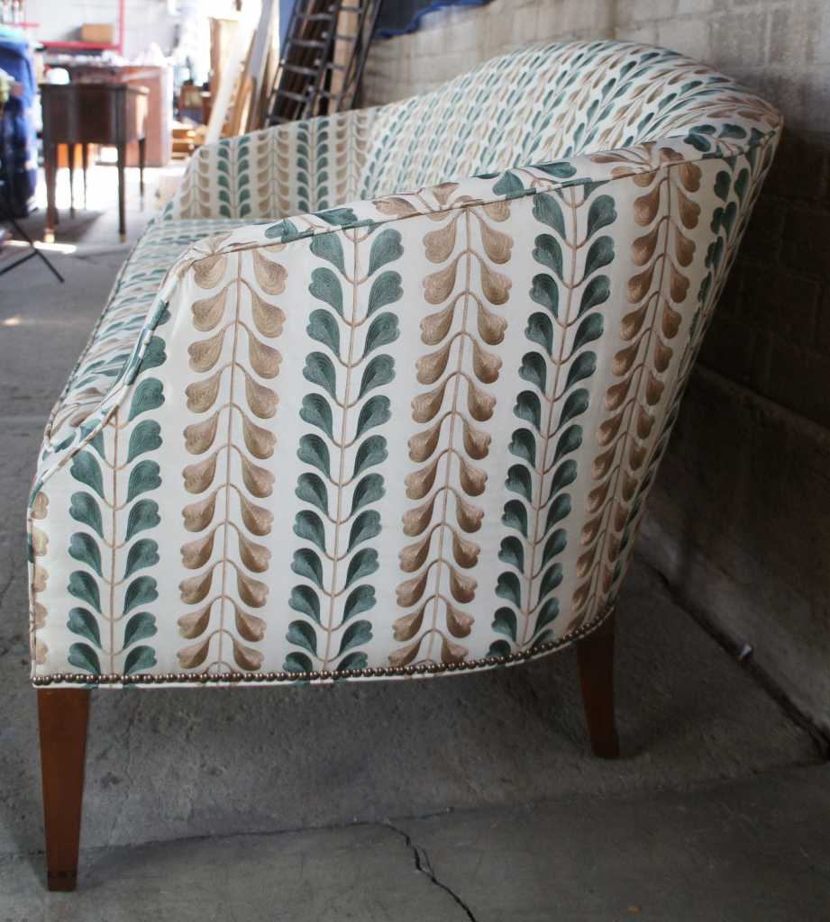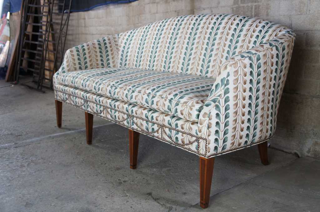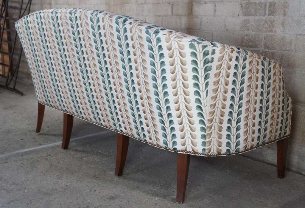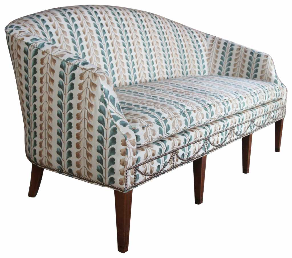 Early Kittinger Bowback sofa in hepplewhite style. Upholstered in Osborn & Little earthy green and gold fabric with nailhead trim. Made from mahogany with tapered and inlaid legs. The graceful lines rely on a subtle sophisticated form which is not overpowering, but beautifully shaped with rear legs that have a very nice outward cant. Note the delicately arched back, which continues to roll down through to the end of the arms, which then turn in to the seat frame.