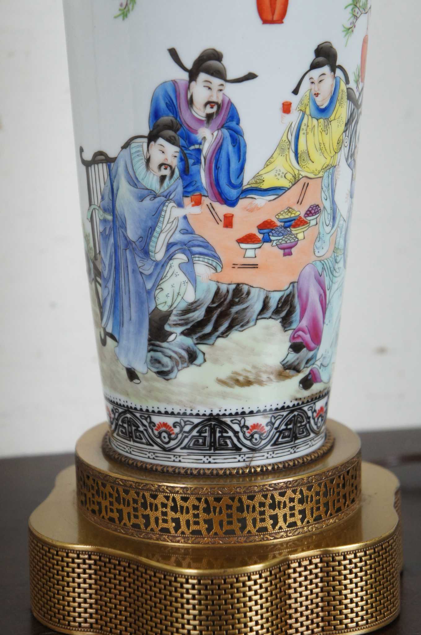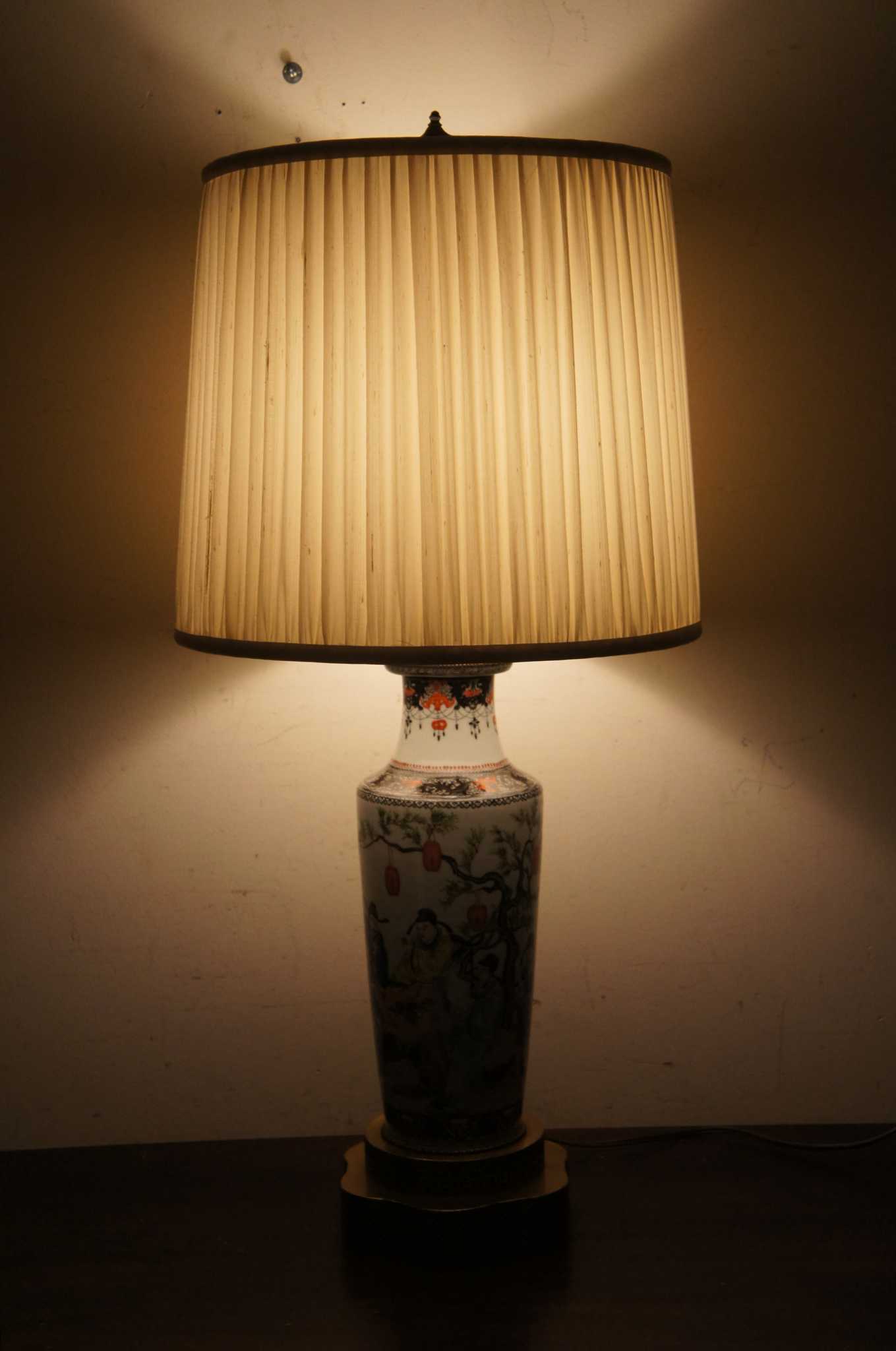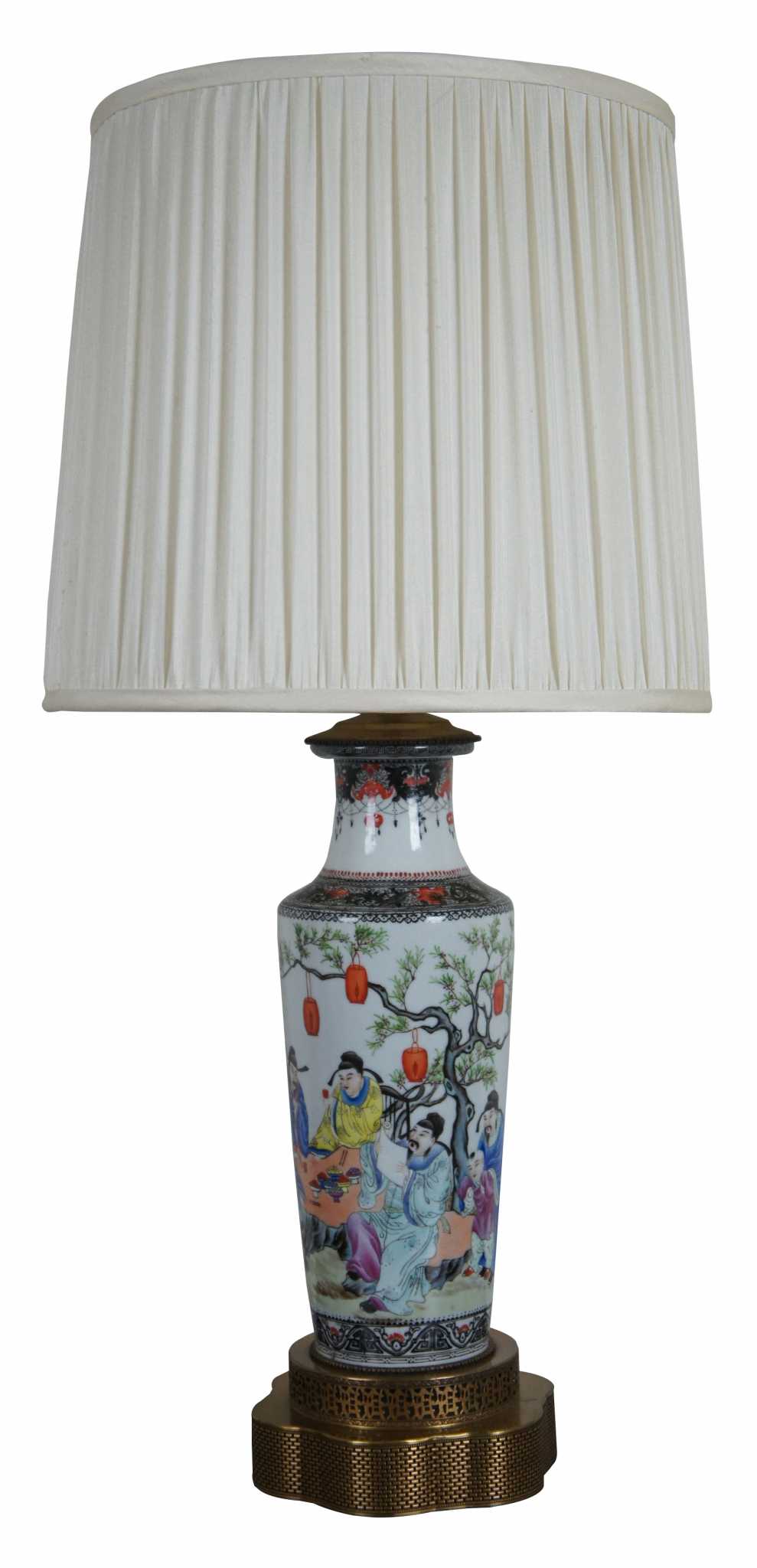 20th century Satsuma vase lamp. Features a porcelain vase on pierced scalloped shape brass base with pleated shade with pagoda shaped finial. Vase is hand painted with a dinner scene showing a family beneath a cherry blossom tree.