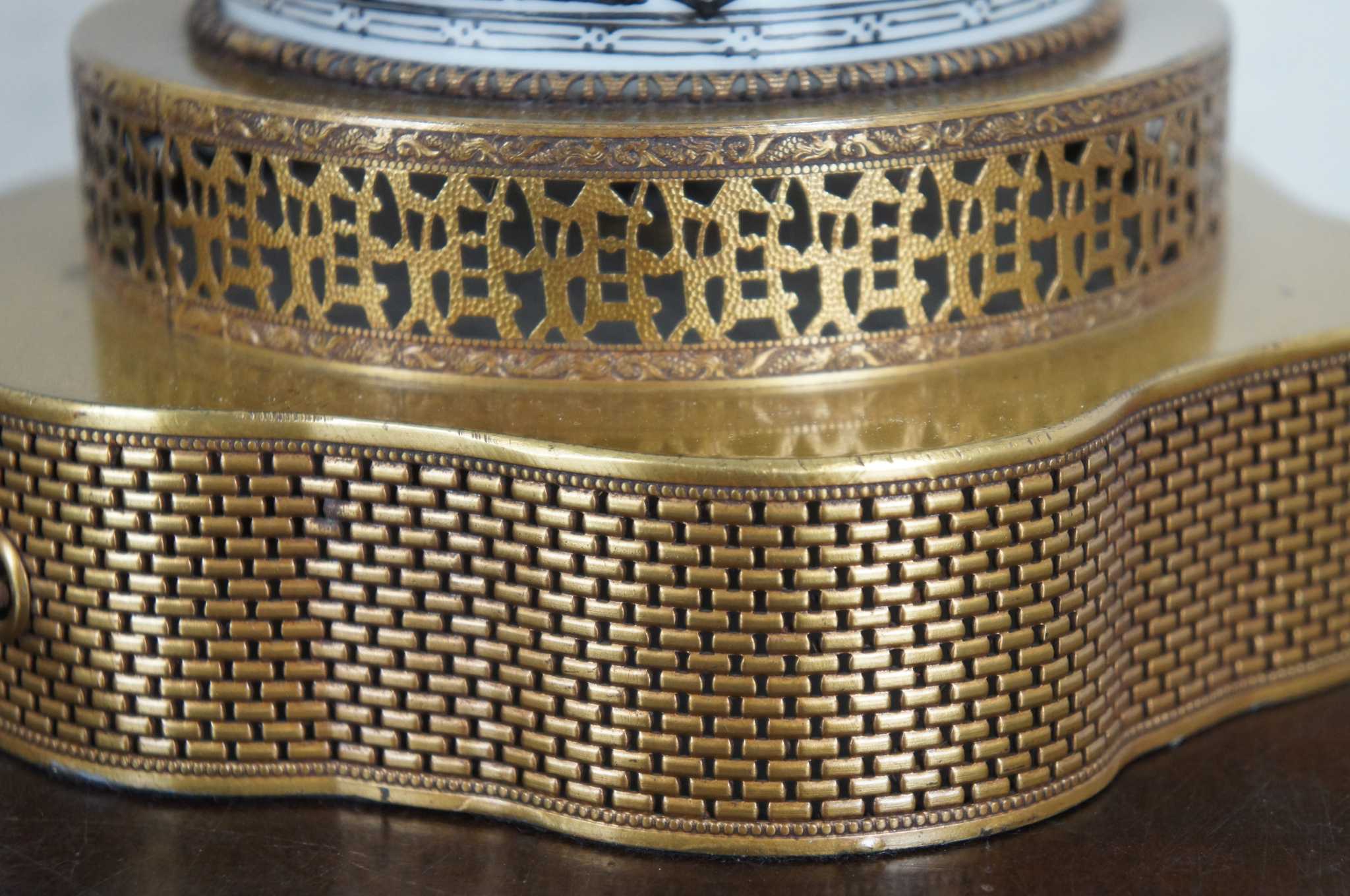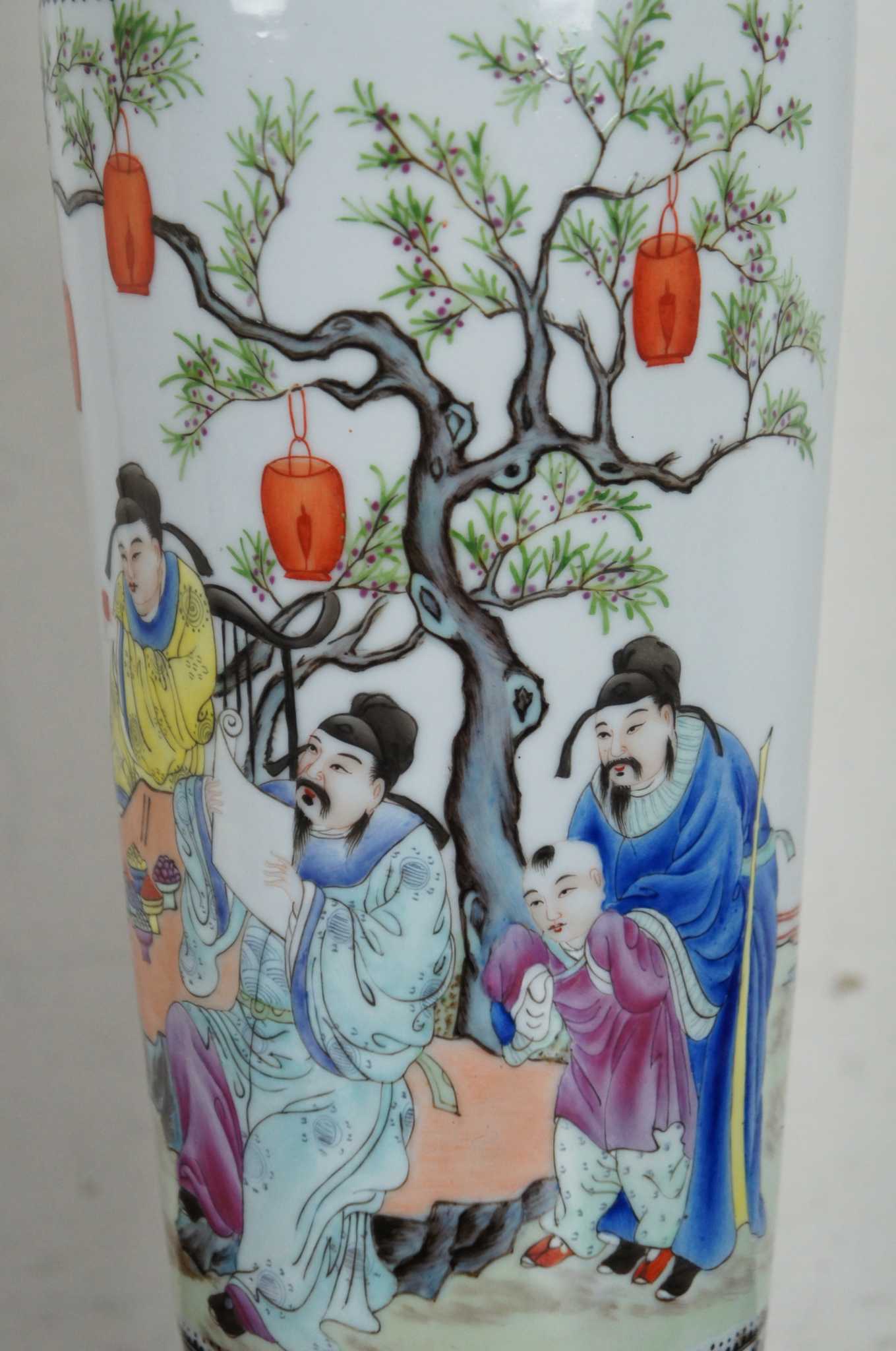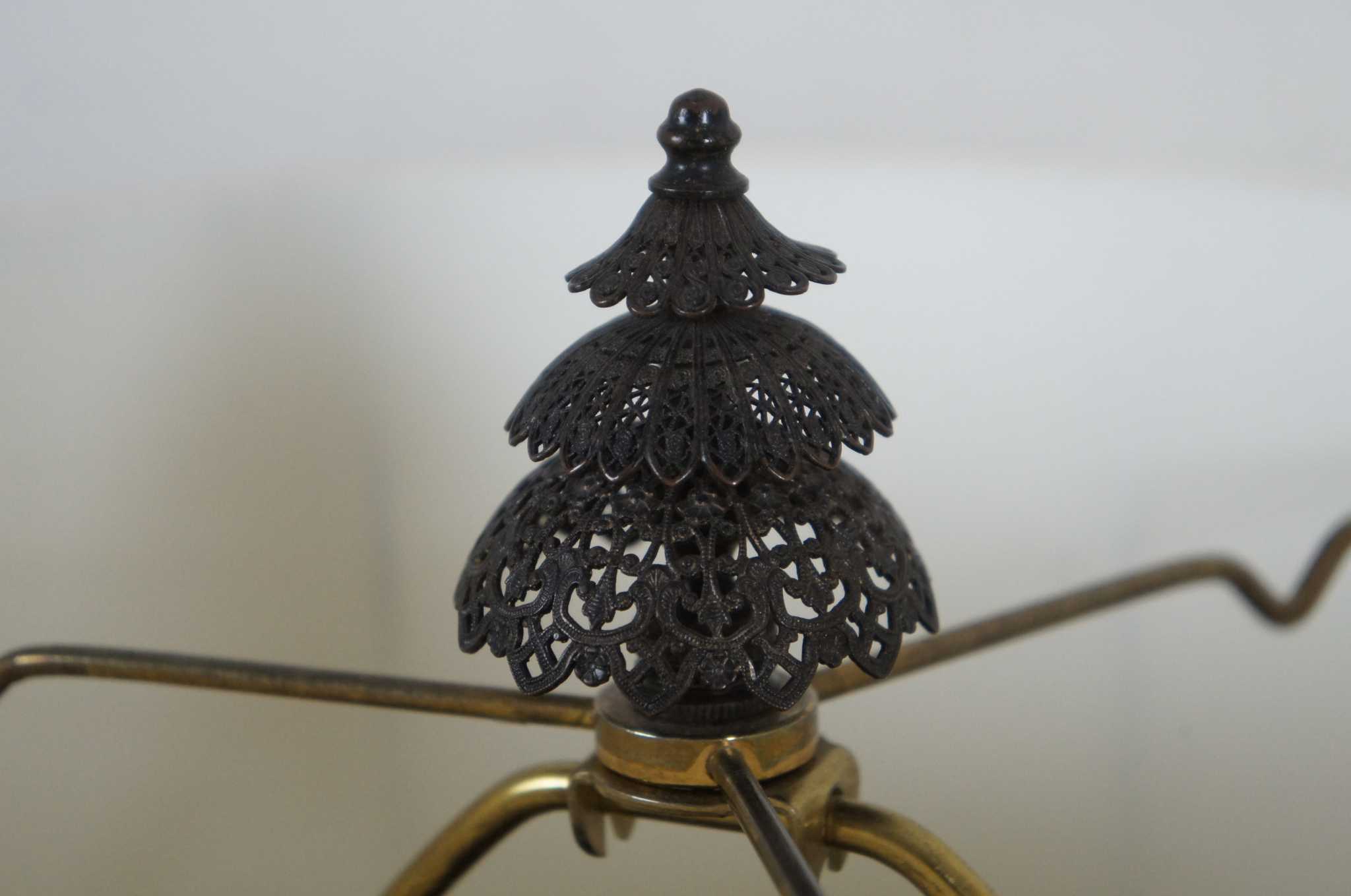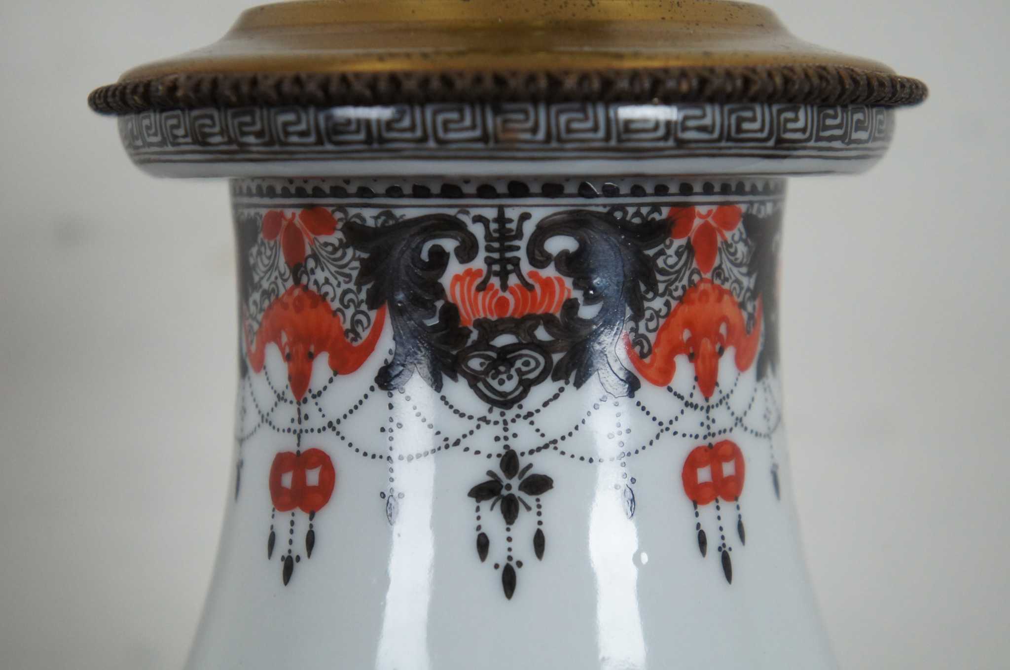20th century Satsuma vase lamp. Features a porcelain vase on pierced scalloped shape brass base with pleated shade with pagoda shaped finial. Vase is hand painted with a dinner scene showing a family beneath a cherry blossom tree.