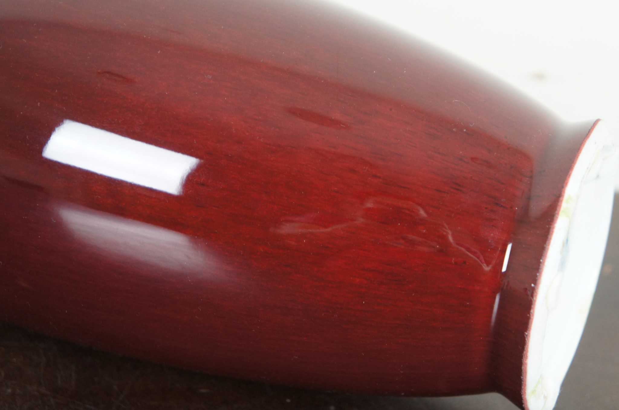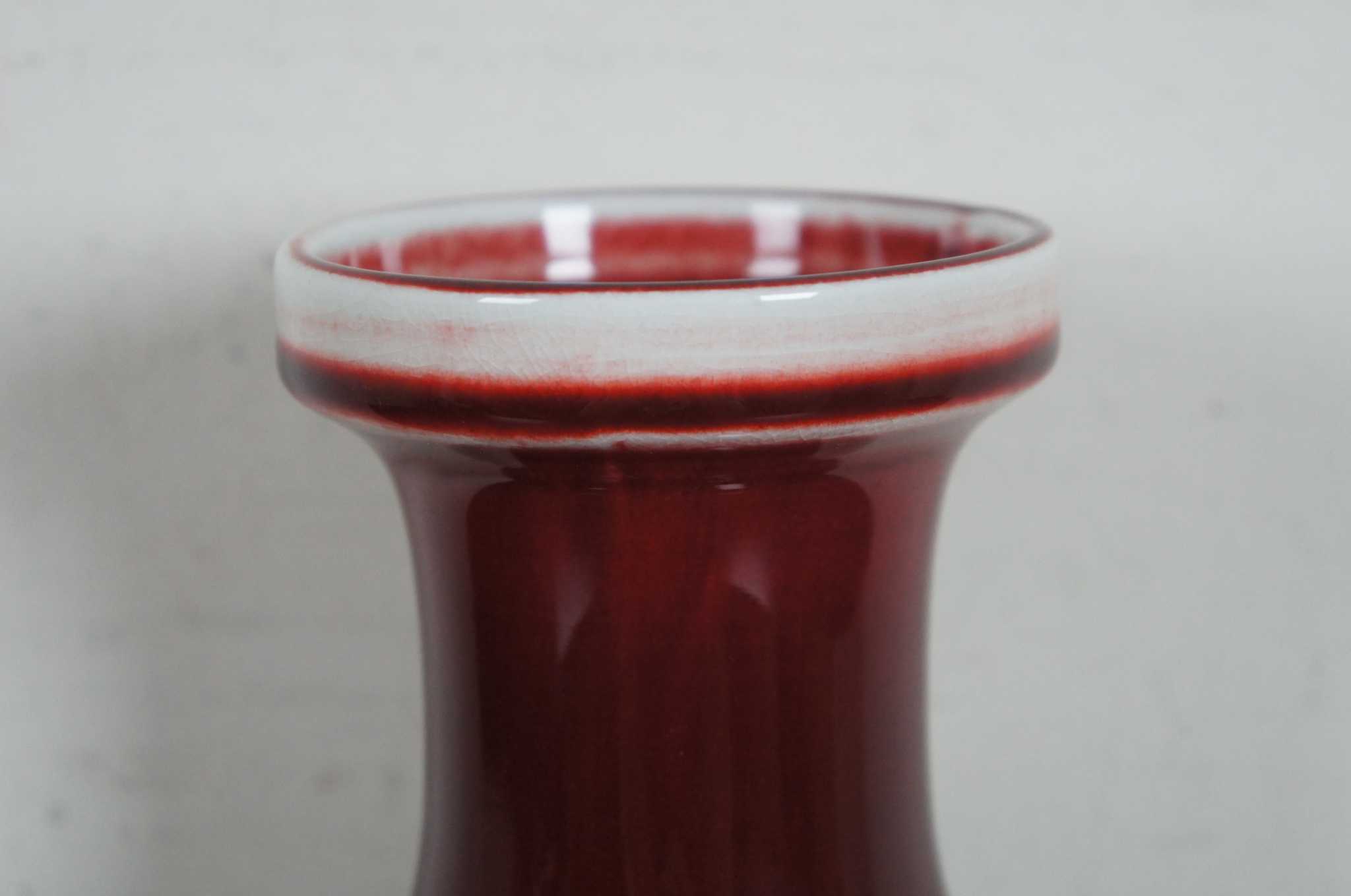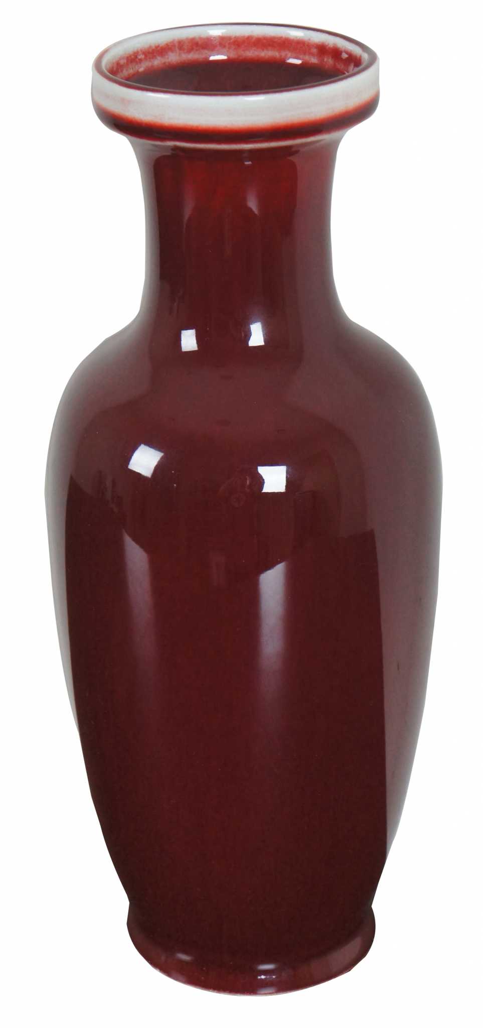 Vintage Chinese Sang de Boeuf glazed porcelain vase. Sang de Boeuf, aka Flambe glaze, is a rich and glossy blood red glaze produced by a method that incorporates copper oxide as a coloring agent and firing in a reducing atmosphere, a method first discovered during the Ming dynasty (1368 - 1644). The technique was perfected during the Qing dynasty (1644 - 1911), and particularly so during the reign of K'ang Hsi (or Kangxi), when some of the finest pieces of sang de boeuf were created. This piece dates to the early 20th century.