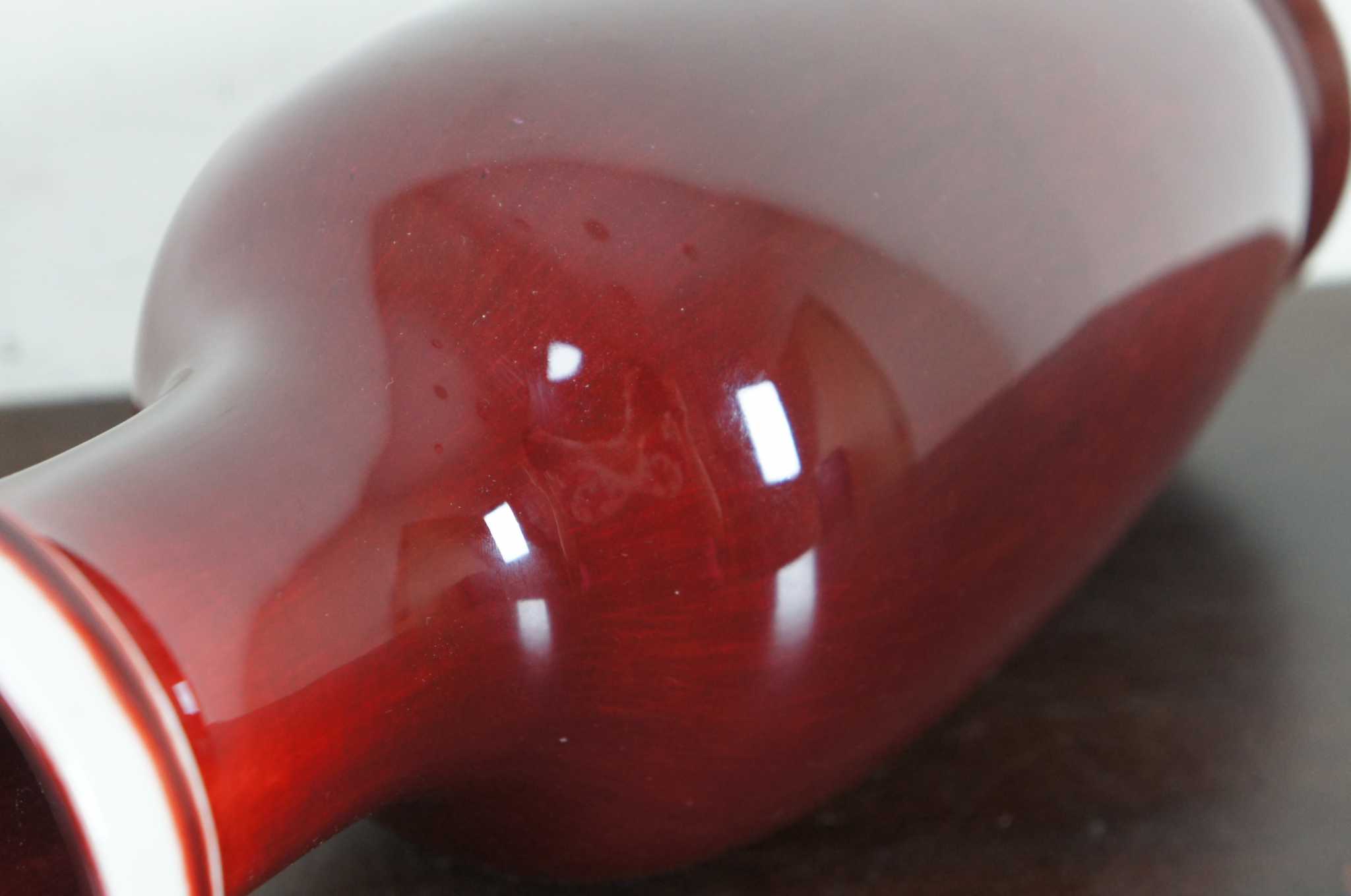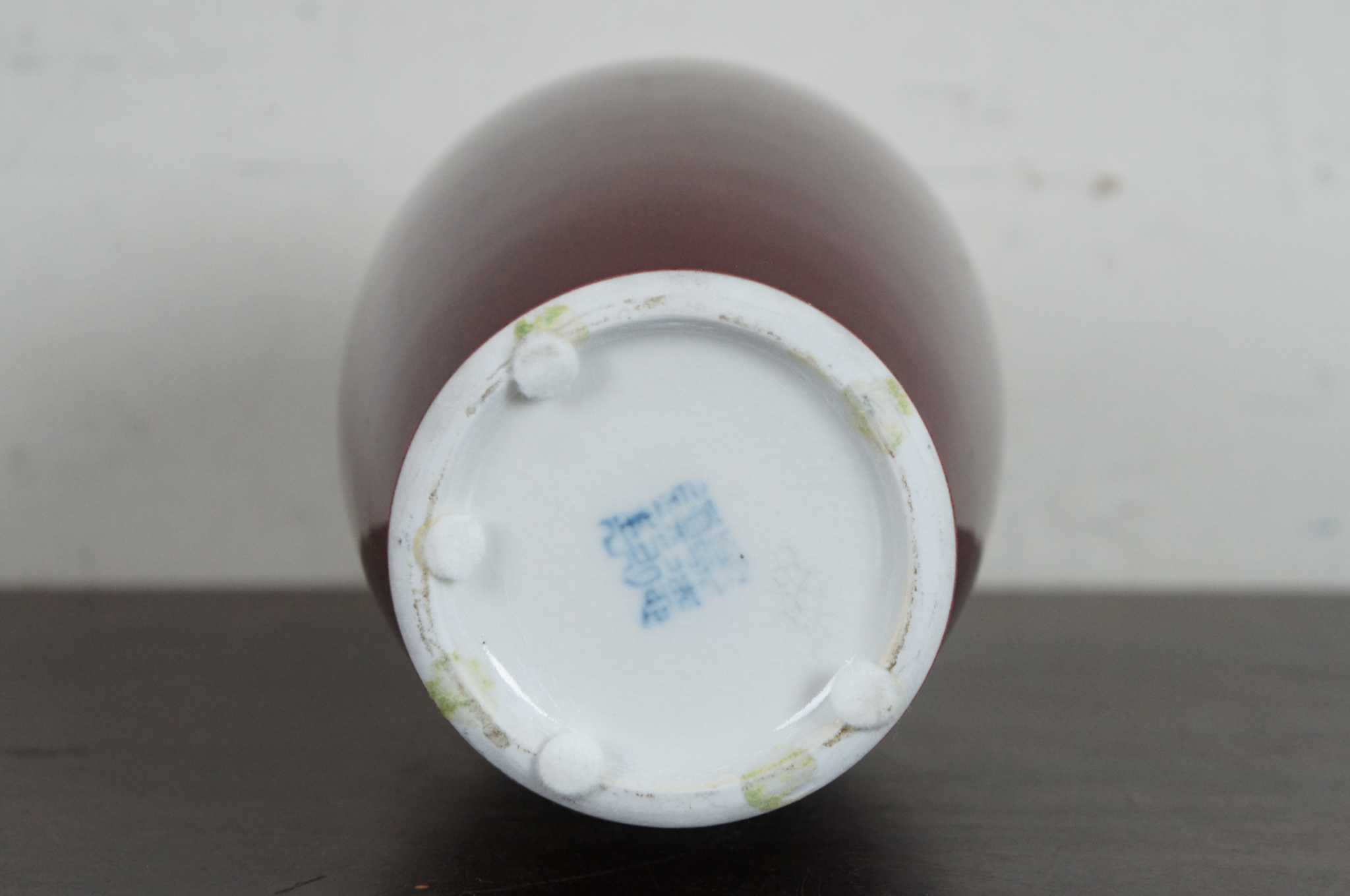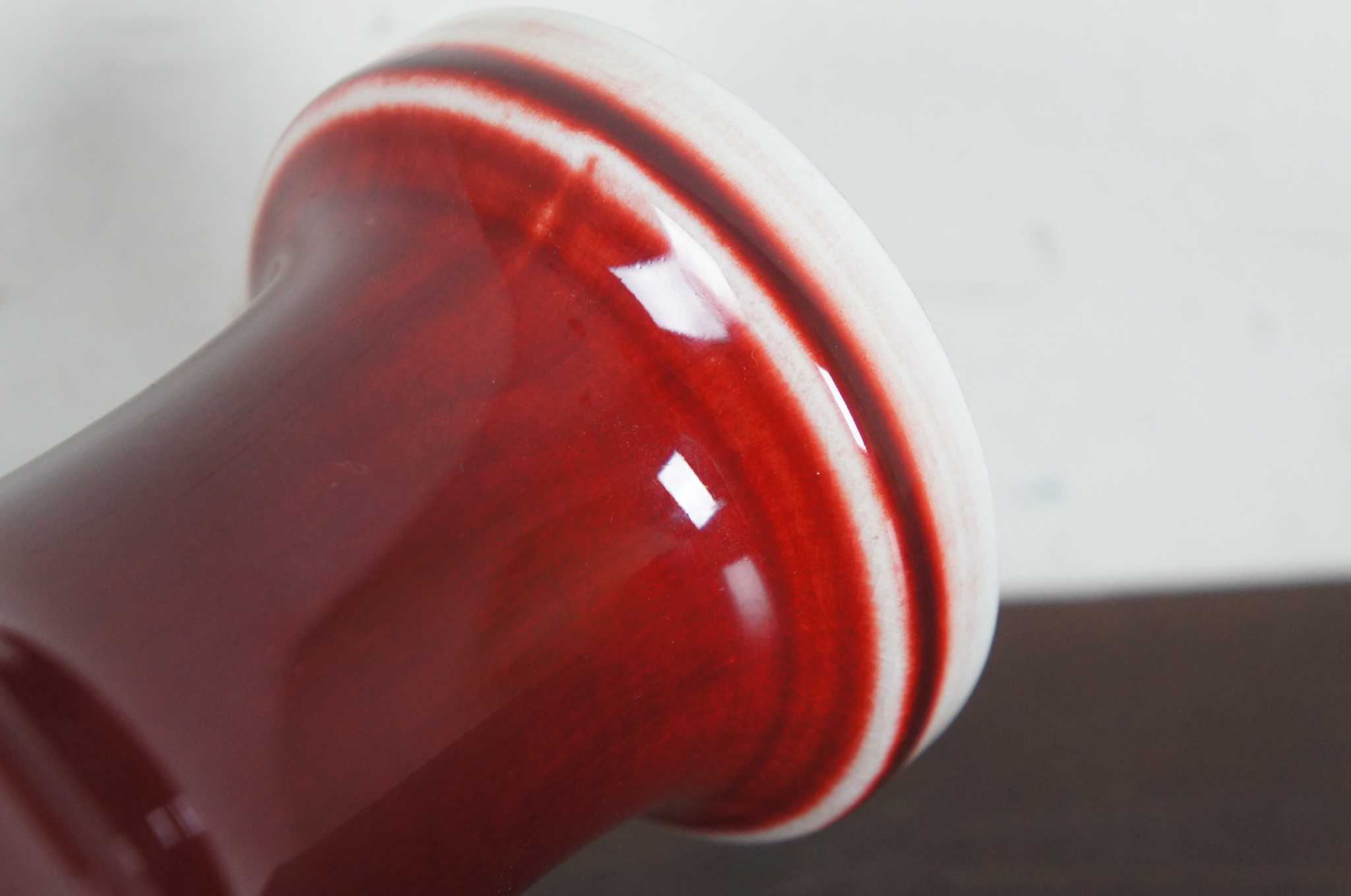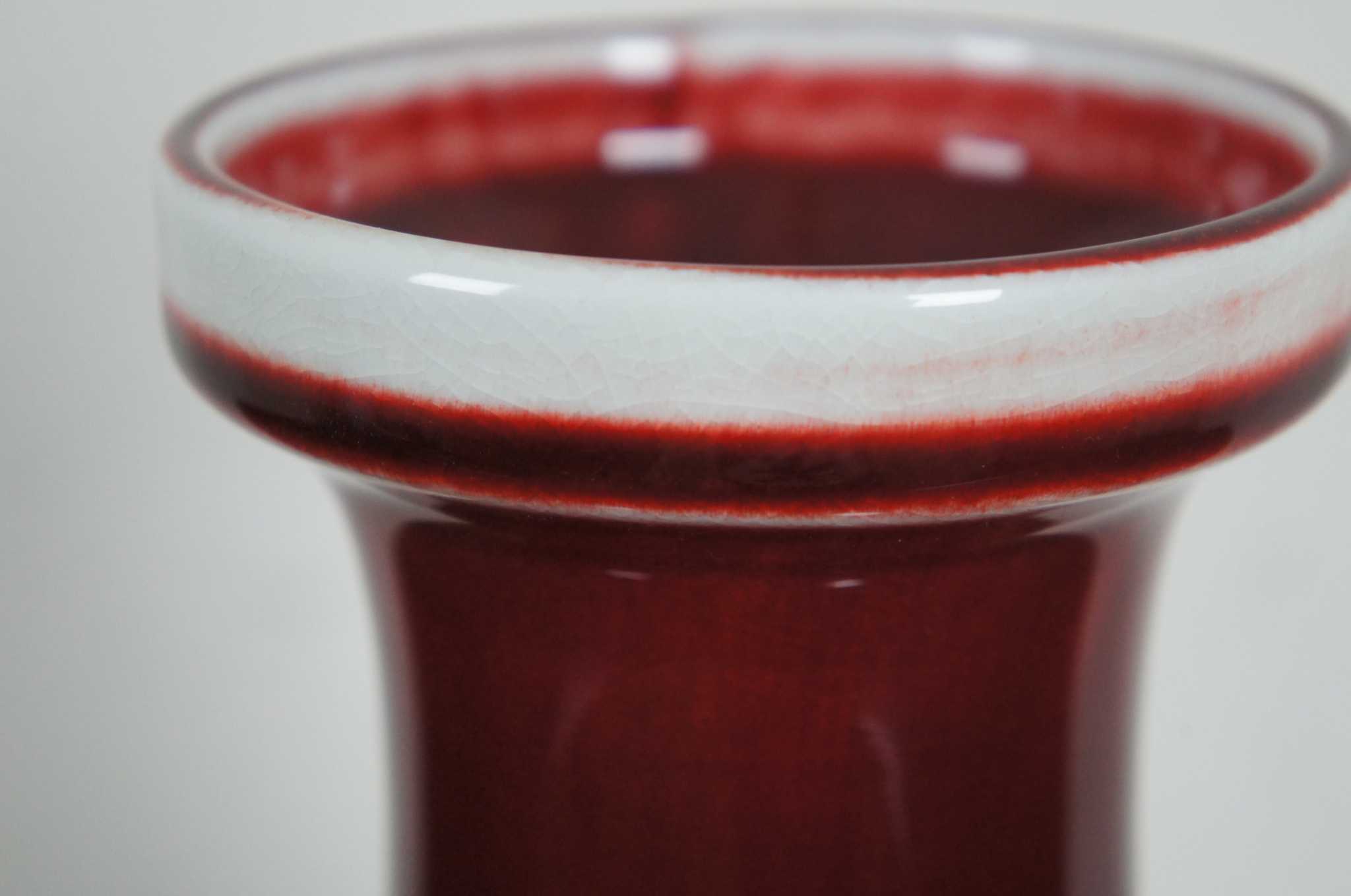 Vintage Chinese Sang de Boeuf glazed porcelain vase. Sang de Boeuf, aka Flambe glaze, is a rich and glossy blood red glaze produced by a method that incorporates copper oxide as a coloring agent and firing in a reducing atmosphere, a method first discovered during the Ming dynasty (1368 - 1644). The technique was perfected during the Qing dynasty (1644 - 1911), and particularly so during the reign of K'ang Hsi (or Kangxi), when some of the finest pieces of sang de boeuf were created. This piece dates to the early 20th century.