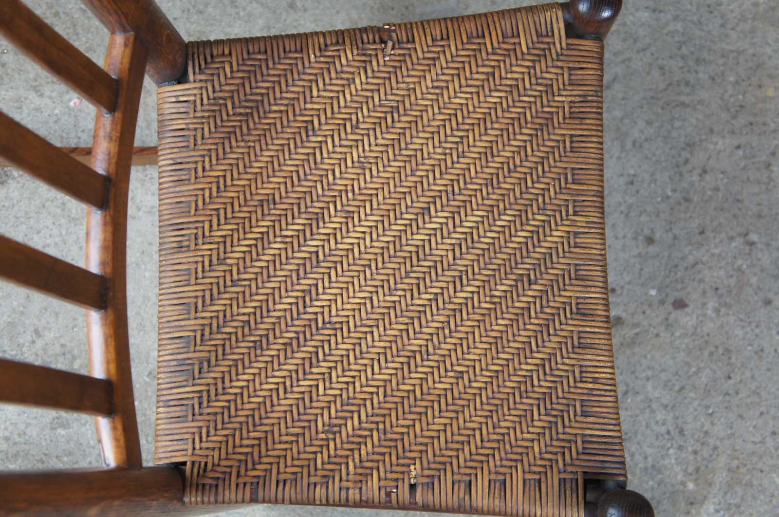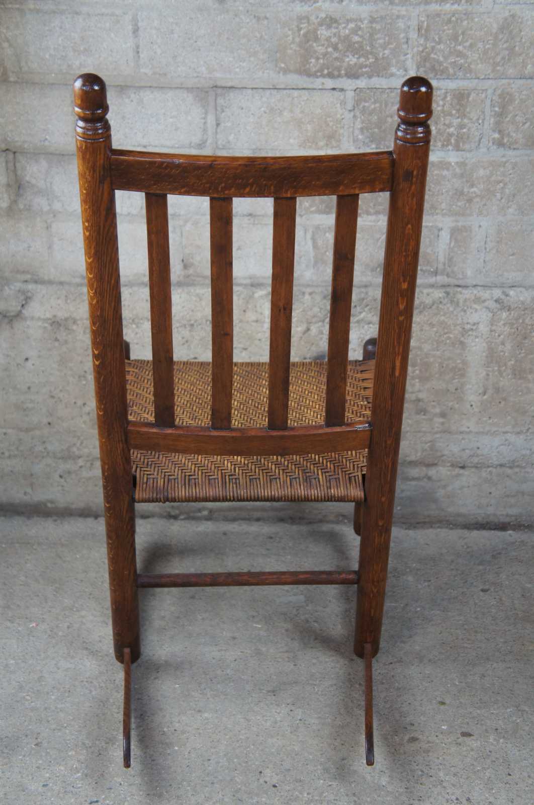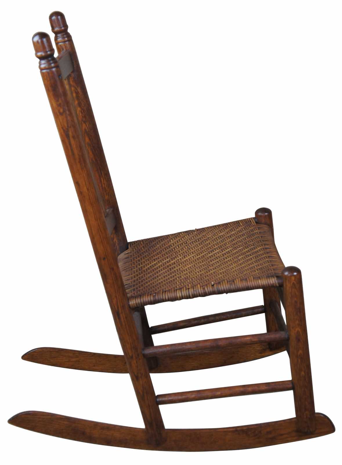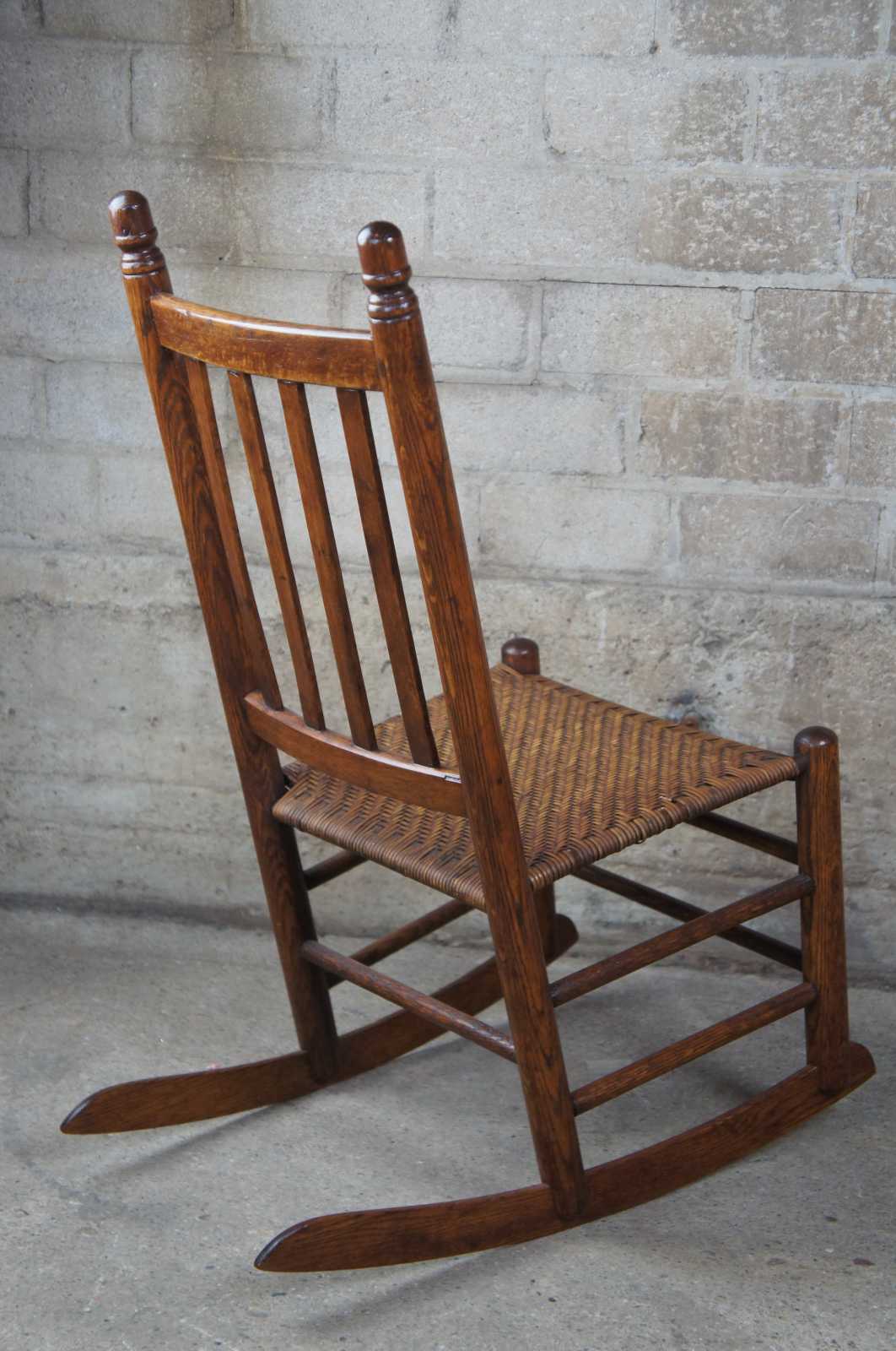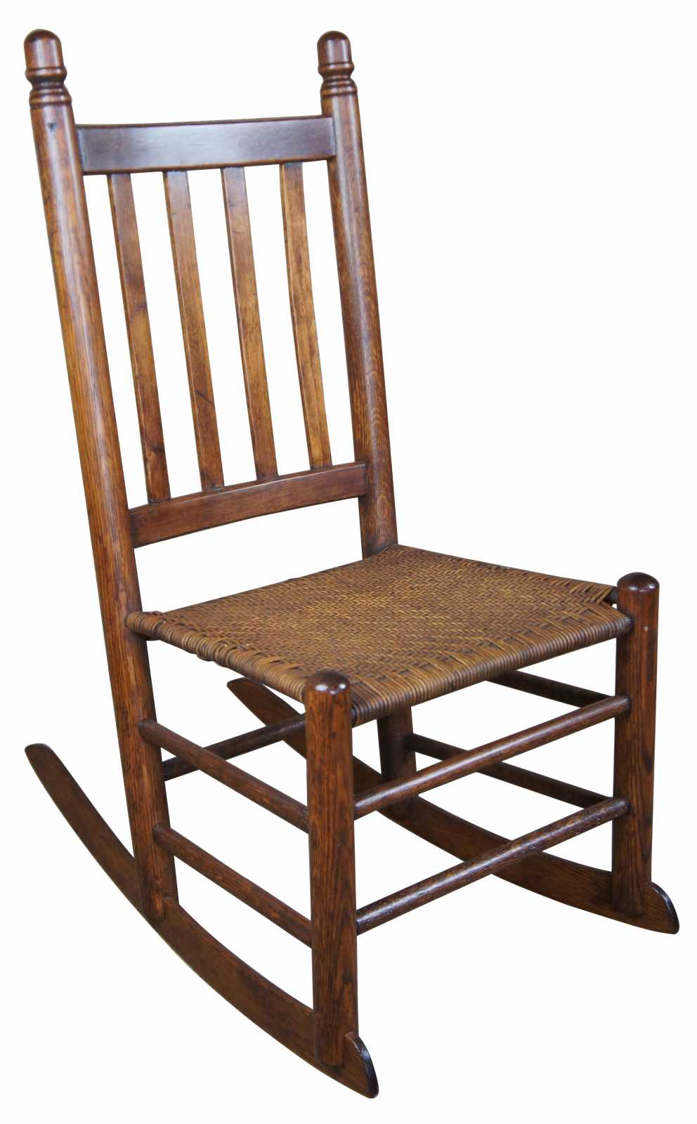 Early 20th century oak rocking chair, features acorn finials, a slat back and rattan / wicker seat.
