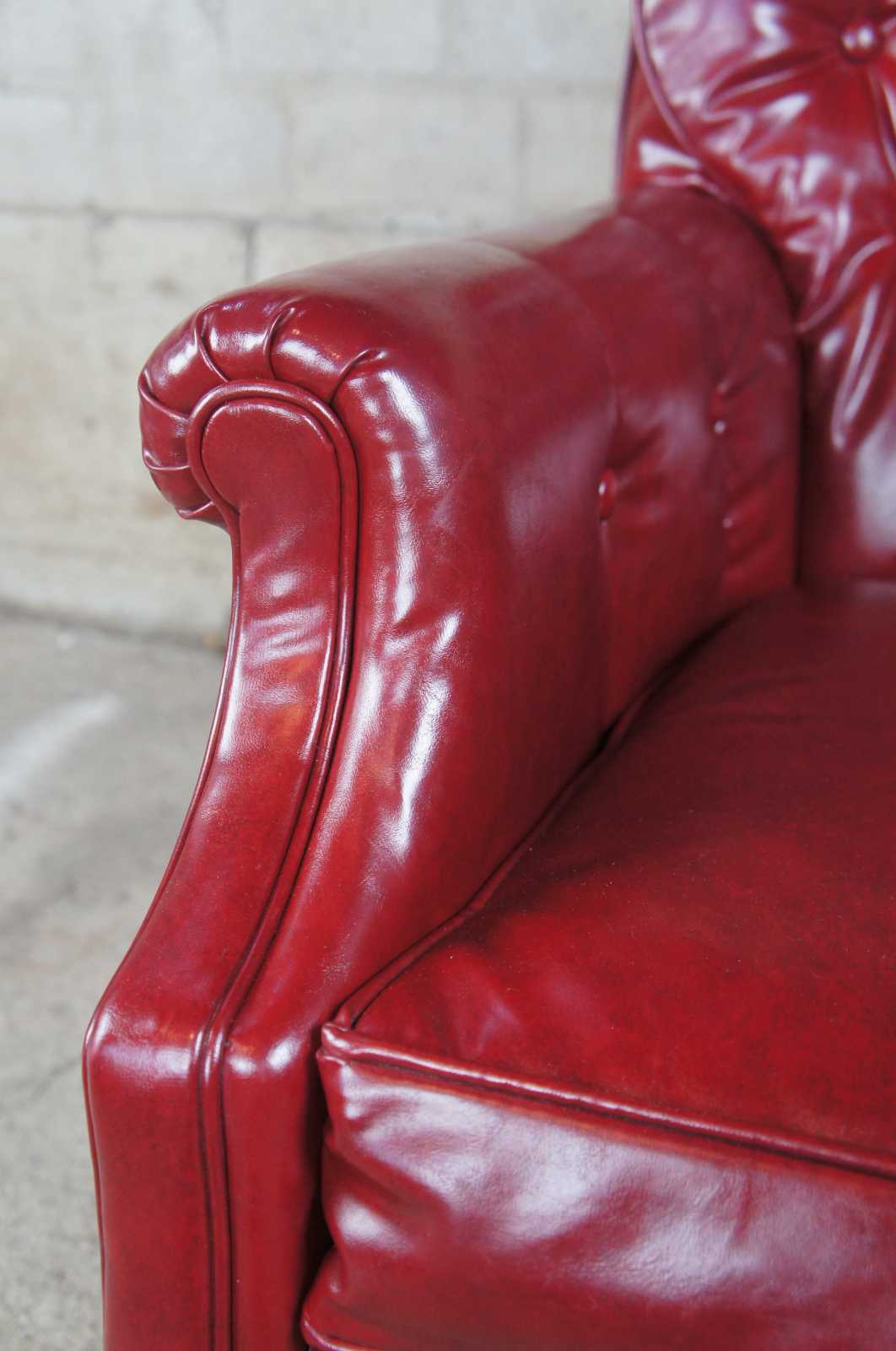 Mid century red leather tufted club chair. Attributed to Higbees and reupholstered and sold by Franklin.