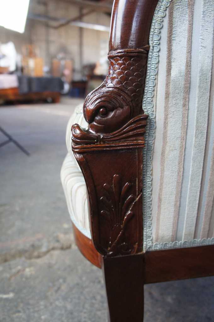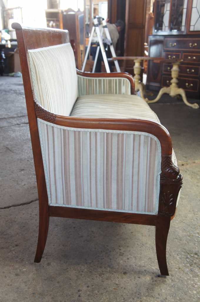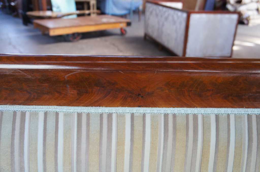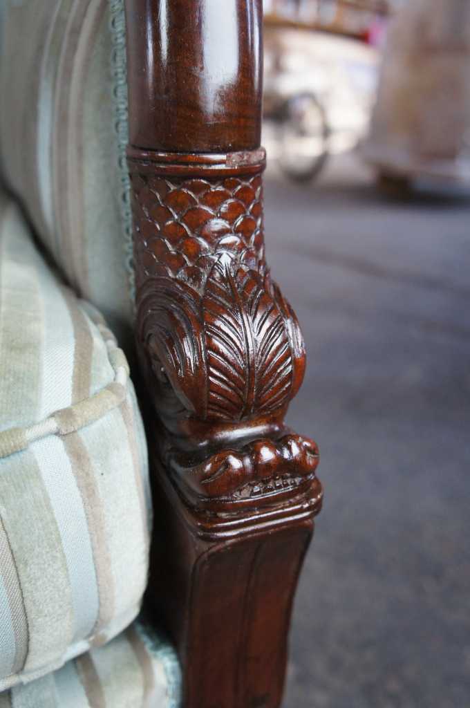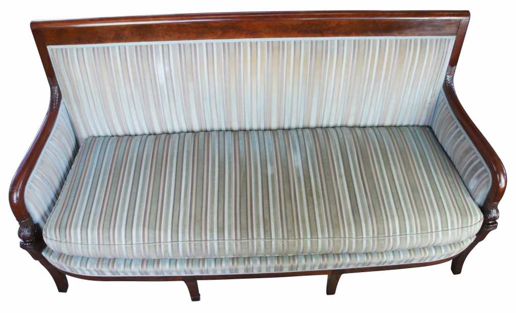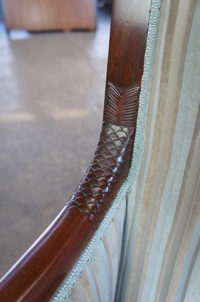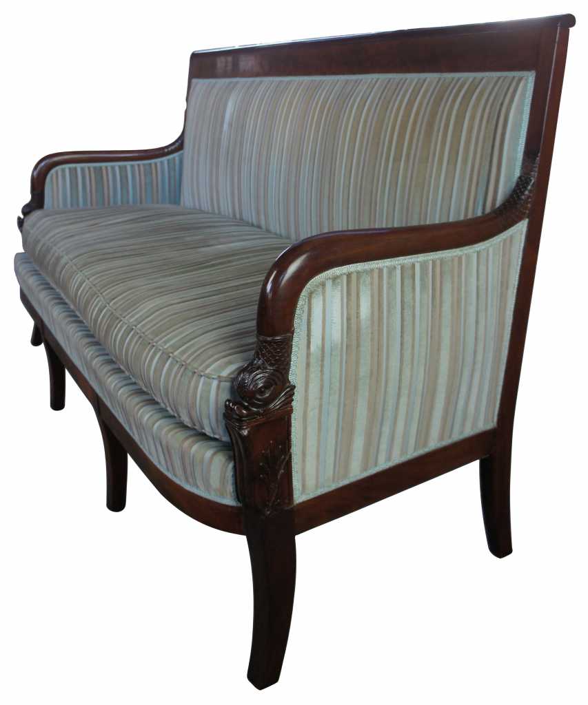 19th century American Empire mahogany sofa or settee. Features a high back leading to sloped figural delphin (dolphin) arms over flared legs. Upholstered in striped blue and teal with removable cushion. Delphin is a Latin word and root meaning dolphin (also delphinus) Delphin, Greek mythlogical sea god, the leader of the dolphins, poseidon placed him in the sky as the constellation Delphinus. Dolphins were the messengers of Poseidon, the "god" of the seas. – Once, some pirates captured the god Bacchus or Dionysus who confused him with a Prince, with the intention to ask for ransom. Dionysus raged and turned the ship's oars into snakes, which frightened the pirates and made them jump into the sea. Just in case you wanted to know.