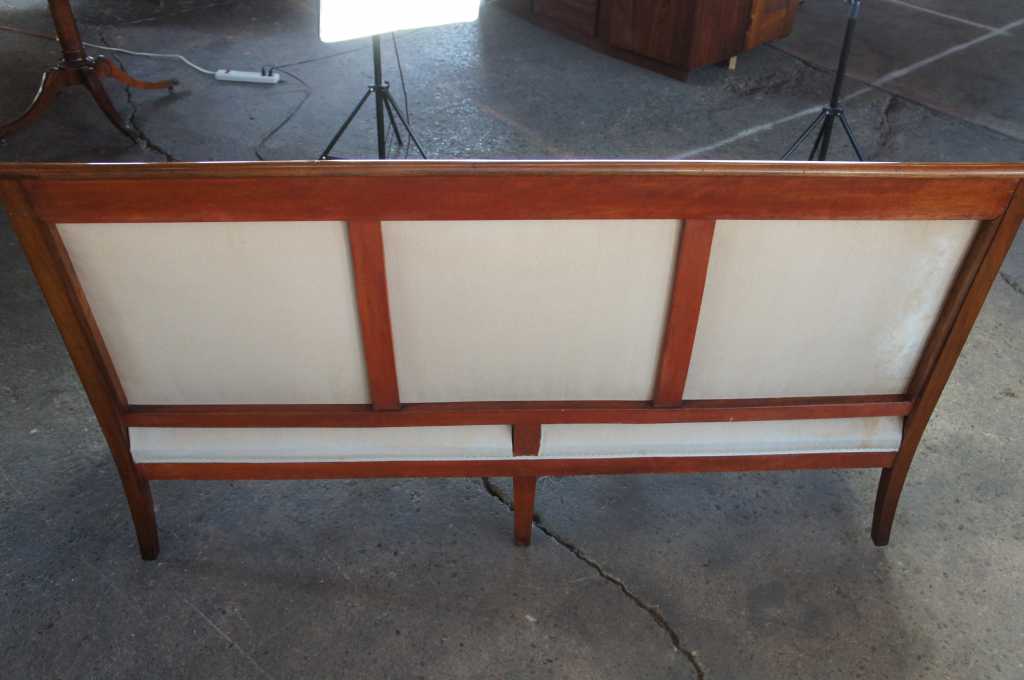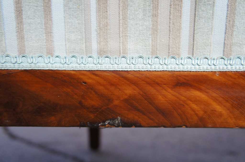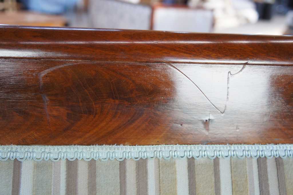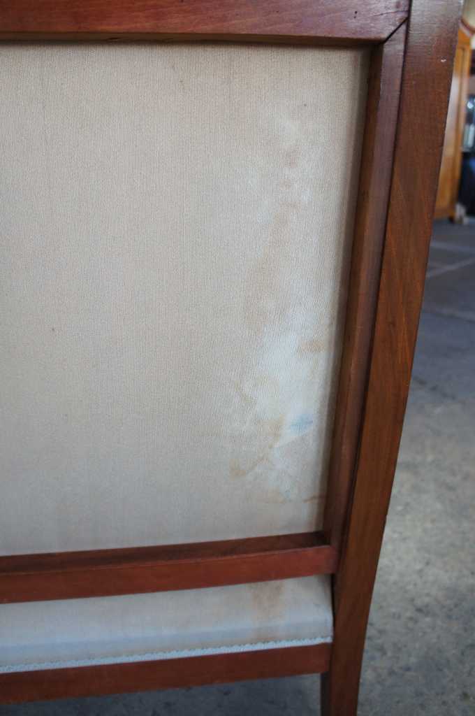 Good overall, structurally solid, past repair to front right leg, staining and discoloration to backside, mark to wood along top of frame, gouge on top of back, firm cushion, see pictures.