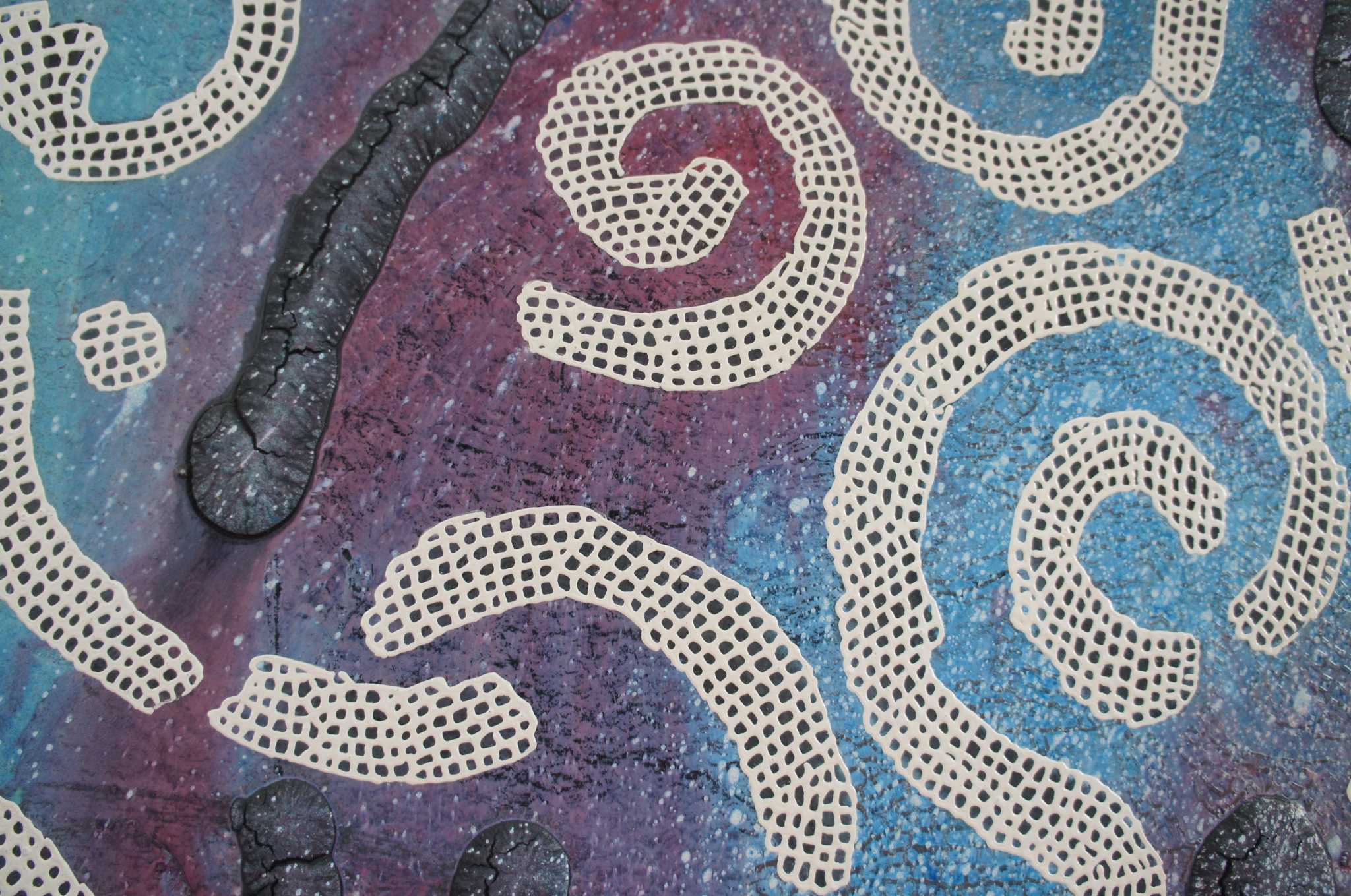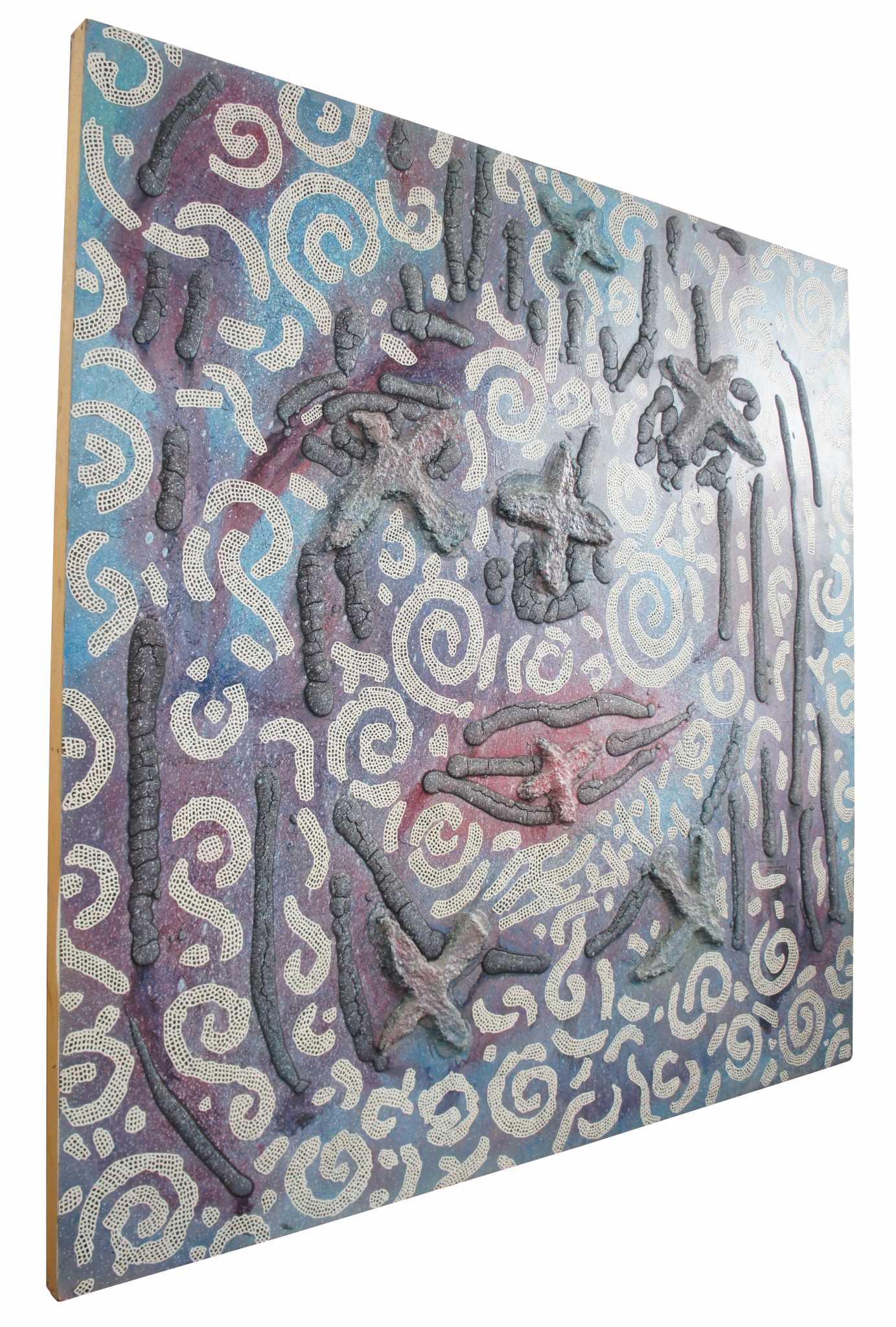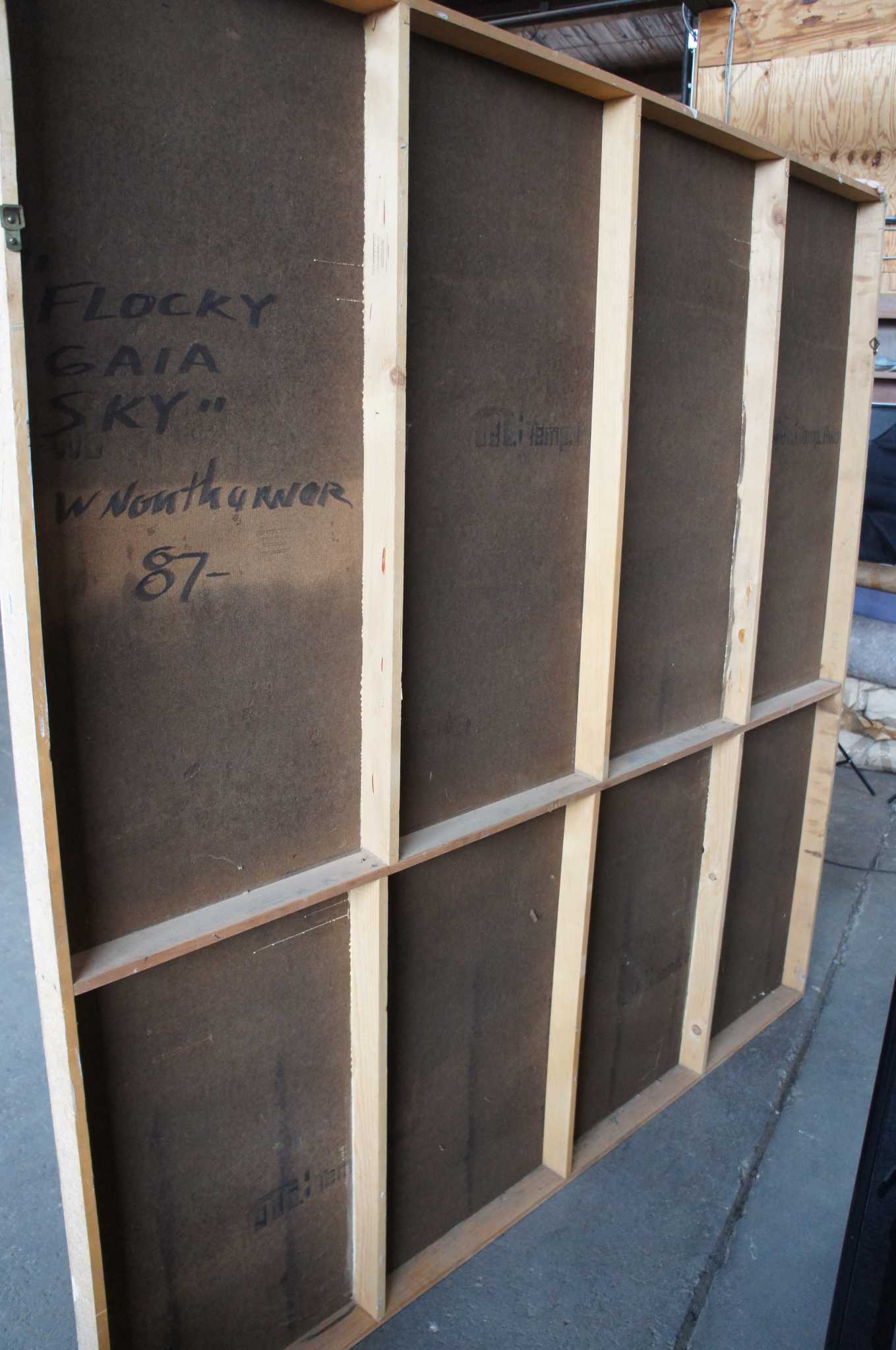 Acrylic, Mixed Media. Features a flock of birds in the sky.