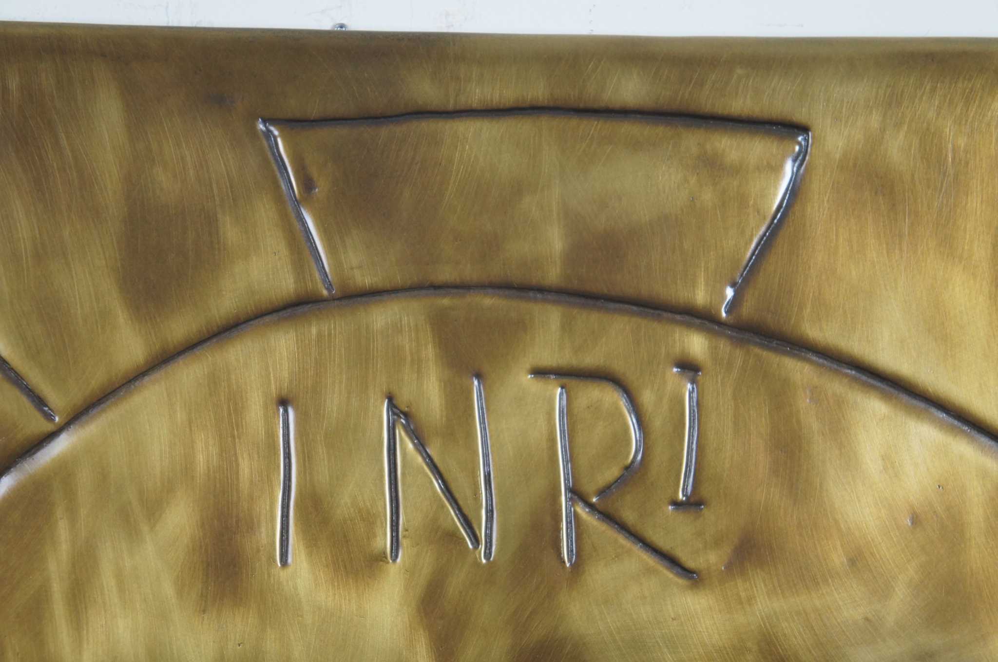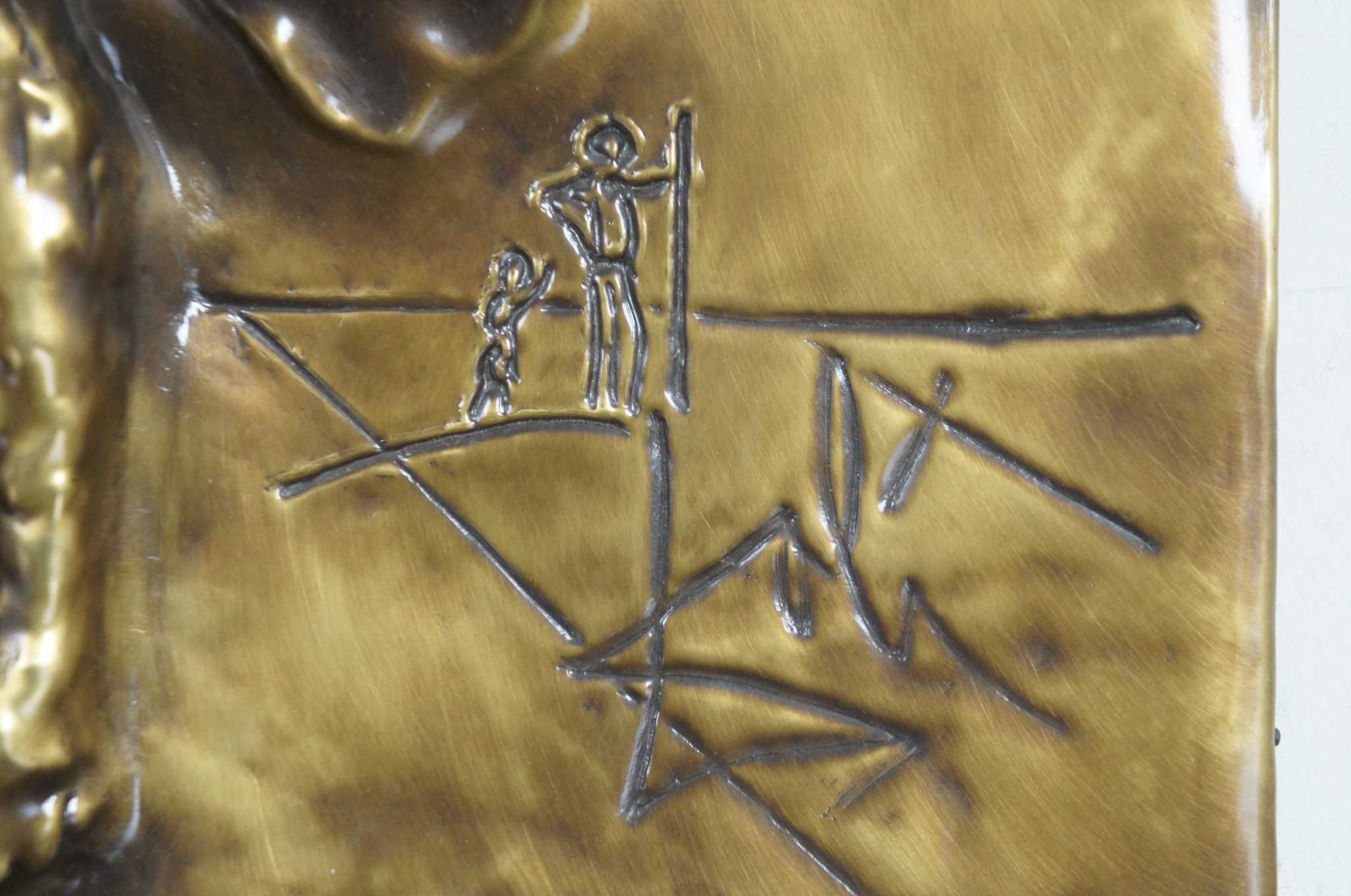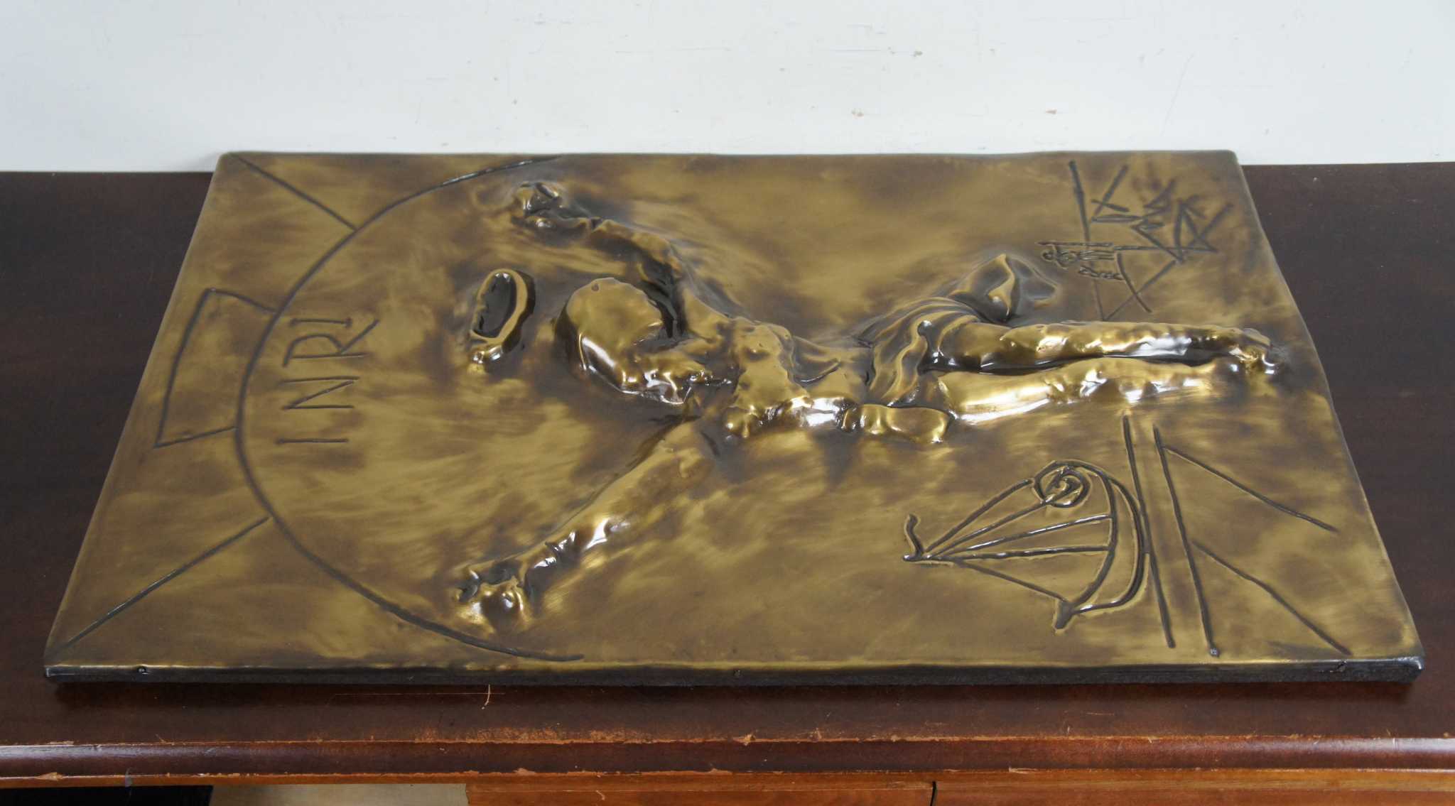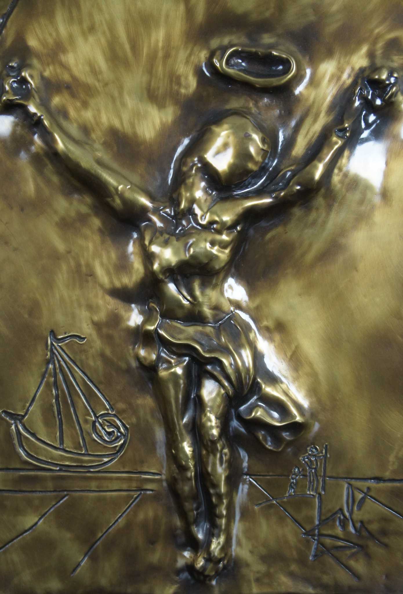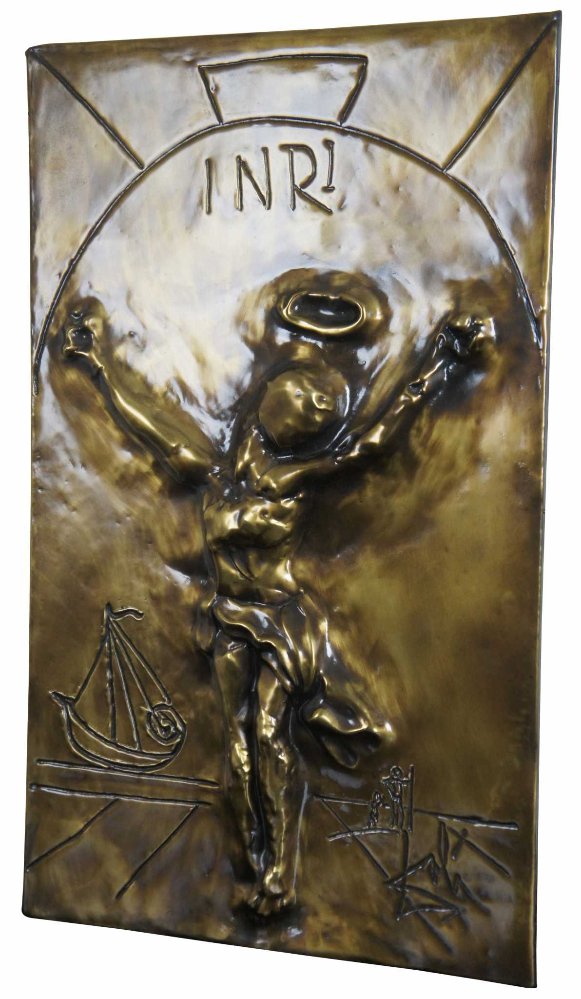 Christ Of St. John Of The Cross, a bas relief sculpture by Salvador Dali with a bronze finish depicting crucifixion image of Christ with INRI above head and a sailboat on left side symbolizing salvation and a man and a child on the right side. Marked Dalart N.v. Copywright 1979. Edition 9 of 195. Center Art Galleries, Honolulu, Hawaii.
