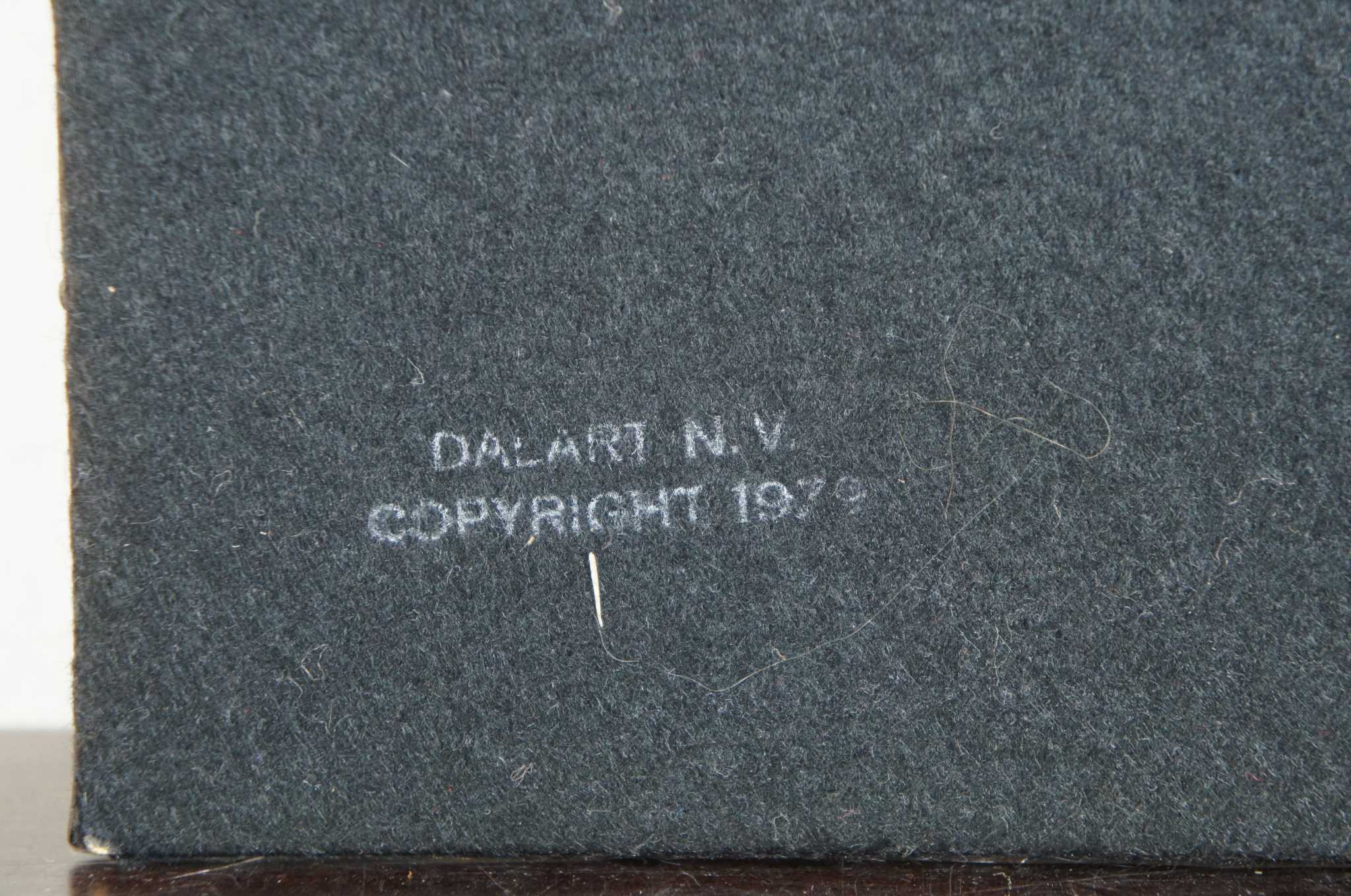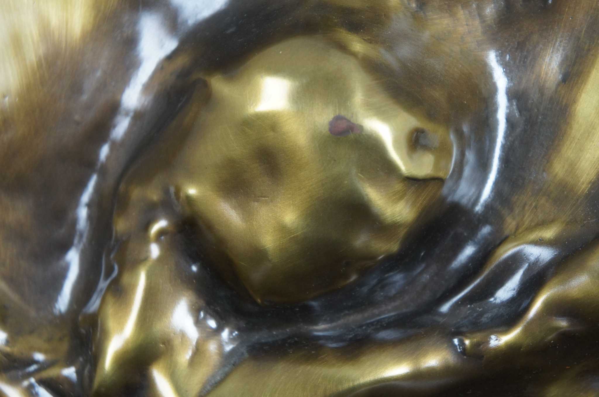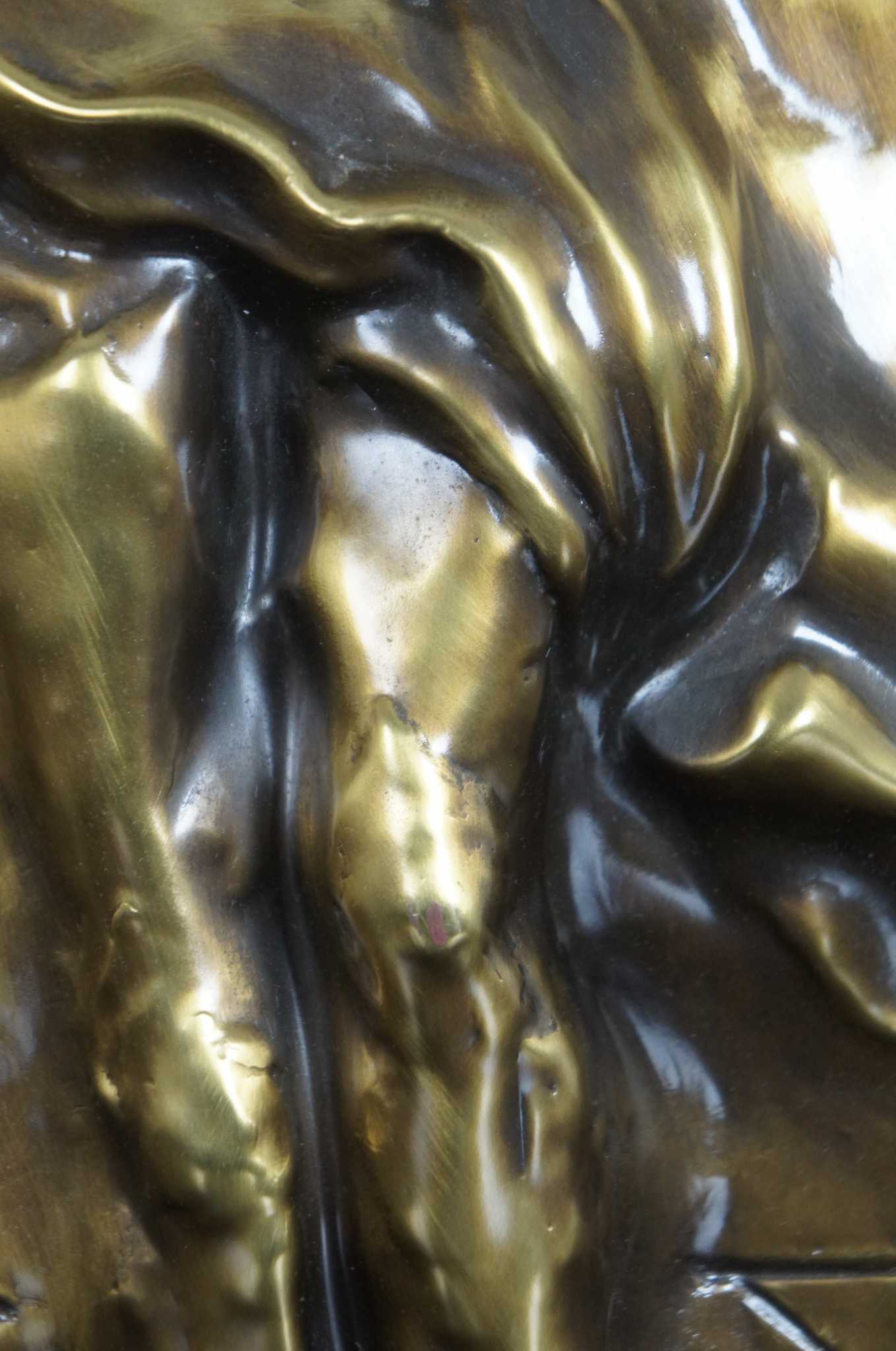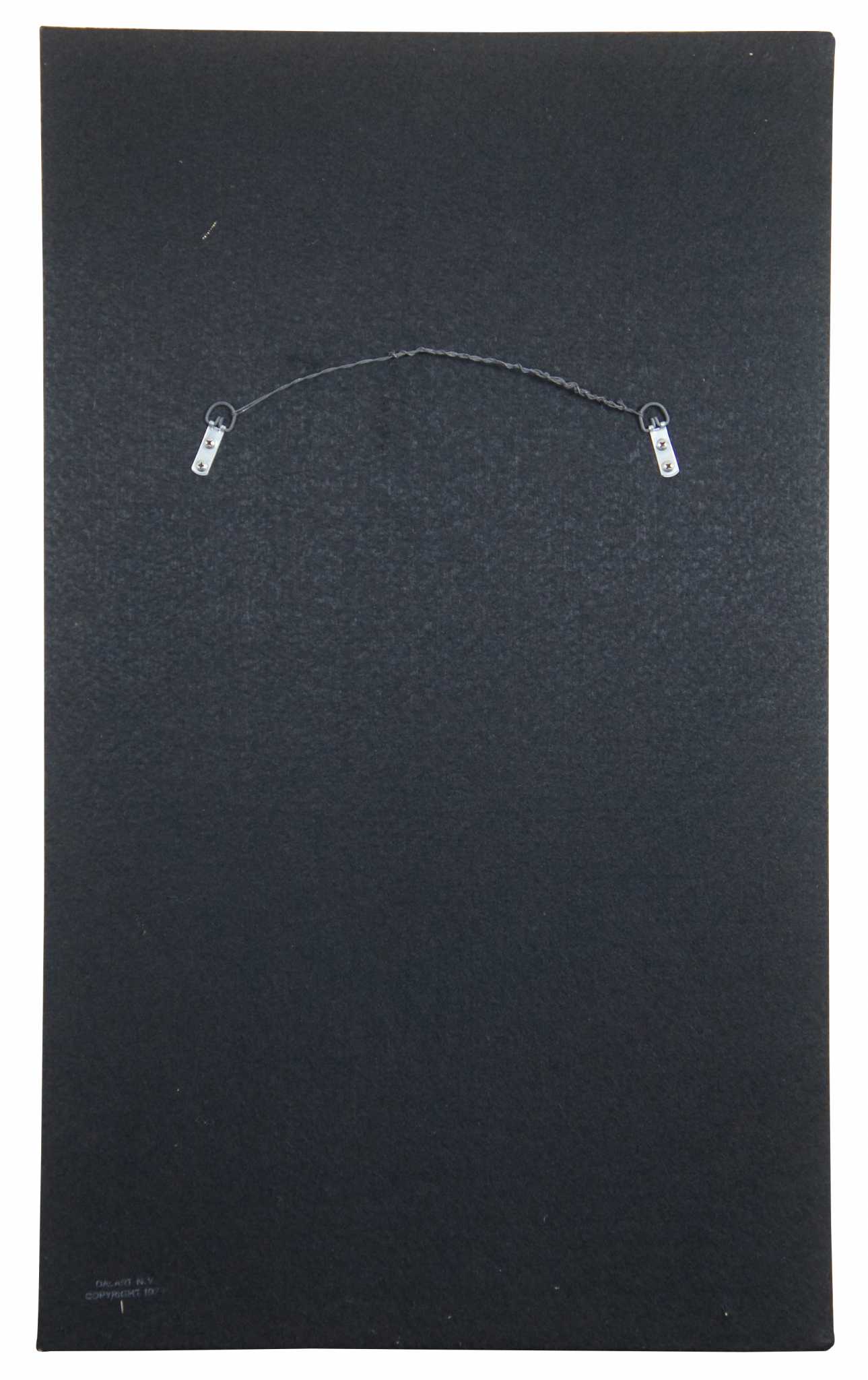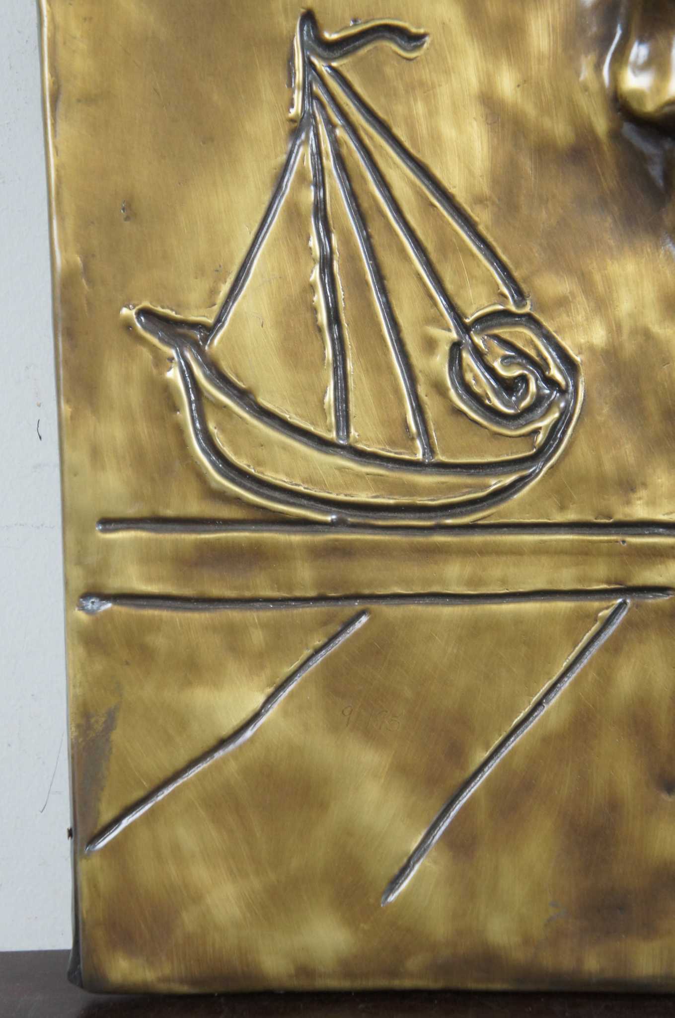 Christ Of St. John Of The Cross, a bas relief sculpture by Salvador Dali with a bronze finish depicting crucifixion image of Christ with INRI above head and a sailboat on left side symbolizing salvation and a man and a child on the right side. Marked Dalart N.v. Copywright 1979. Edition 9 of 195. Center Art Galleries, Honolulu, Hawaii.