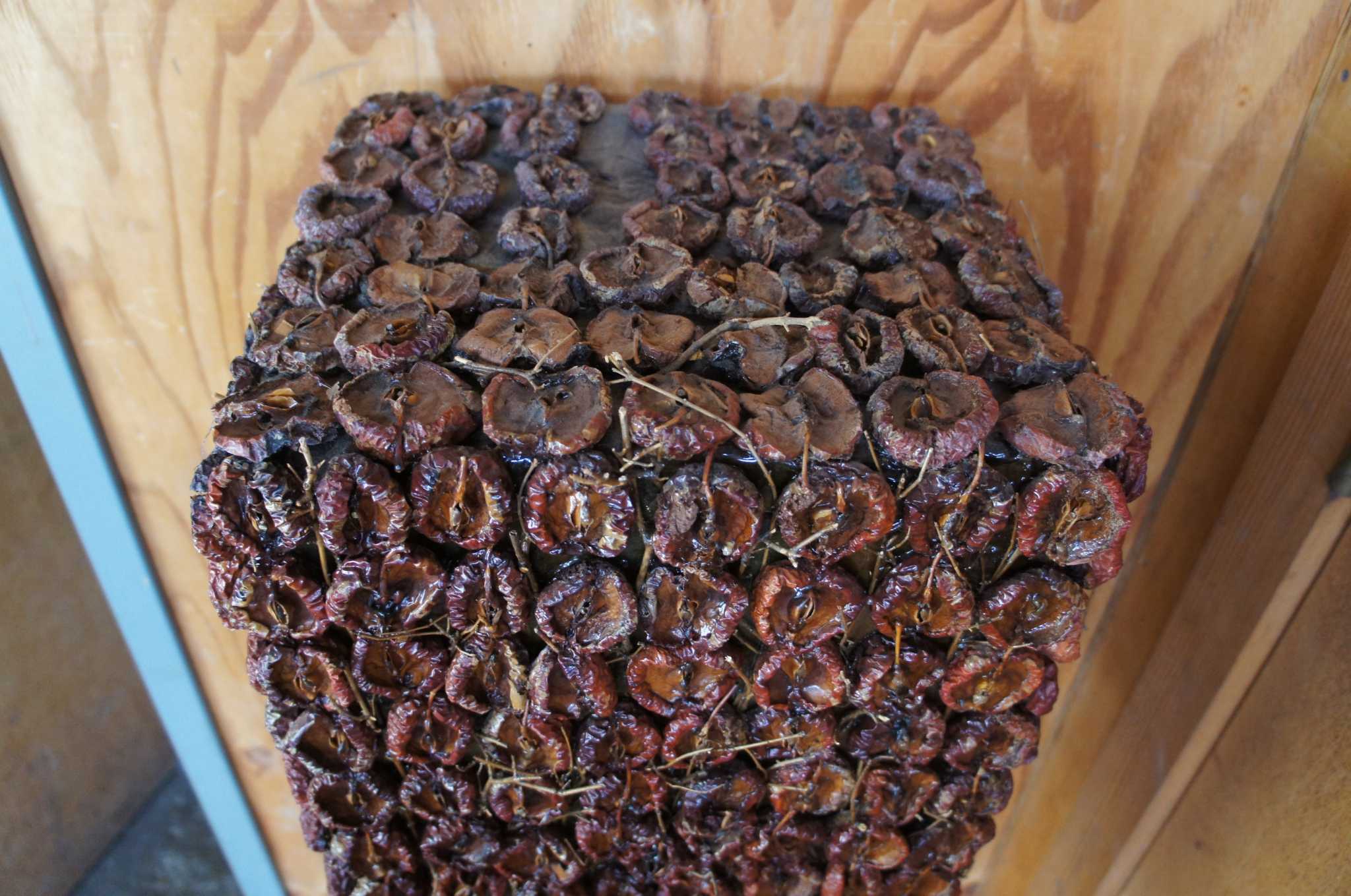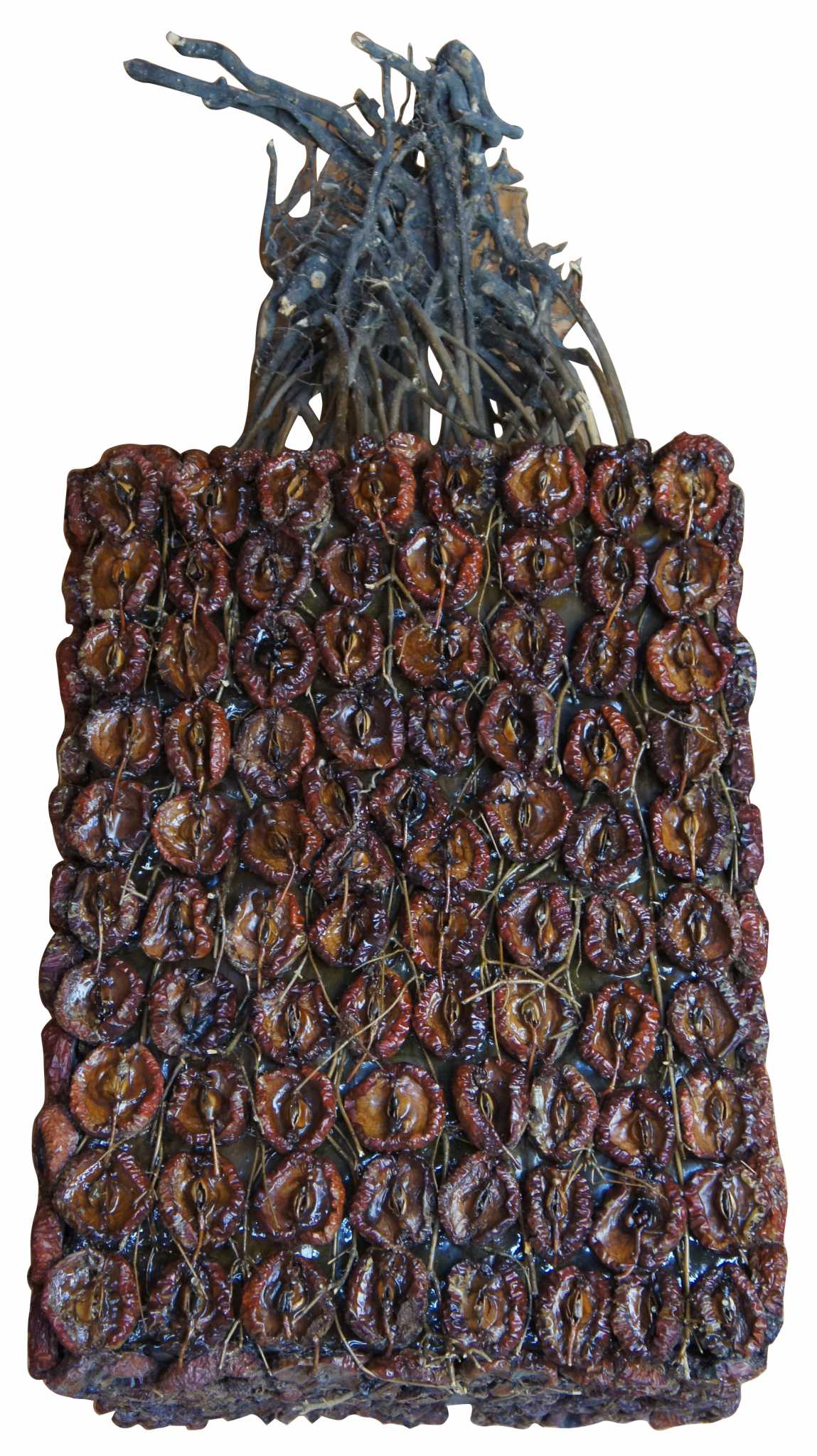 1993 contemporary art sculpture featuring a cube shape covered in sun dried tomatoes, with a twig or tree root system coming off the underside. Mounts to wall via cleat.