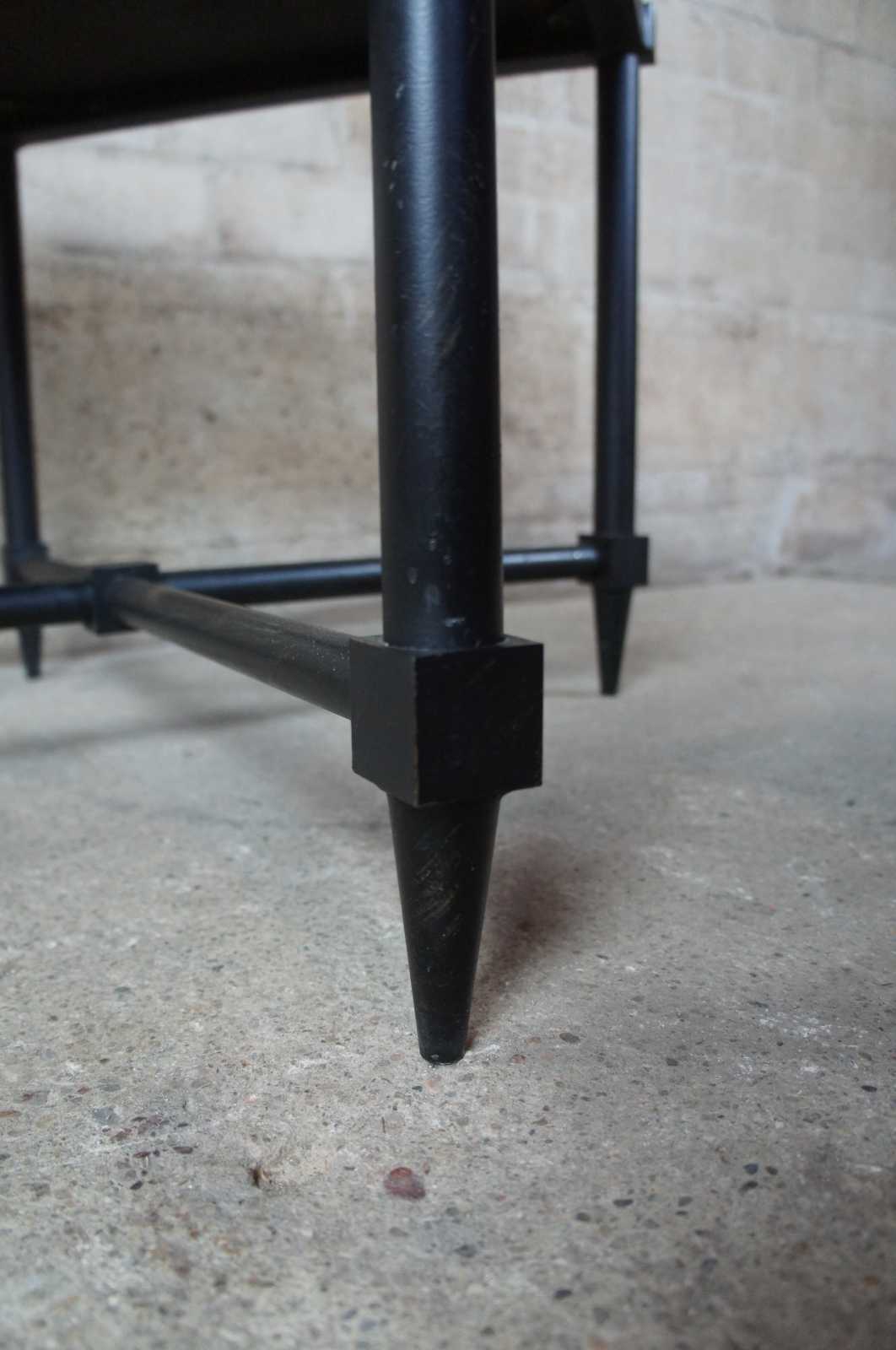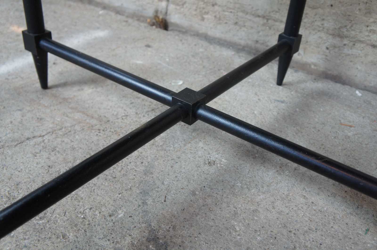 A unique pair of rustic and traditional side or accent tables from the Acquisitions Collection by Henredon. Features a distressed walnut slab inset into an iron base with x frame and arrow pointed feet. Circa early 2000s. On Dec. 5, 2002 the often-heard rumors became true: Furniture Brands is acquiring Henredon, Drexel Heritage and Maitland-Smith. It had been expected since before the October market, but the companies involved were unclear. Was BenchCraft included? La Barge? Beacon Hill?