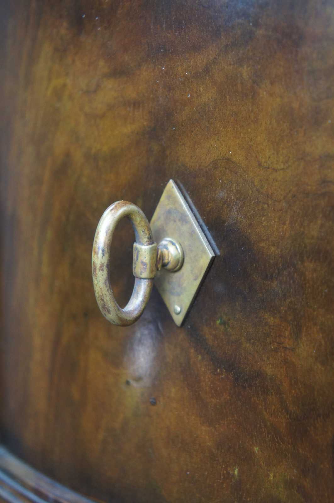 Traditional inspired drum table by Henredon. The Burnet side table is from the Acquisitions Collection. Flamed mahogany with 3 drawers, tapered and fluted legs over brass capped feet. Product number 3030-41-669