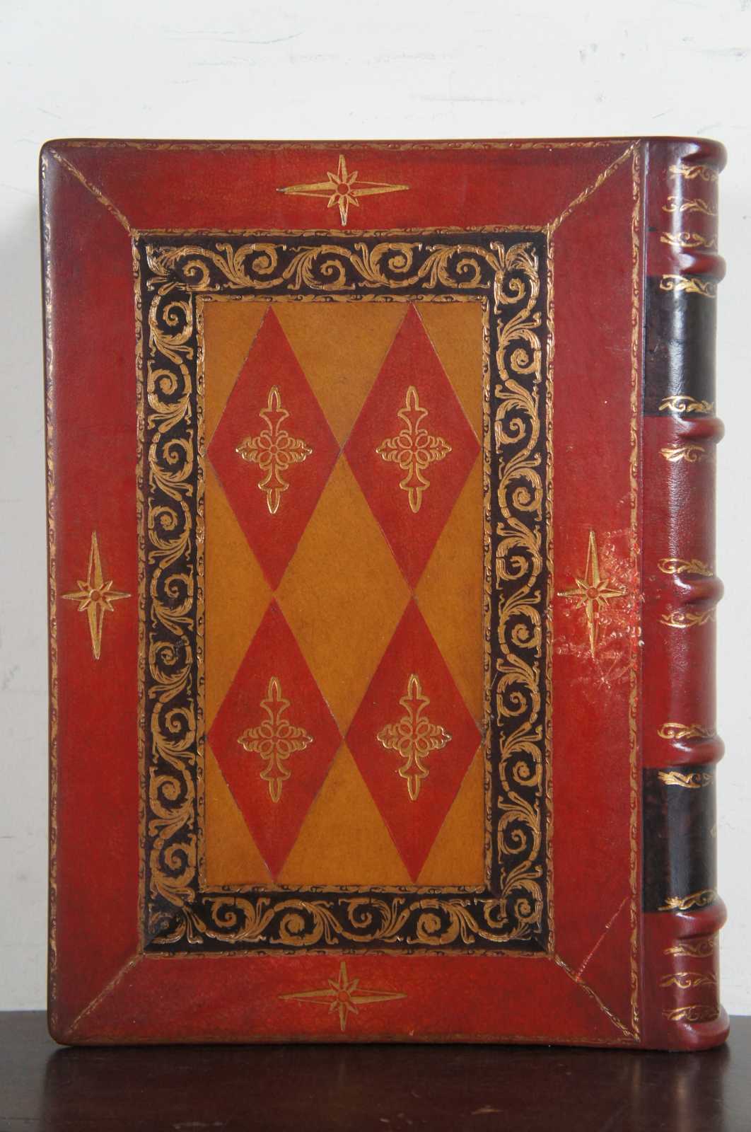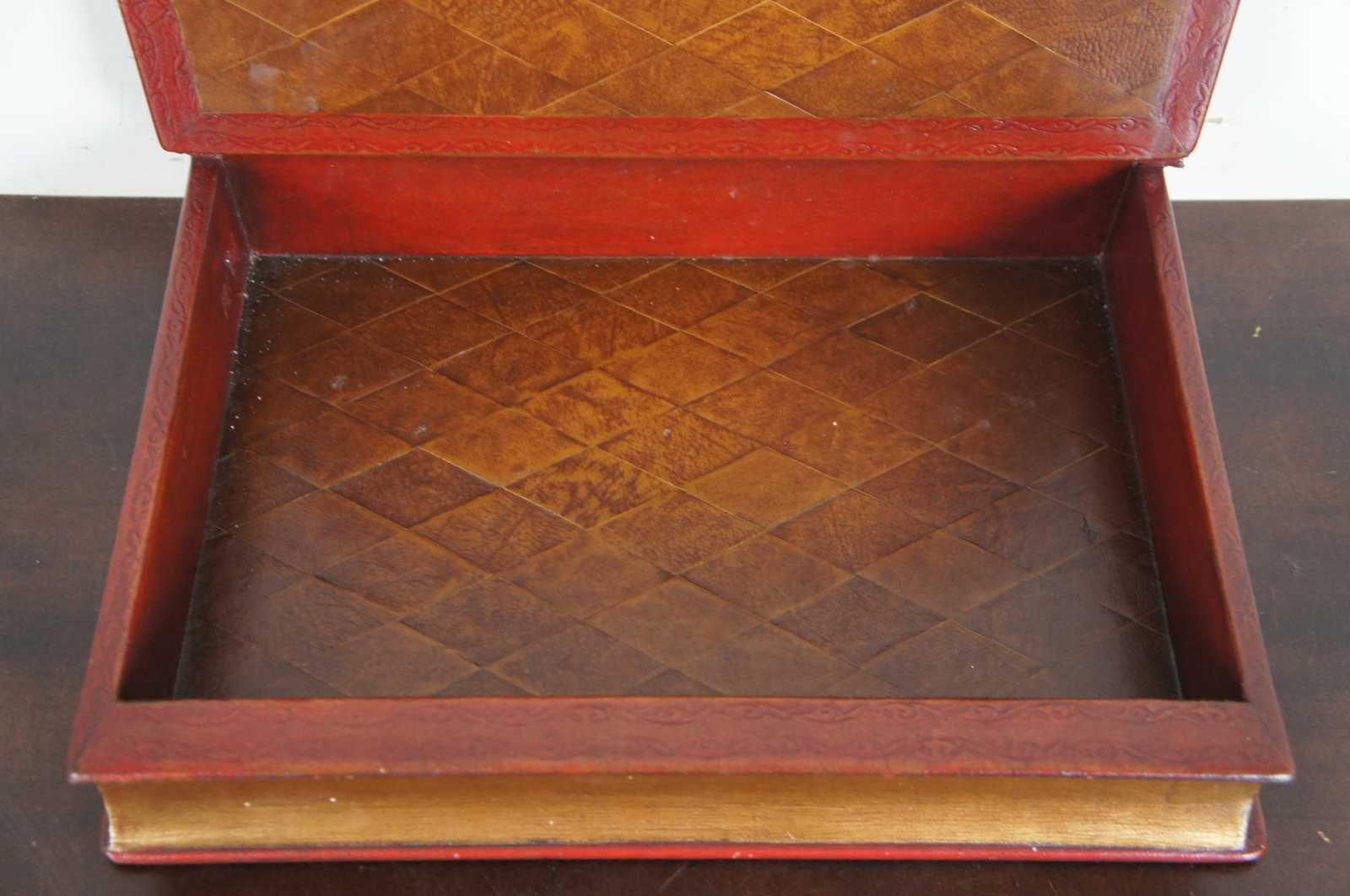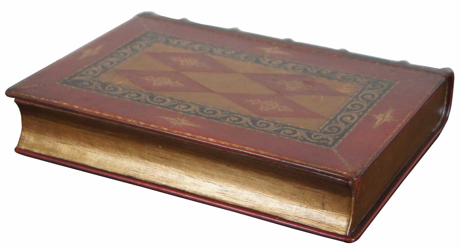 Leather bound book box by Maitland Smith. Features hand tooled dark red leather with ornate diamond patterns, stars and scroll details. Often called faux or fake books, this book has no pages, but a large space to hid trinkets, money, jewelery, guns or anything you want.