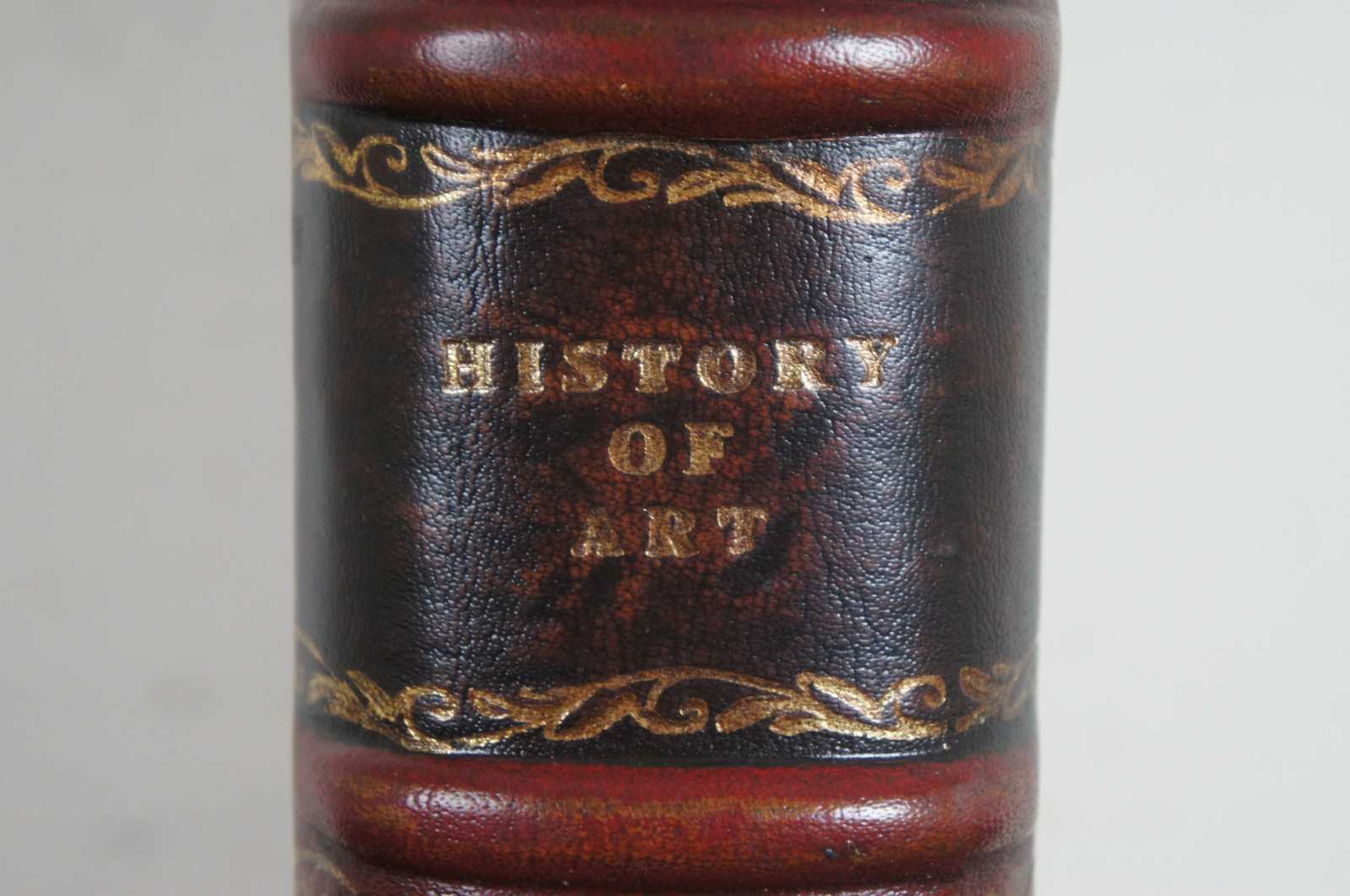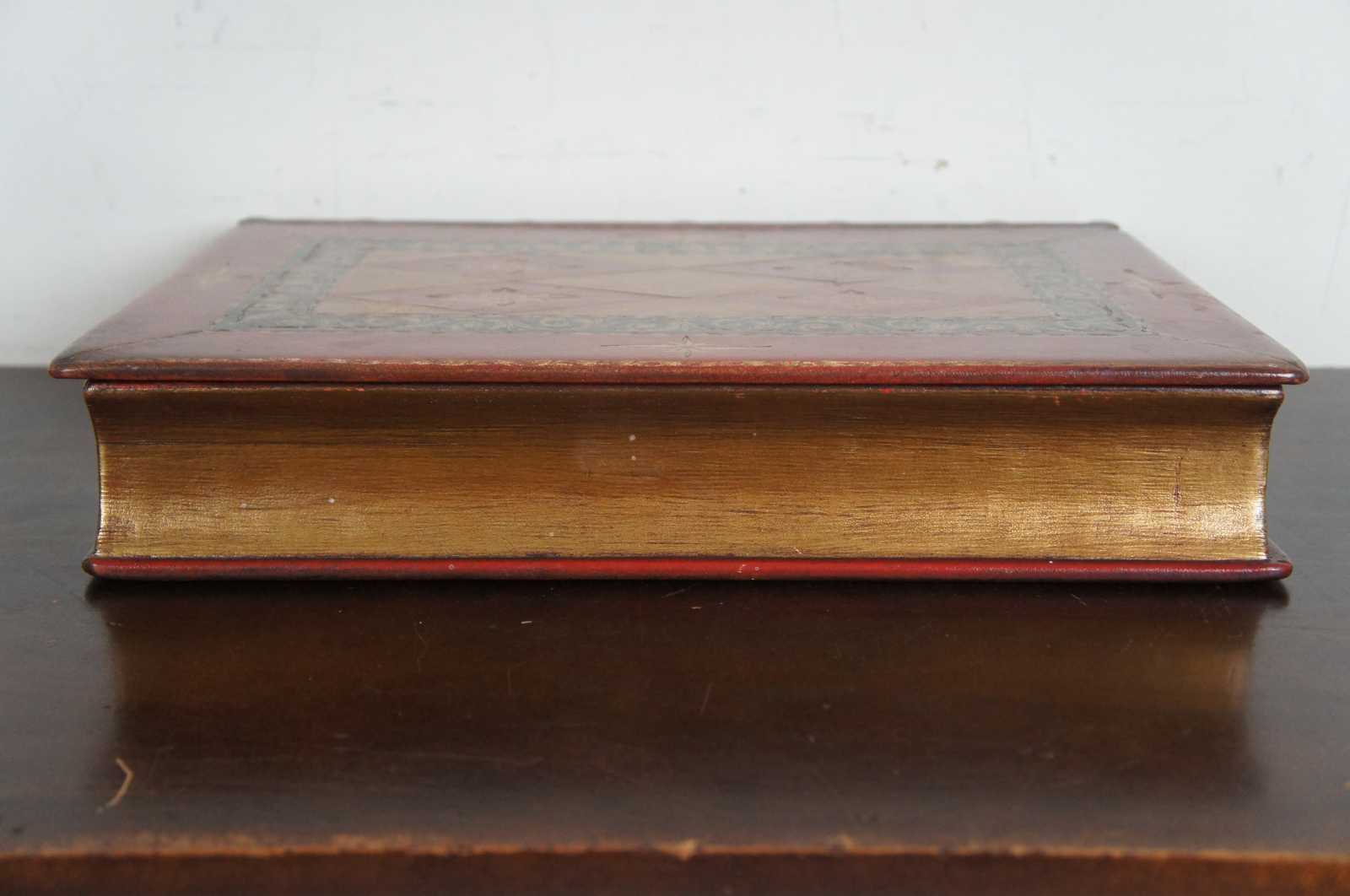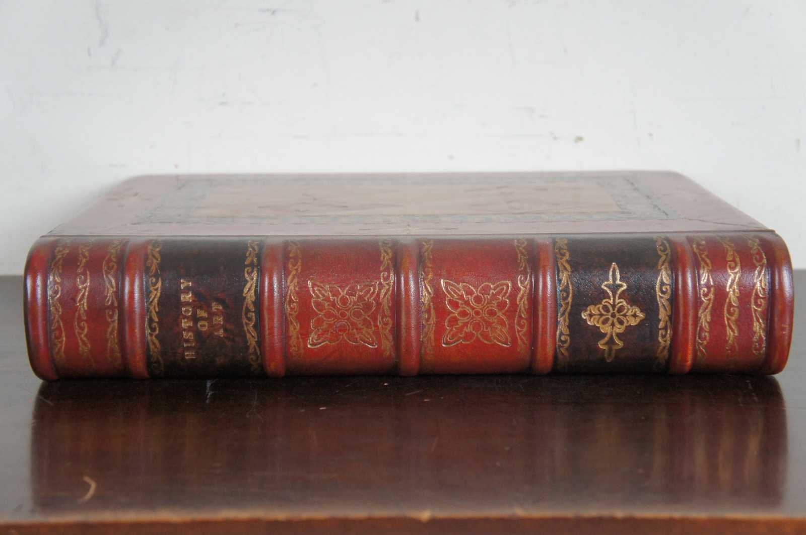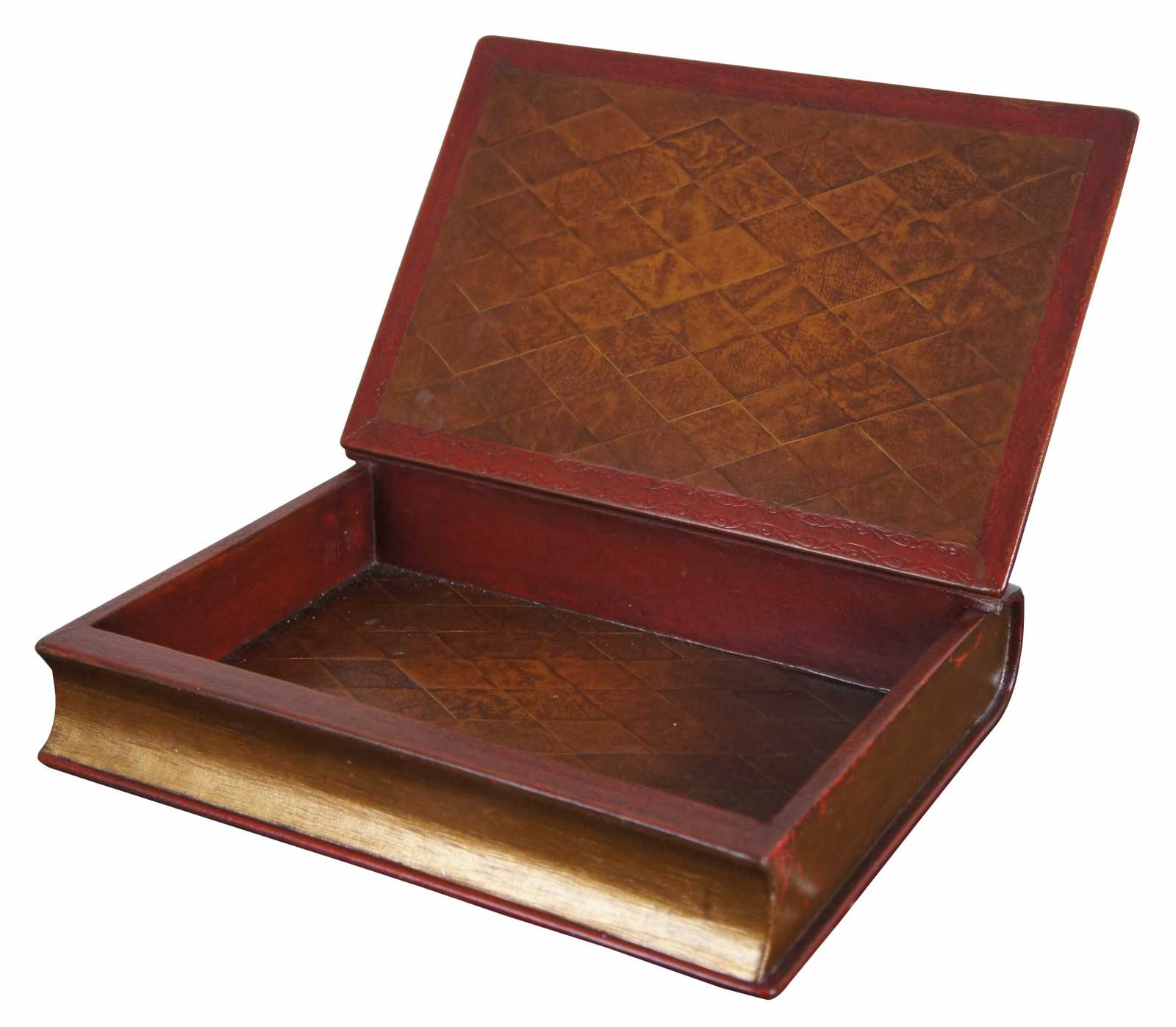 Leather bound book box by Maitland Smith. Features hand tooled dark red leather with ornate diamond patterns, stars and scroll details. Often called faux or fake books, this book has no pages, but a large space to hid trinkets, money, jewelery, guns or anything you want.