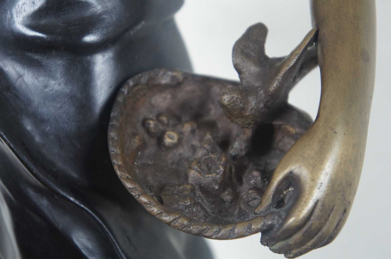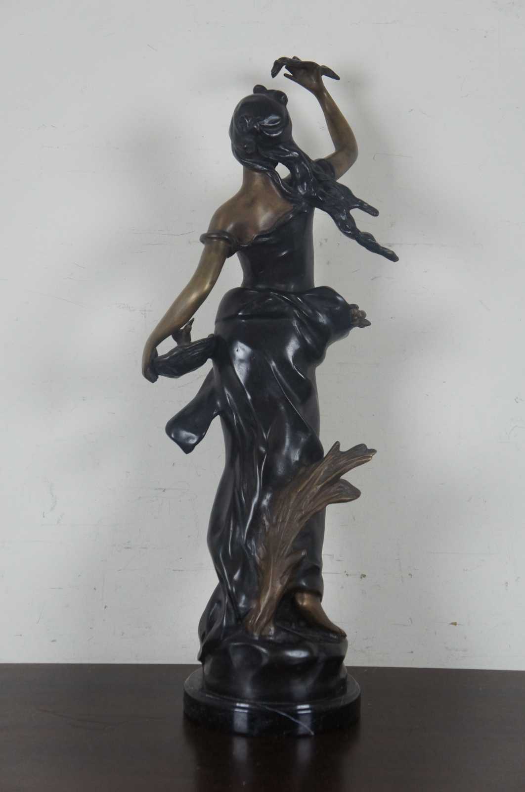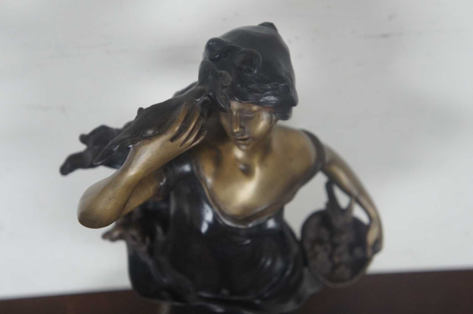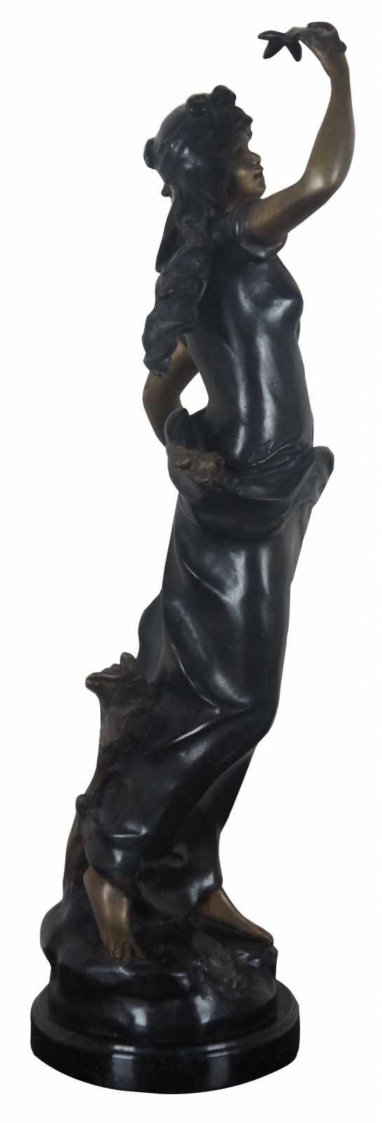 French figural cast bronze statue or sculpture featuring a female figure feeding birds. After Moreau.
