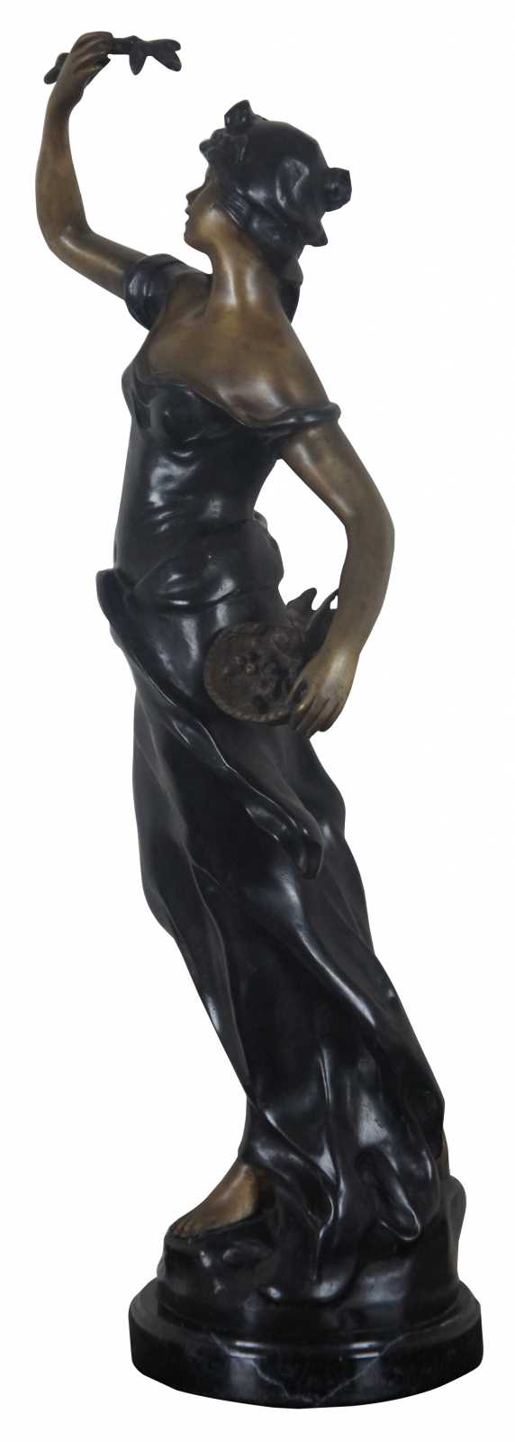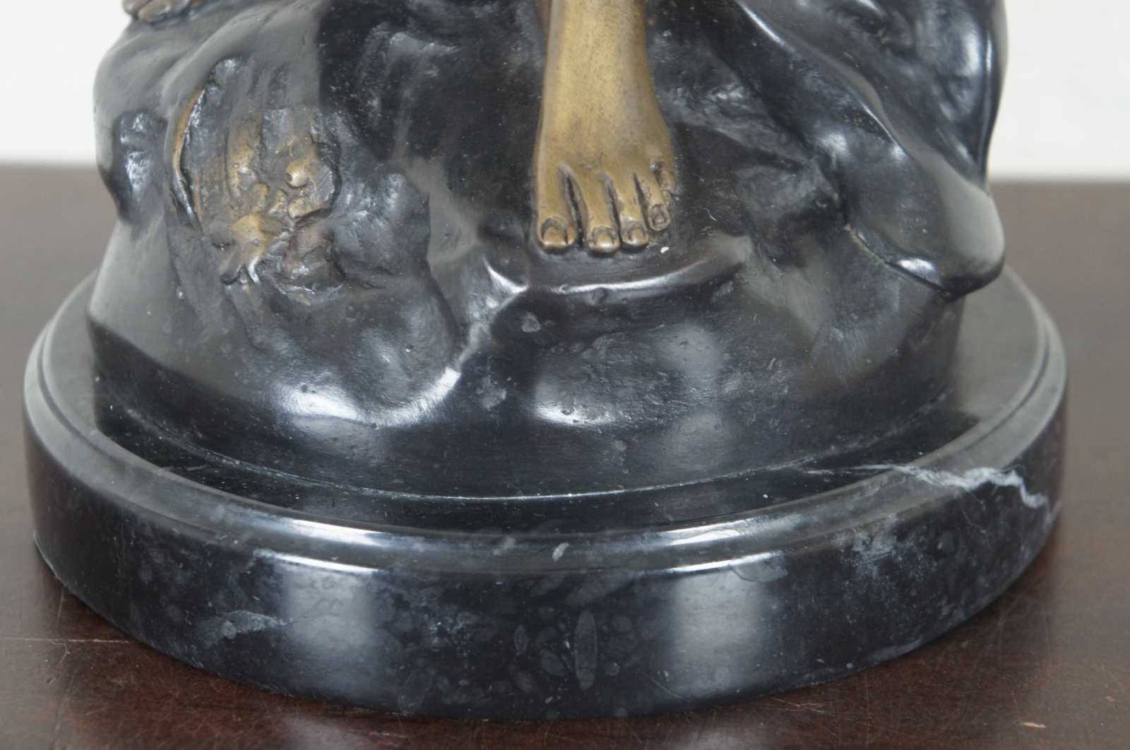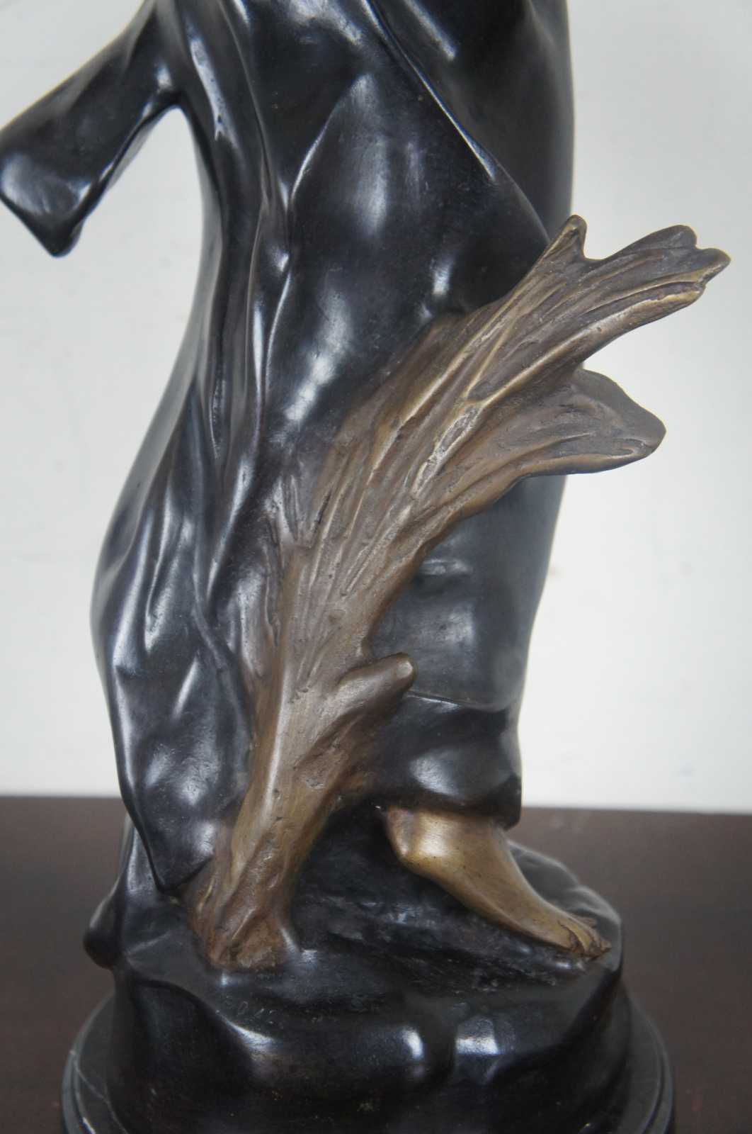 French figural cast bronze statue or sculpture featuring a female figure feeding birds. After Moreau.