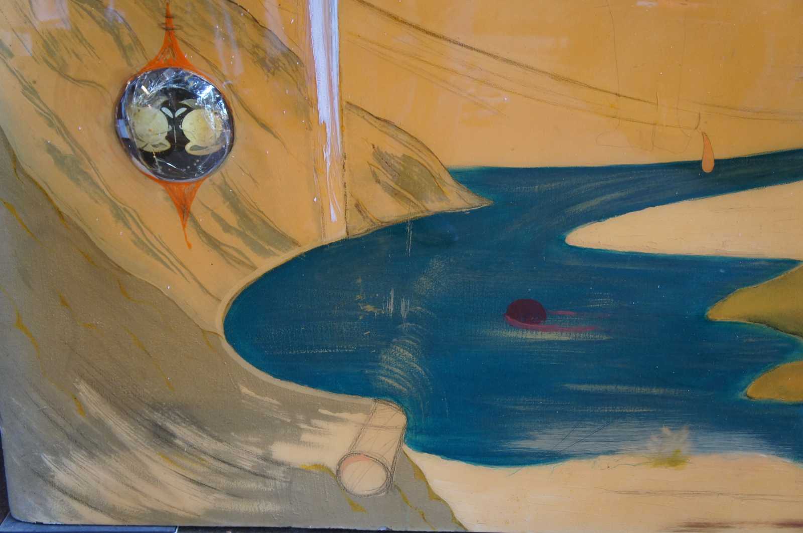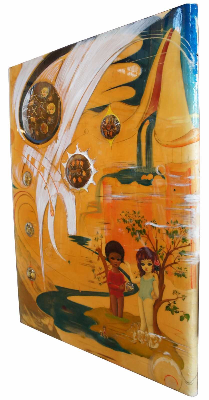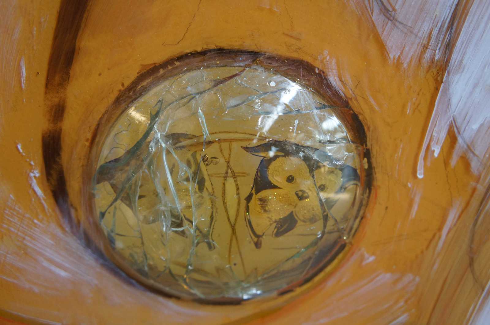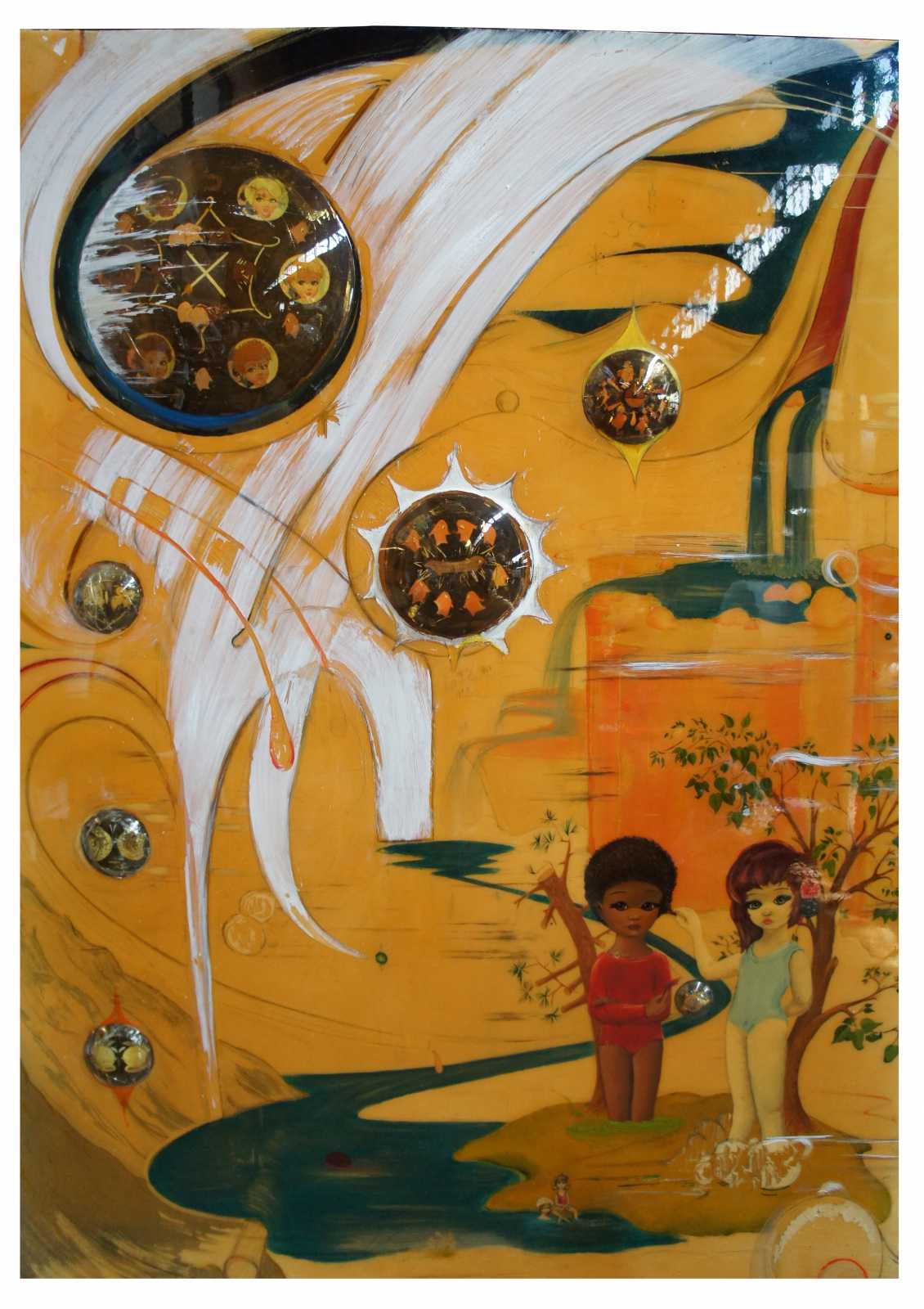 ""Enameled Flavor"" mixed media, glass, resin and oil on wood, surrealism / expressionism. This piece was exhibited in the 1994 exhibit Synthetic Nuvism at University Galleries of Illinois State University. Synthetic Nuvism: Scott Jacboson, Clove, and Jason Fascination exhibited various works. Sythetic Nuvism is described as ""swings, dips and covers its mouth to conceal a salacious grin. Filtered through KALEIDOSCOPE EYES, suburban ennui, debased 60s icons, and the tackiest abstract painting ever found at a local art fair, it grooves to the heartbeat of a culture that has clearly exceeded its speed limit.