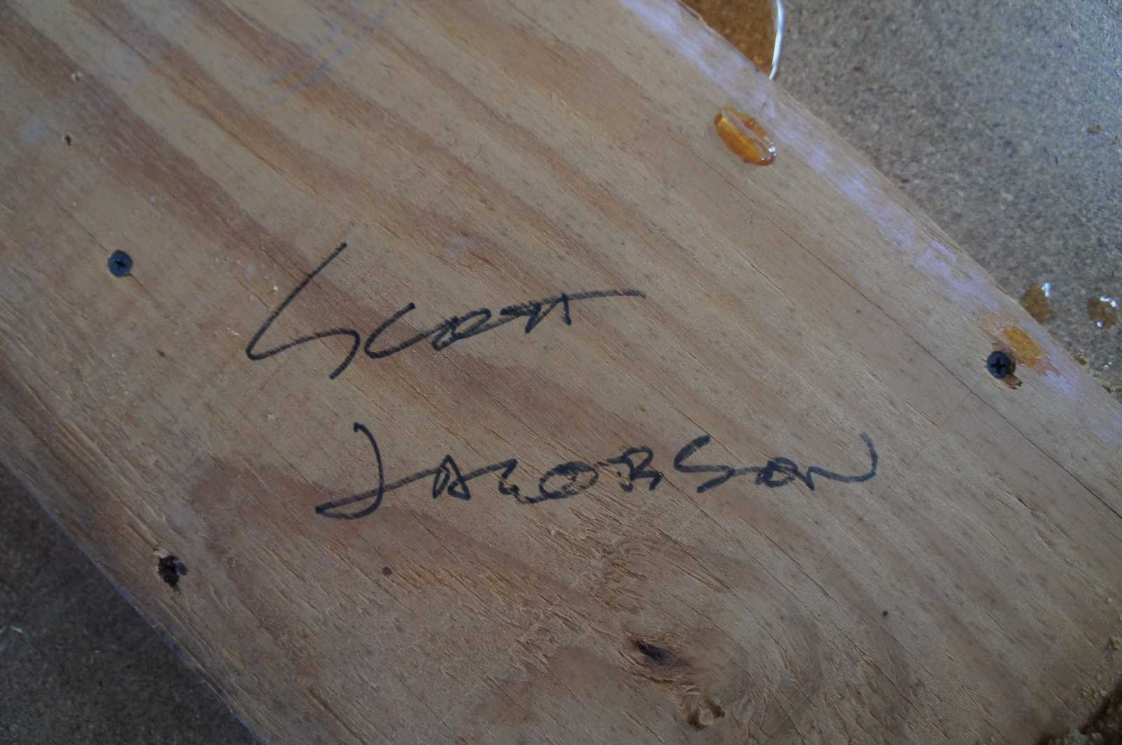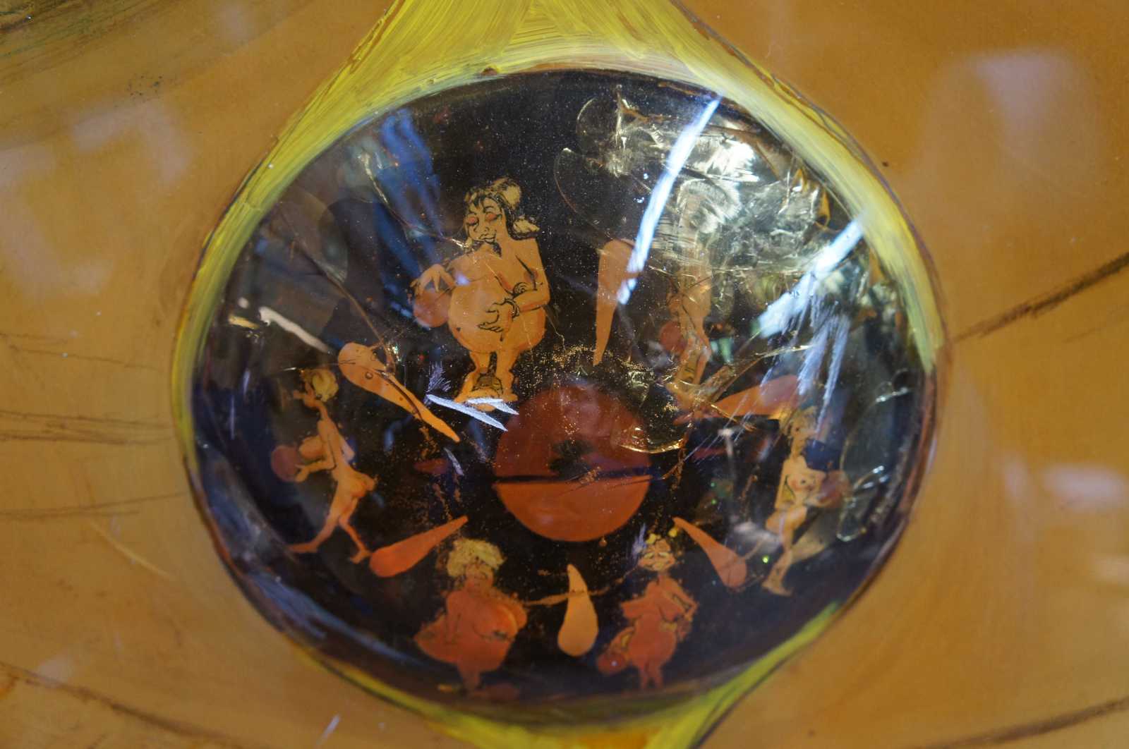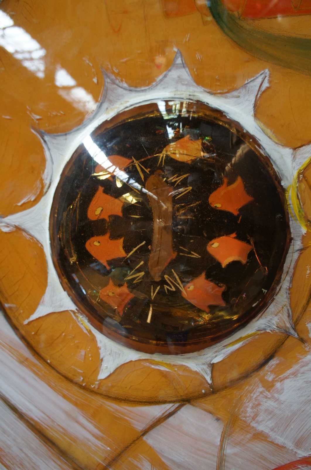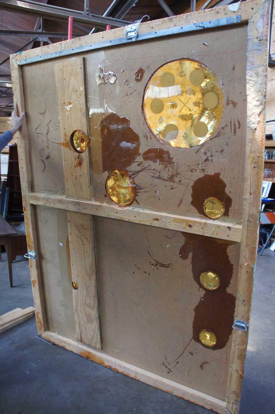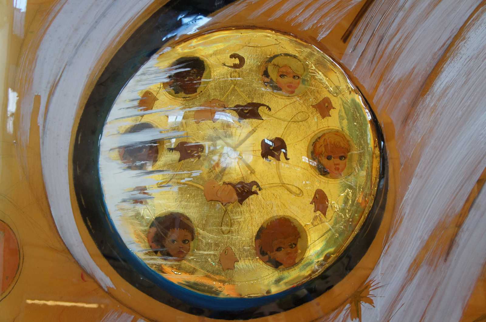 ""Enameled Flavor"" mixed media, glass, resin and oil on wood, surrealism / expressionism. This piece was exhibited in the 1994 exhibit Synthetic Nuvism at University Galleries of Illinois State University. Synthetic Nuvism: Scott Jacboson, Clove, and Jason Fascination exhibited various works. Sythetic Nuvism is described as ""swings, dips and covers its mouth to conceal a salacious grin. Filtered through KALEIDOSCOPE EYES, suburban ennui, debased 60s icons, and the tackiest abstract painting ever found at a local art fair, it grooves to the heartbeat of a culture that has clearly exceeded its speed limit.