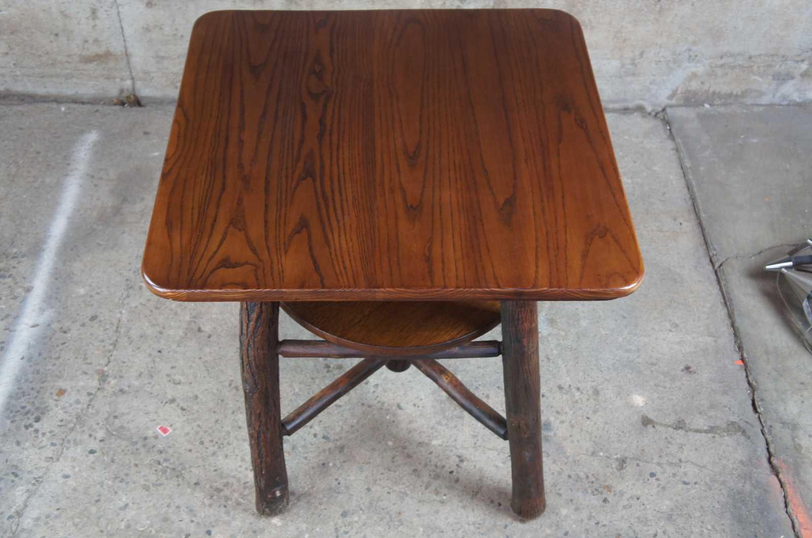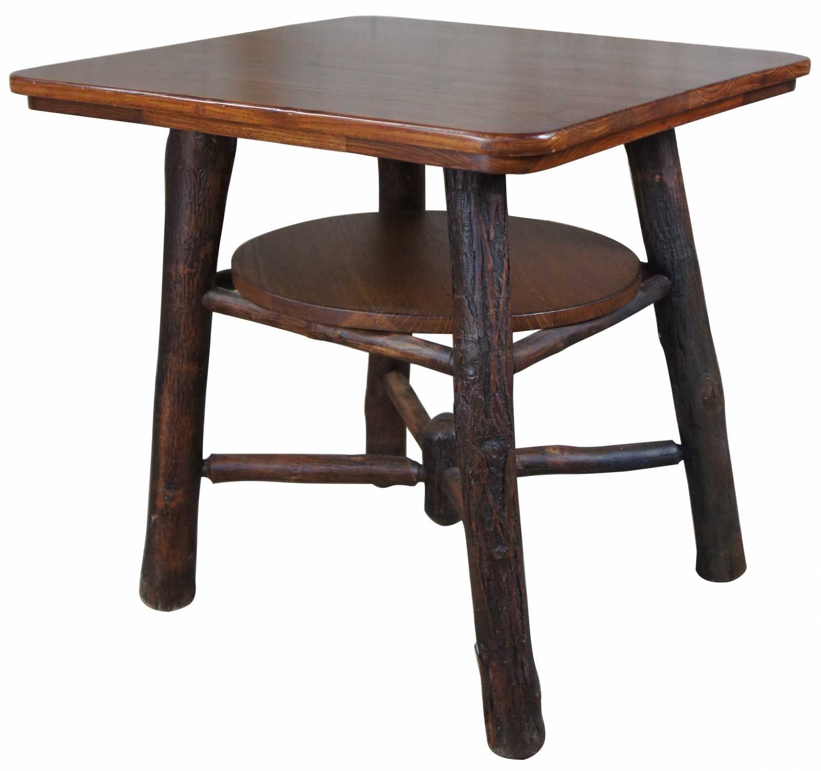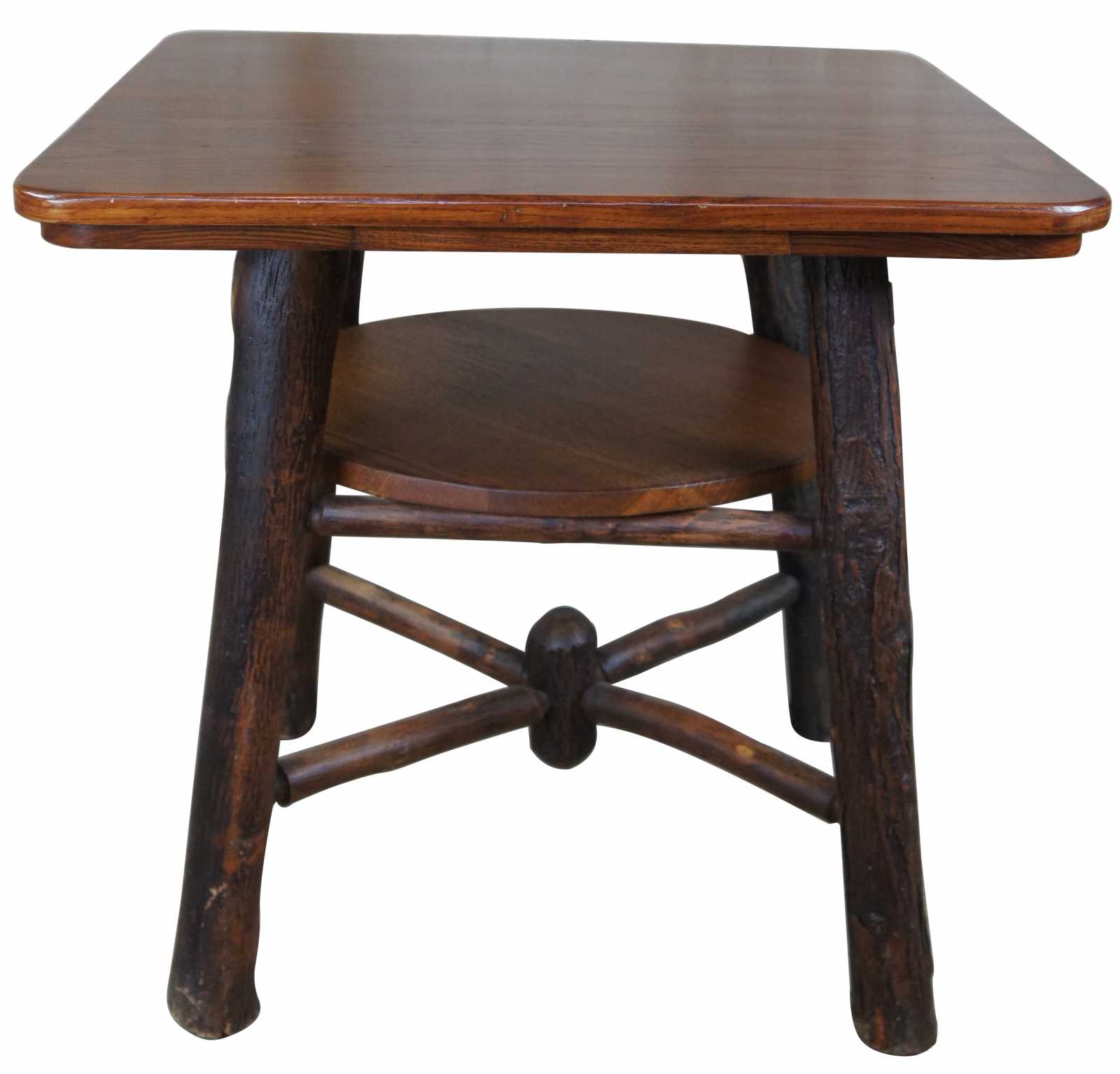 Pre 1930s table by The Rustic Hickory Furniture Company. Features a primitve log design with two tiers (a shelf for trinkets), and a trestle base with log finial, golden oak finish. The Rustic Hickory Furniture Company was founded in 1902 in Laporte, Indiana.