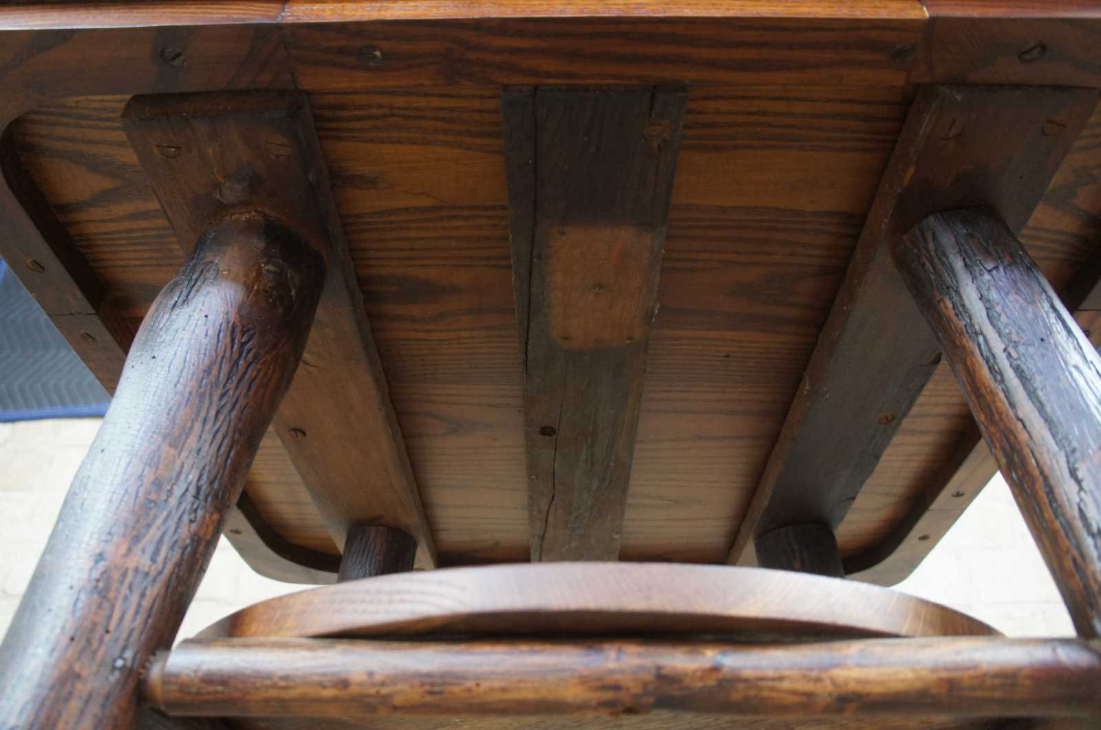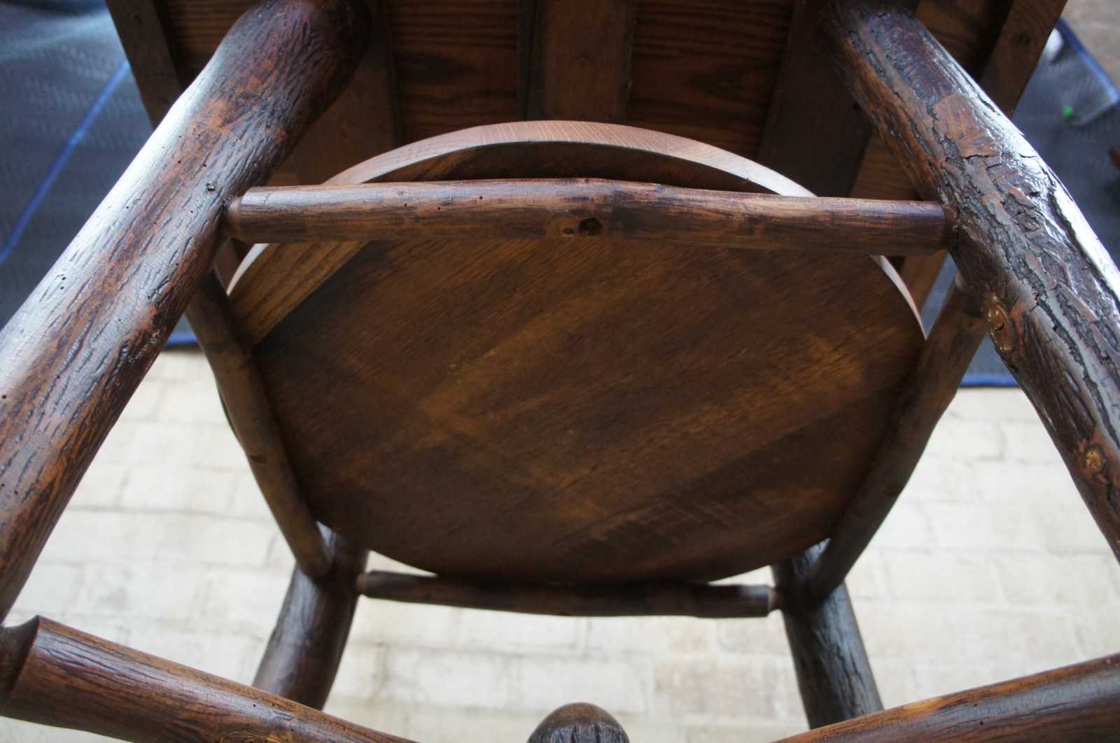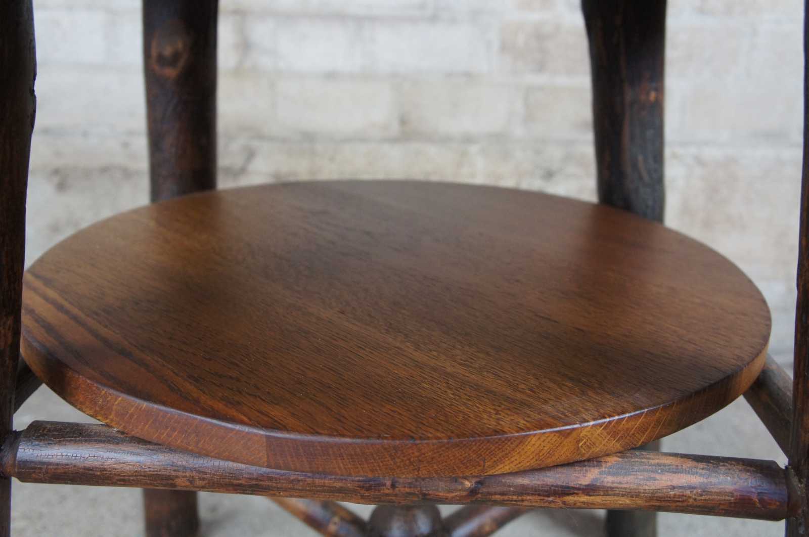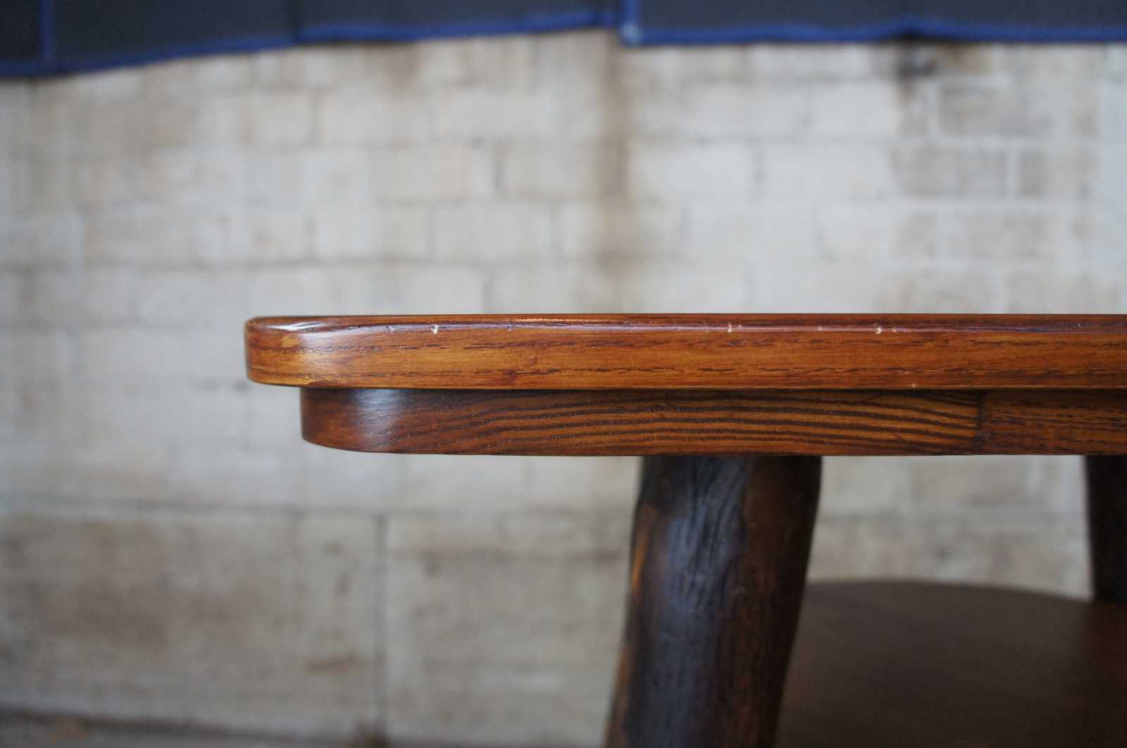 Pre 1930s table by The Rustic Hickory Furniture Company. Features a primitve log design with two tiers (a shelf for trinkets), and a trestle base with log finial, golden oak finish. The Rustic Hickory Furniture Company was founded in 1902 in Laporte, Indiana.