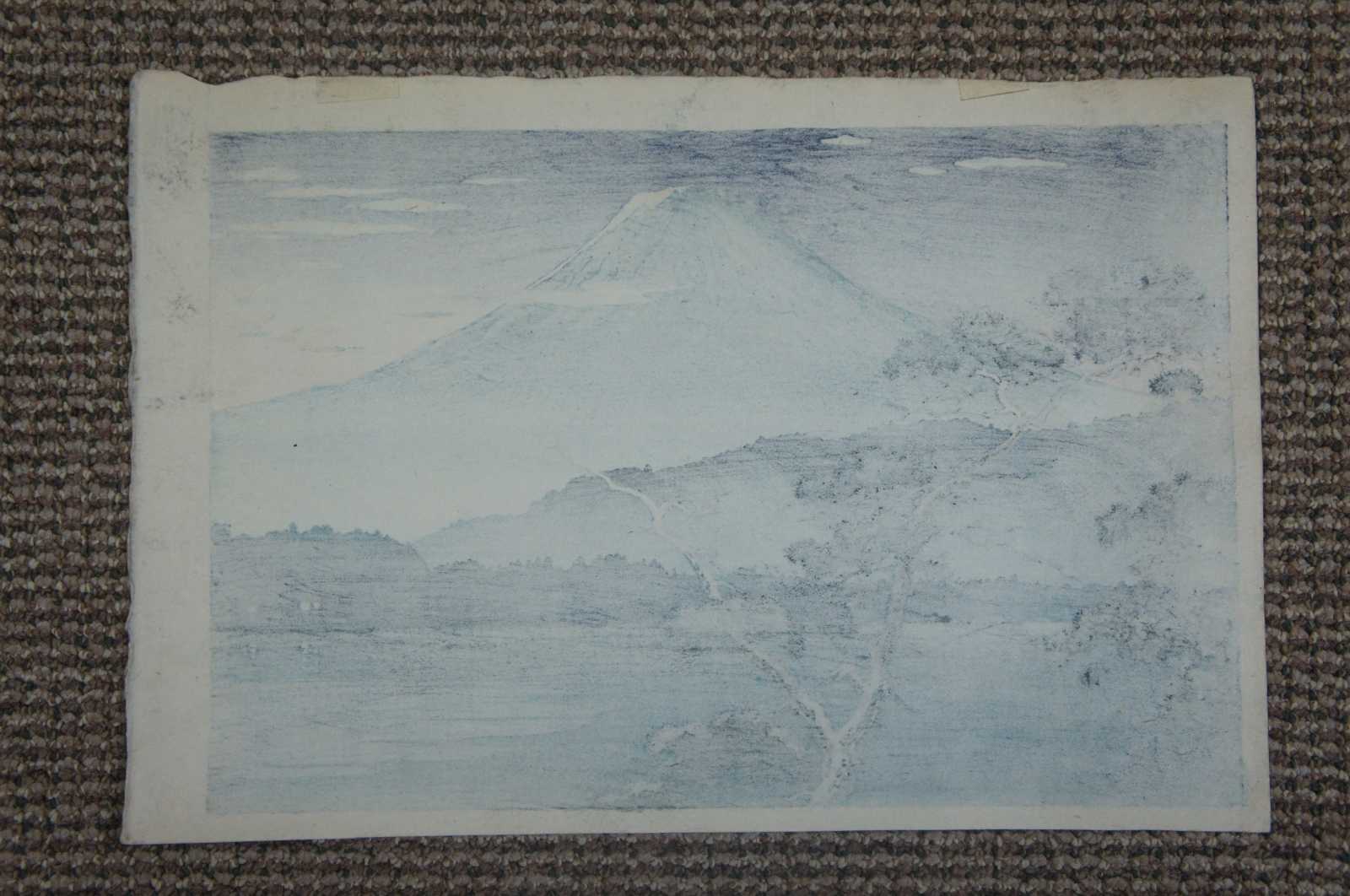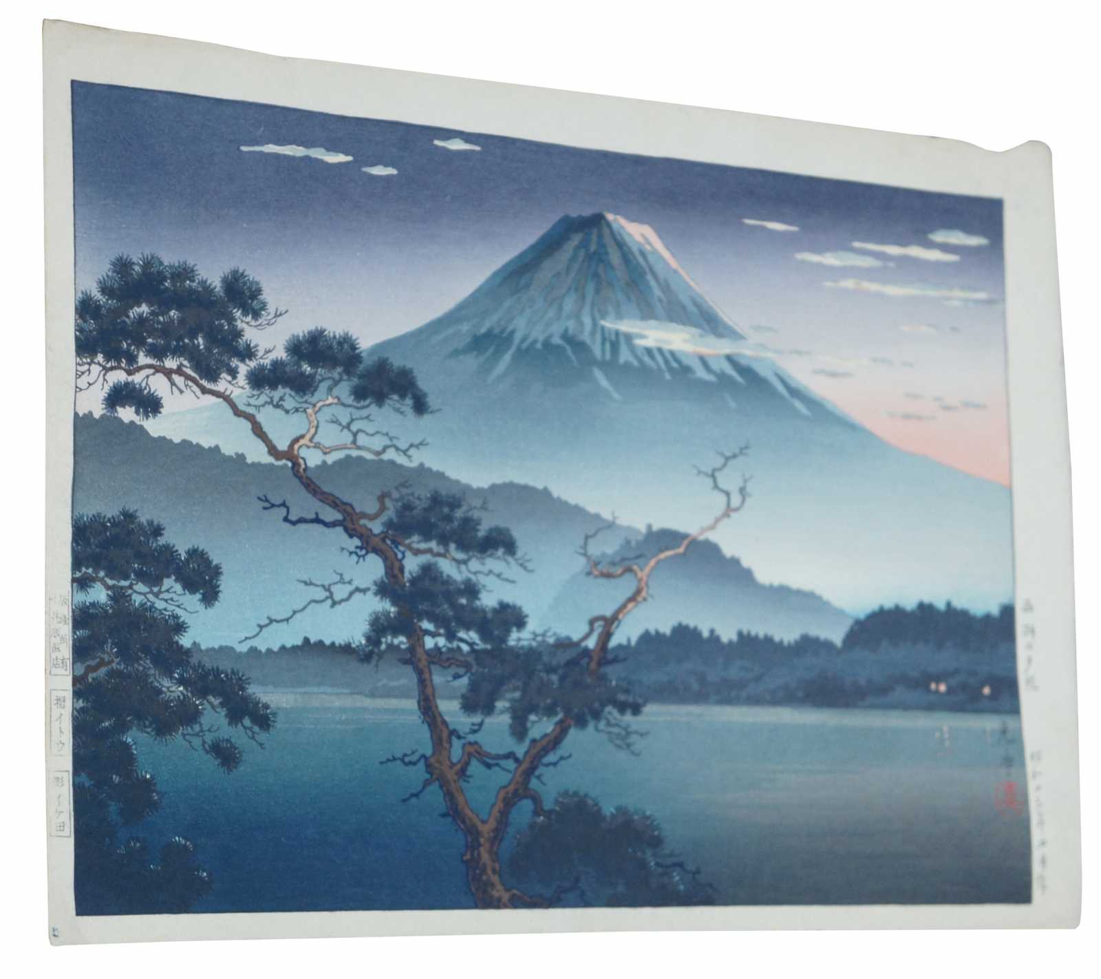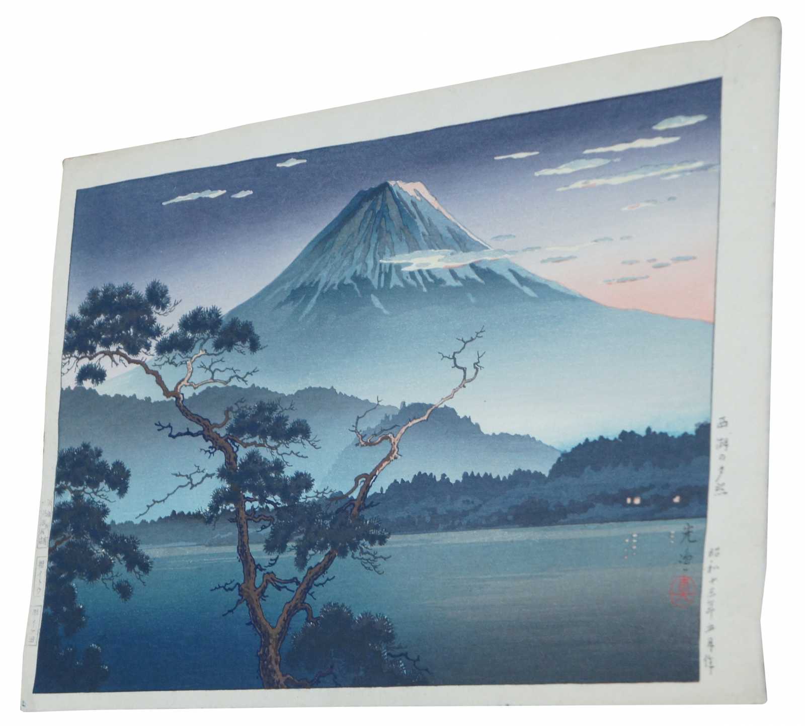 Early post-war Japanese landscape or seascape woodblock print "Mt. Fuji at Sunset" or "Mt. Fuji from Lake Sai" by Tsuchyia Koitsu (1870-1949).
