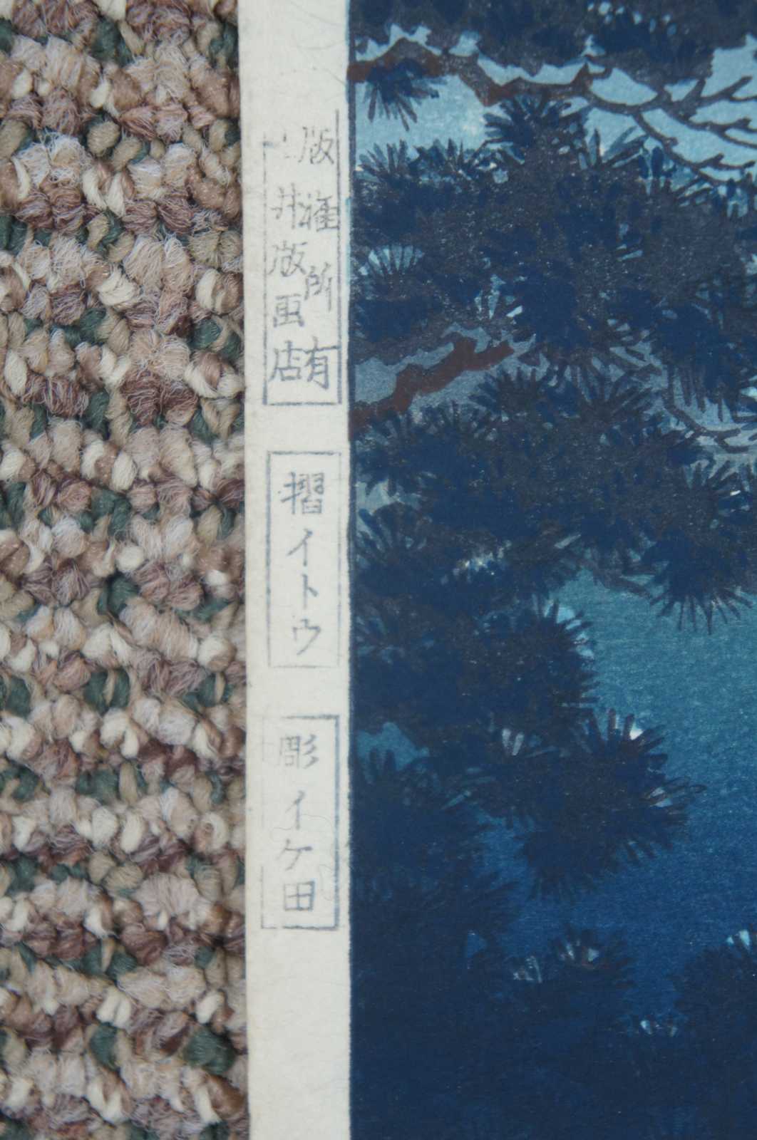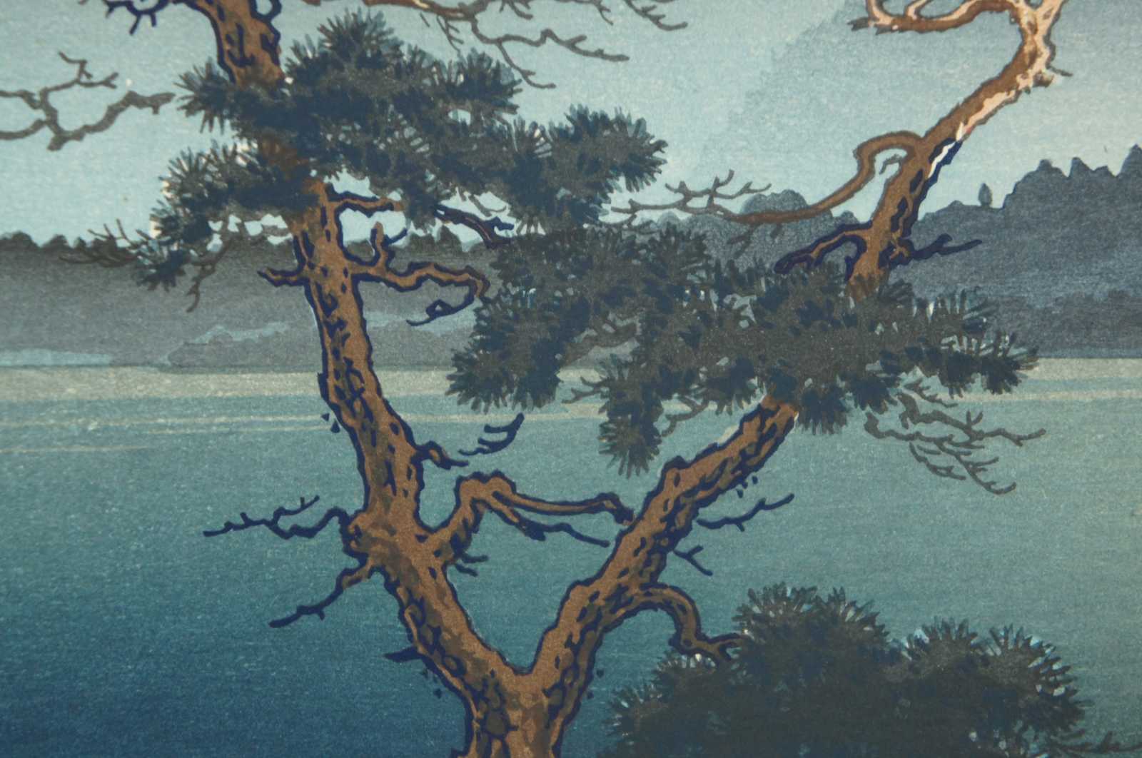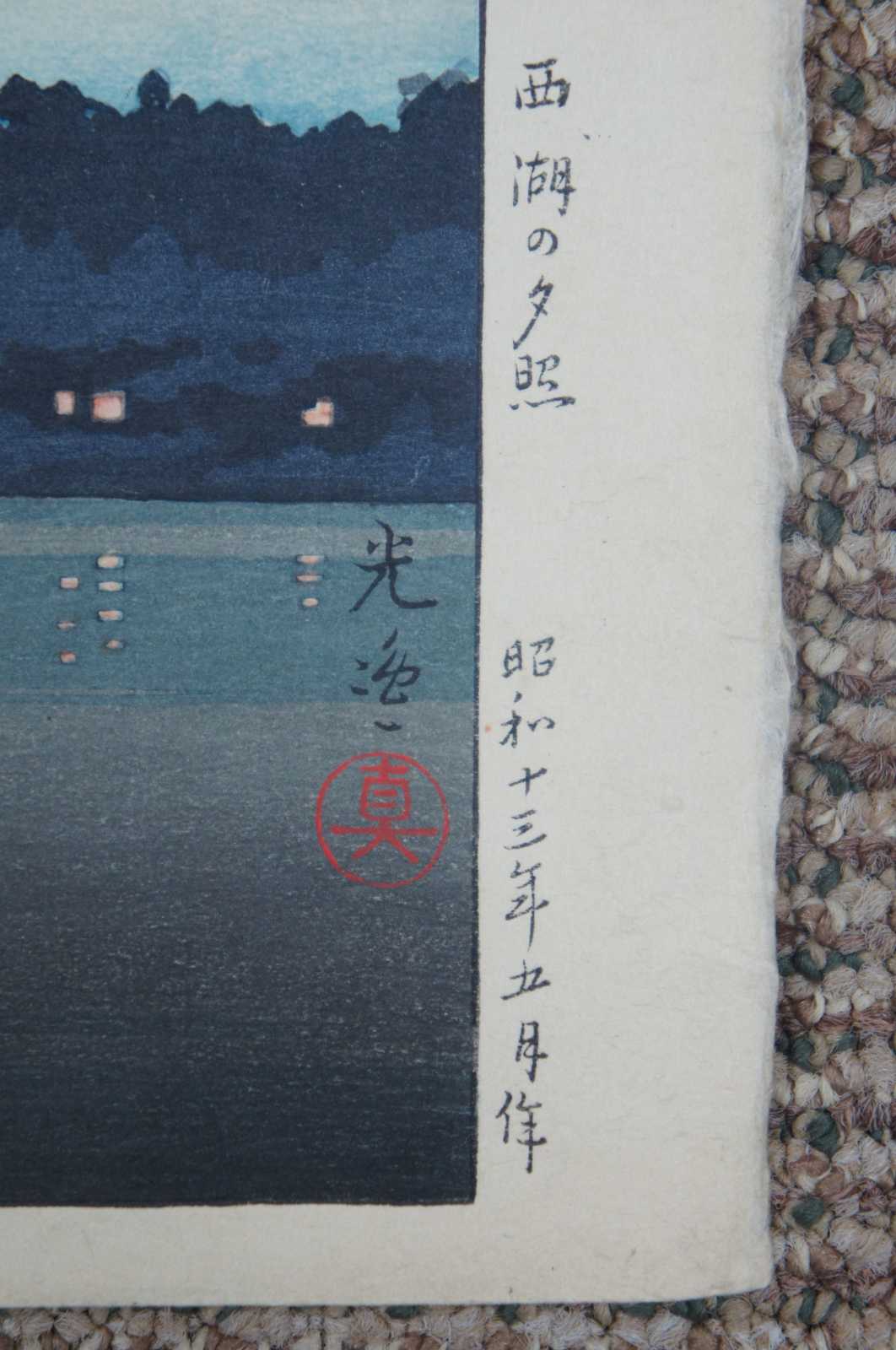 Early post-war Japanese landscape or seascape woodblock print "Mt. Fuji at Sunset" or "Mt. Fuji from Lake Sai" by Tsuchyia Koitsu (1870-1949).