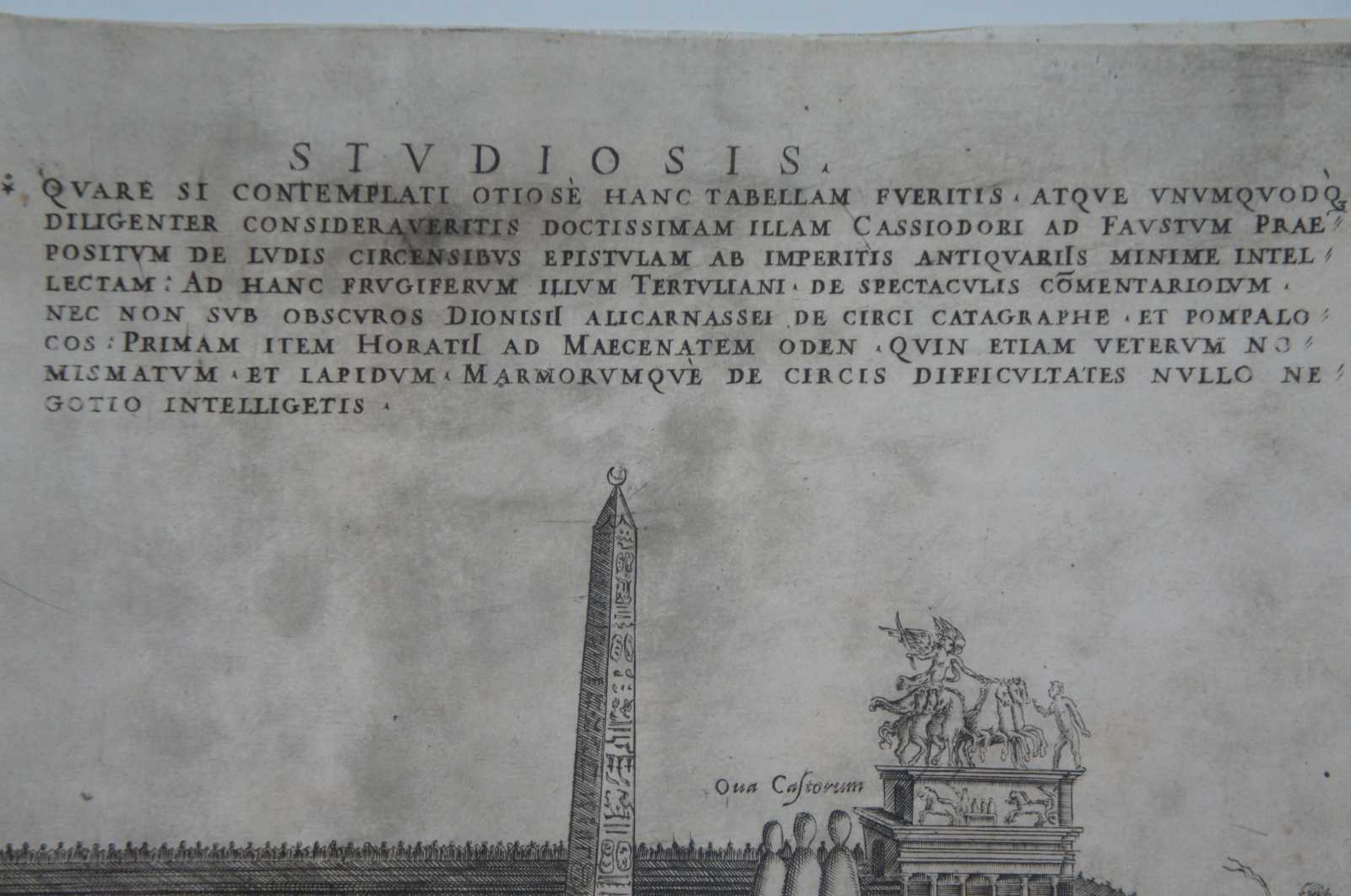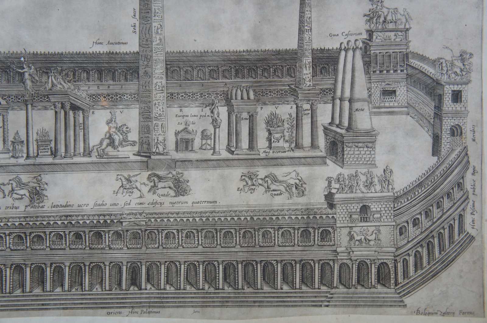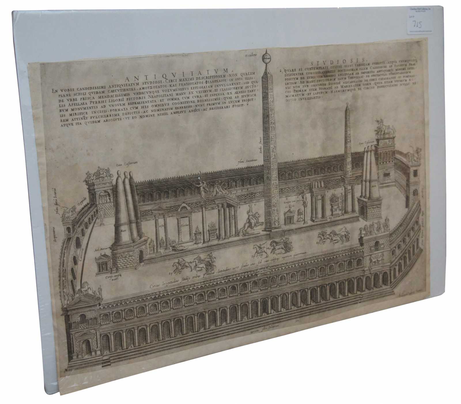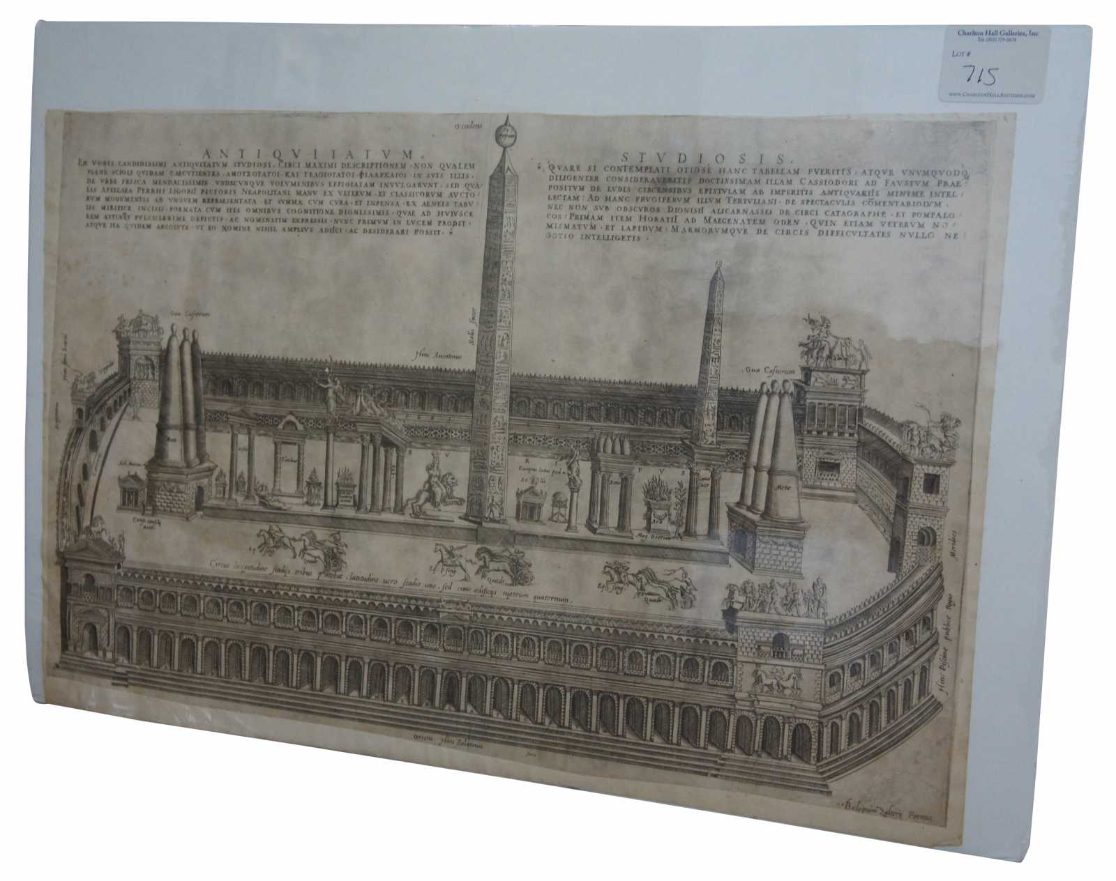 Antoine Lafréry (also known by the Italian name Antonio Lafreri) was a French printseller and publisher, and possibly also an engraver, who moved to Italy and was active in Rome from around 1540 until his death in 1577. His firm published maps and a wide range of prints: ancient and modern Rome, portraits, ornament and mythological, historical and religious subjects. He also bought and sold drawings, coins and medals. Among Lafréry’s publications were two architectural treatises and several sets of ornament prints, including Speculum Romanae Magnificentiae (c. 1540-c.1565). According to the subtitle of Speculum, it had the most accurately drawn representations of nearly all the extant monuments of the City of Rome; in the 1570s, the Lafréry catalogue listed some 500 subjects. Engraving depicting chariot racers in the Circus Maximus, after a painting by the eminent Italian architect and antiquarian Pirro Ligorio. According to the caption, the artist intended to show this Roman stadium as it appeared in antiquity. This engraving was originally published by Michele Tramezzino in 1553, and bears his monogram. Architectural, Italy, Speculum Romanae, Circus Maximus, Rome, Antique Print.