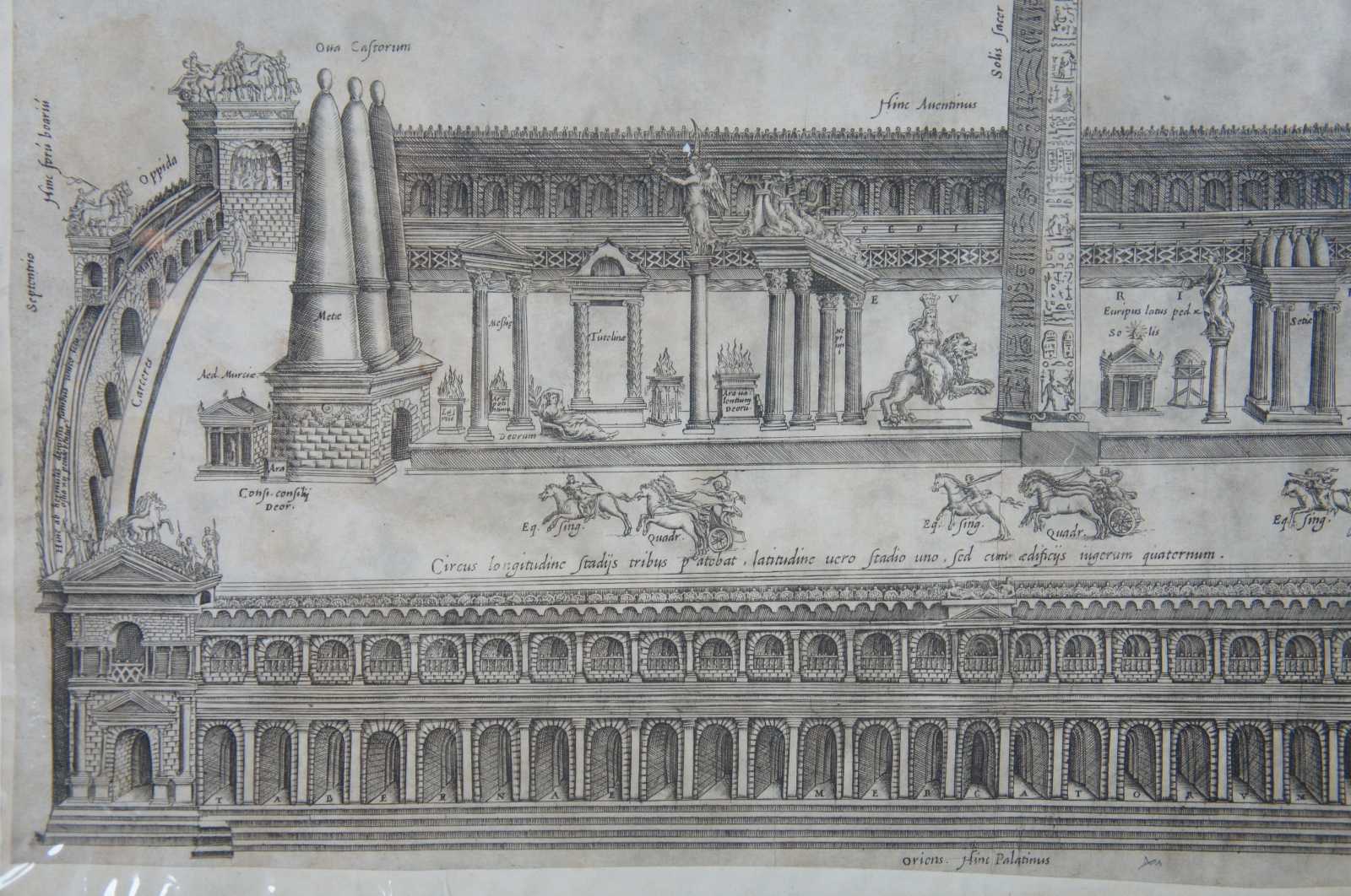 "The Circus Maximus was the first and largest circus in Rome, the site of games and entertainments, including charioteers, horseback riders, athletes, gladiatorial contests and musicians. The oval shape was particularly well suited to races, and on the track of this print, as the captions indicate, are both large chariots pulled by four horses and single riders. In the center is a large obelisk labeled “sacred to the sun,” a smaller one labeled “sacred to the moon,” and other sculptures including a statue of Fortune, a monument to Neptune topped with sculptures of dolphins, and at either end, groups of three large pillars called “metae,” which marked the starting line of the race course, with another set at the opposite end. In the lower left corner Roman soldiers are restraining two men, though whether they are being forced to compete or being carried away is not clear. Captions also label the orientation of the arena (e.g. “Hinc Aventinus” showing the location of the nearby Aventine hill).