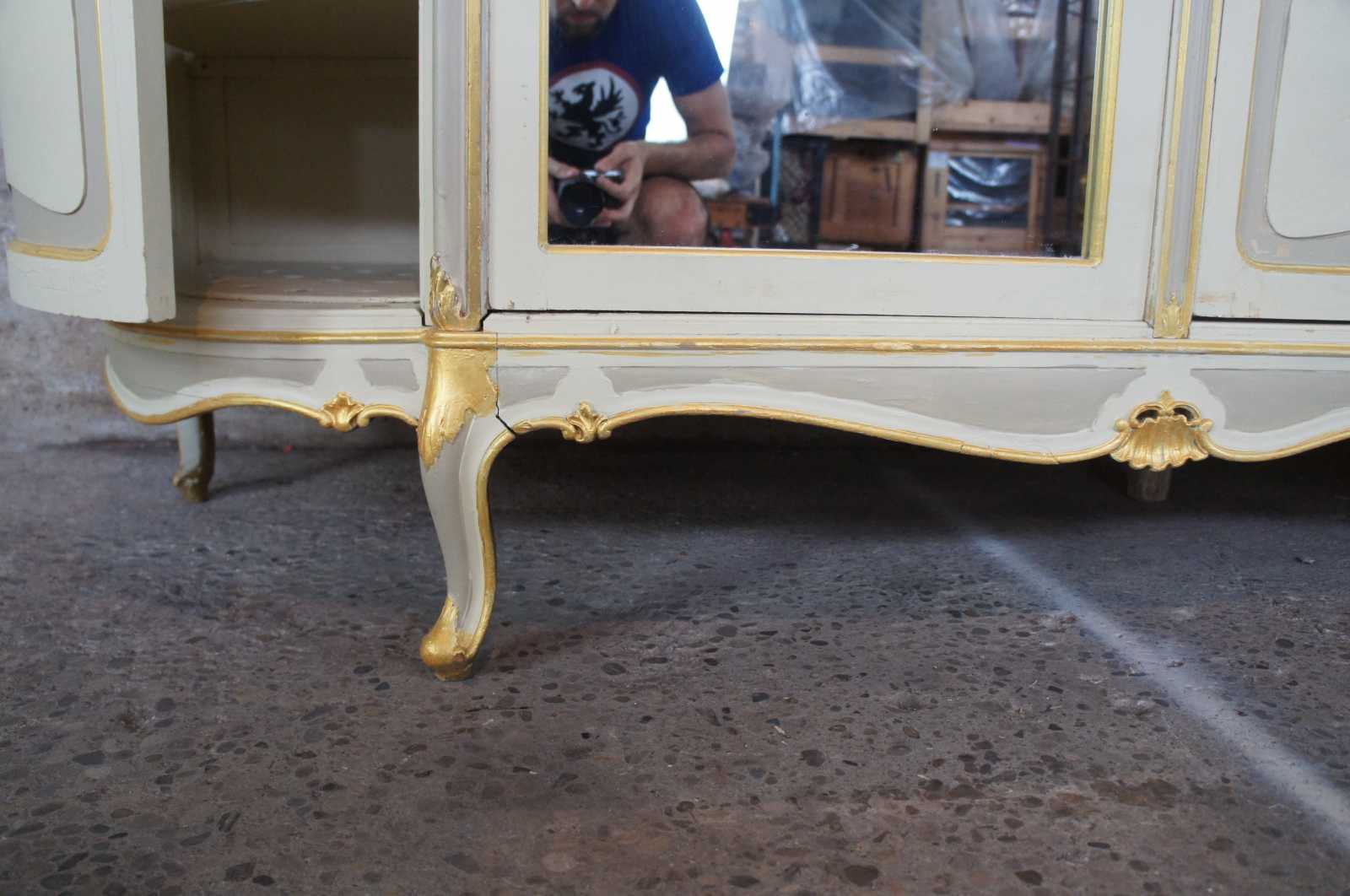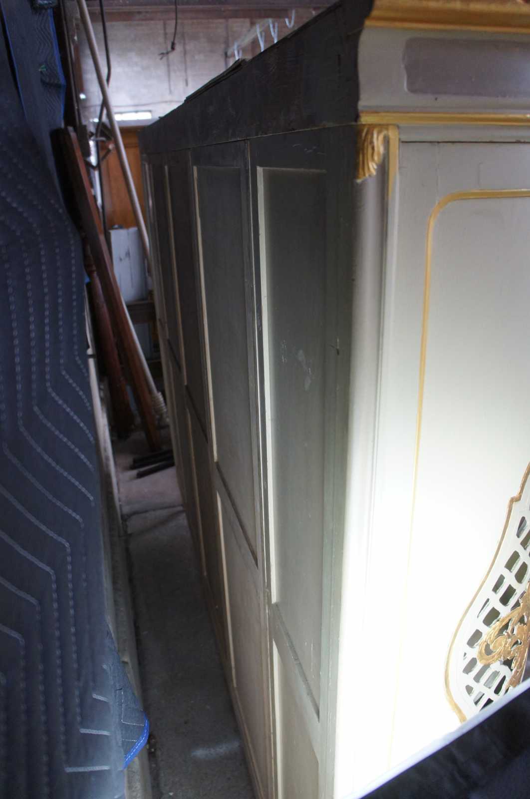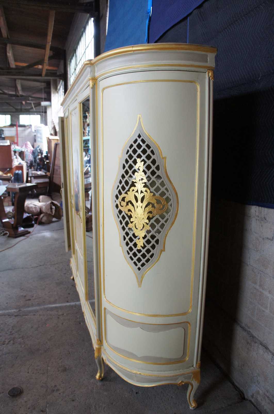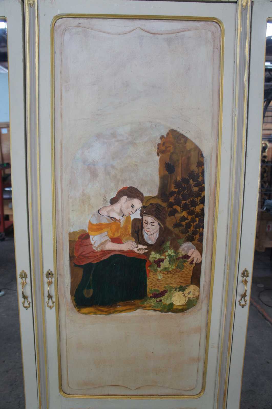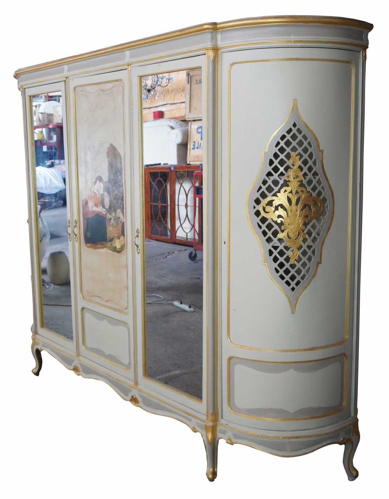 Antique monumental hand painted French Provincial knockdown wardrobe. A one of a kind cabinet that could be used to replace a closet. Features a demilune shape with pierced outer doors and fleur de lis design. The central cabinet door is handpainted with two women picking grapes. flanked by two mirrors. Opens to a vast array of shelving, includes scalloped trim and cabriole feet. Finish of the cabinet is white with gray panels and gold trim. Circa 1930s.