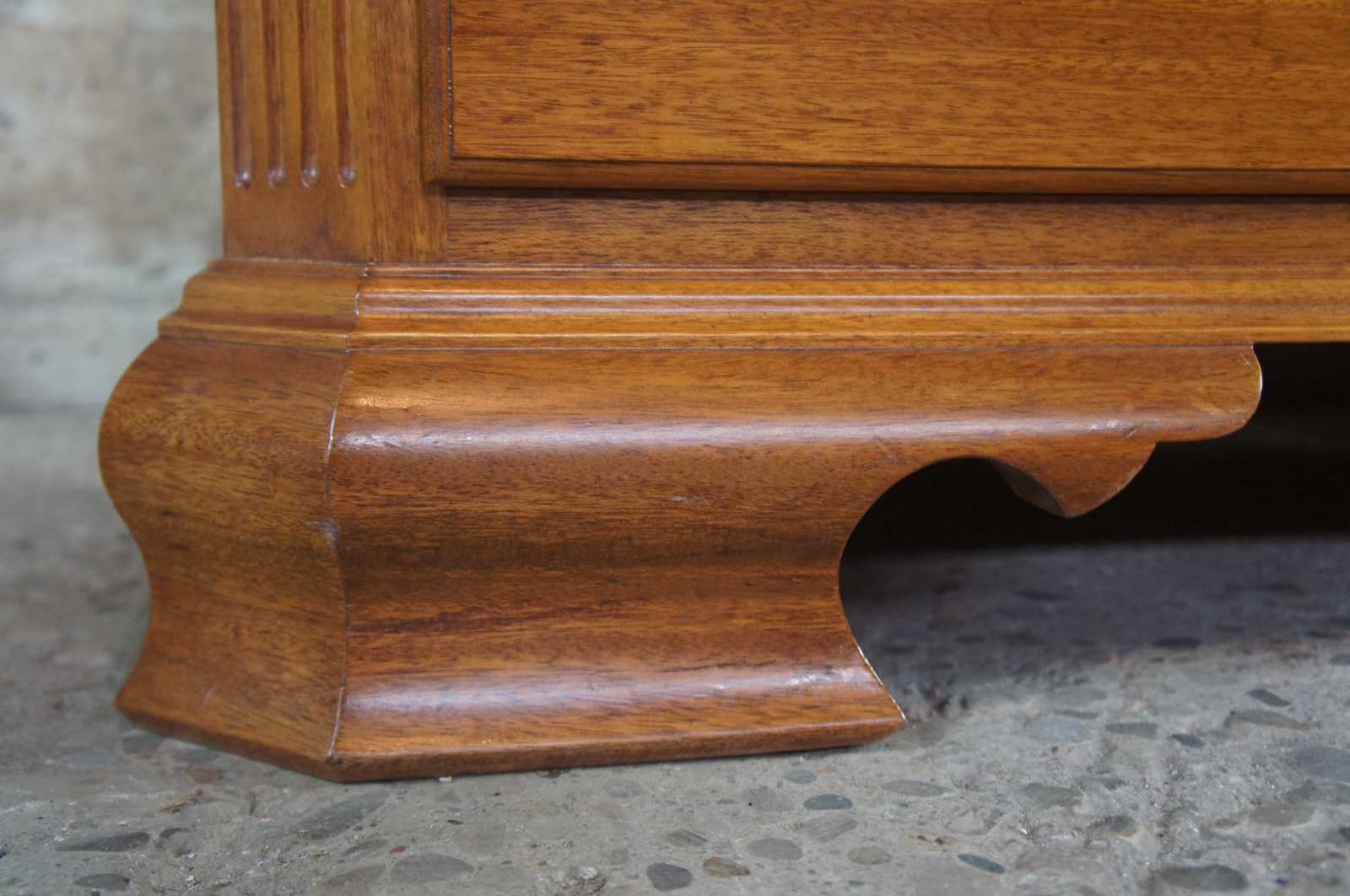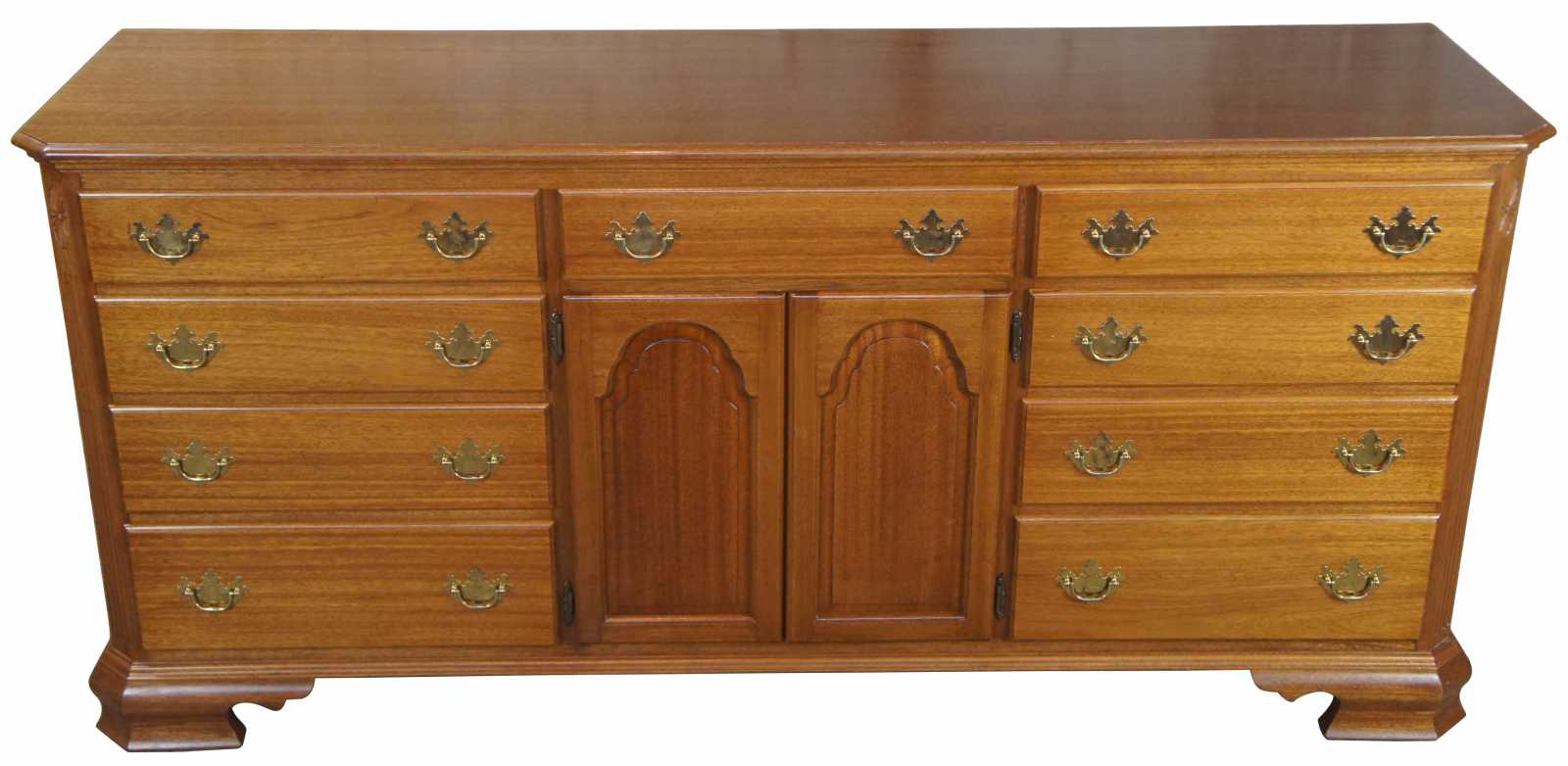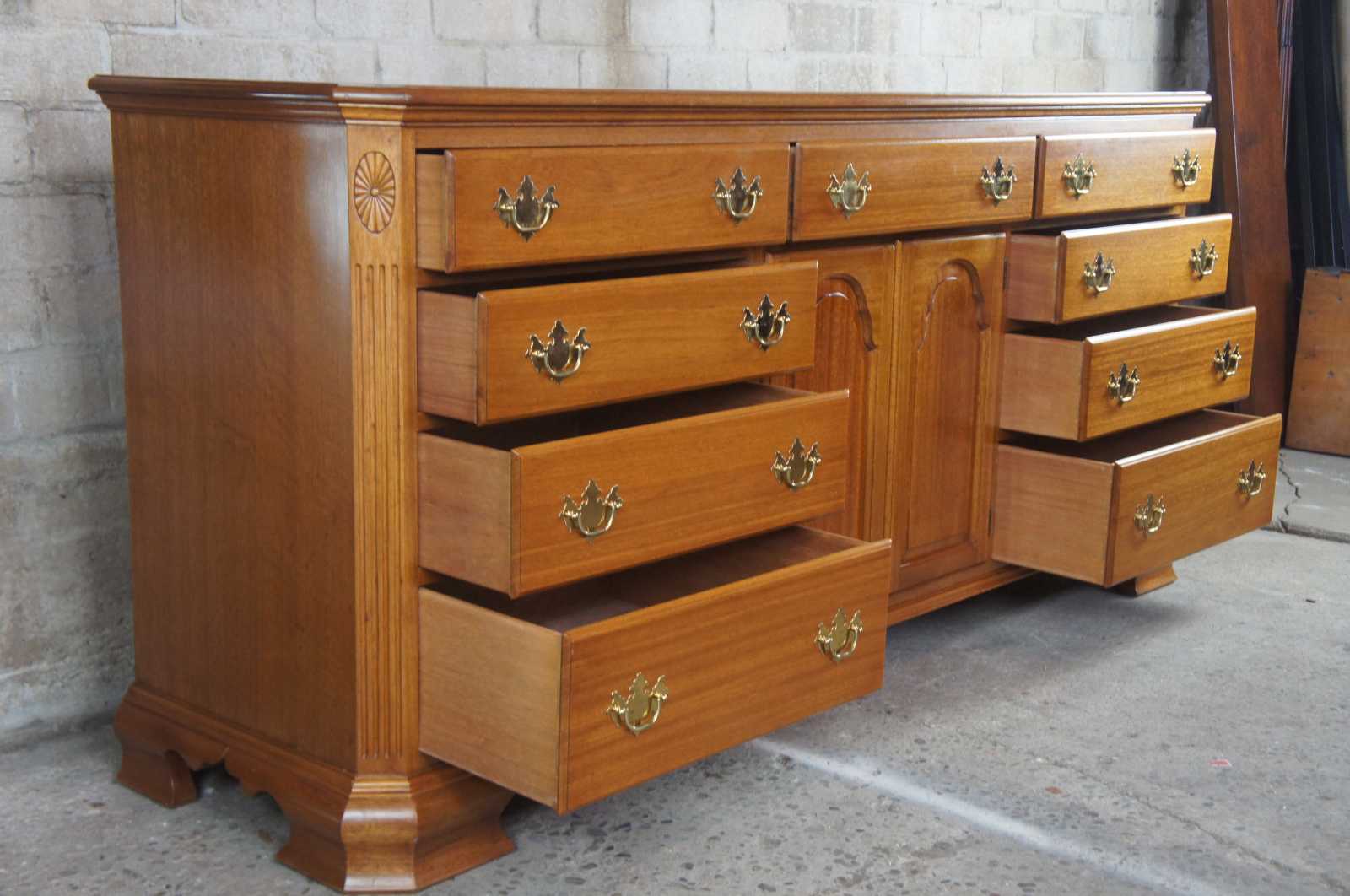 Early American style solid mahogany dresser. Hand made circa late 20th century. Manufactured based off of Ethan Allens 11-5203 eleven drawer triple dresser. Part of their Georgian Court collection. Features central cabinet with tray drawers behind doors.