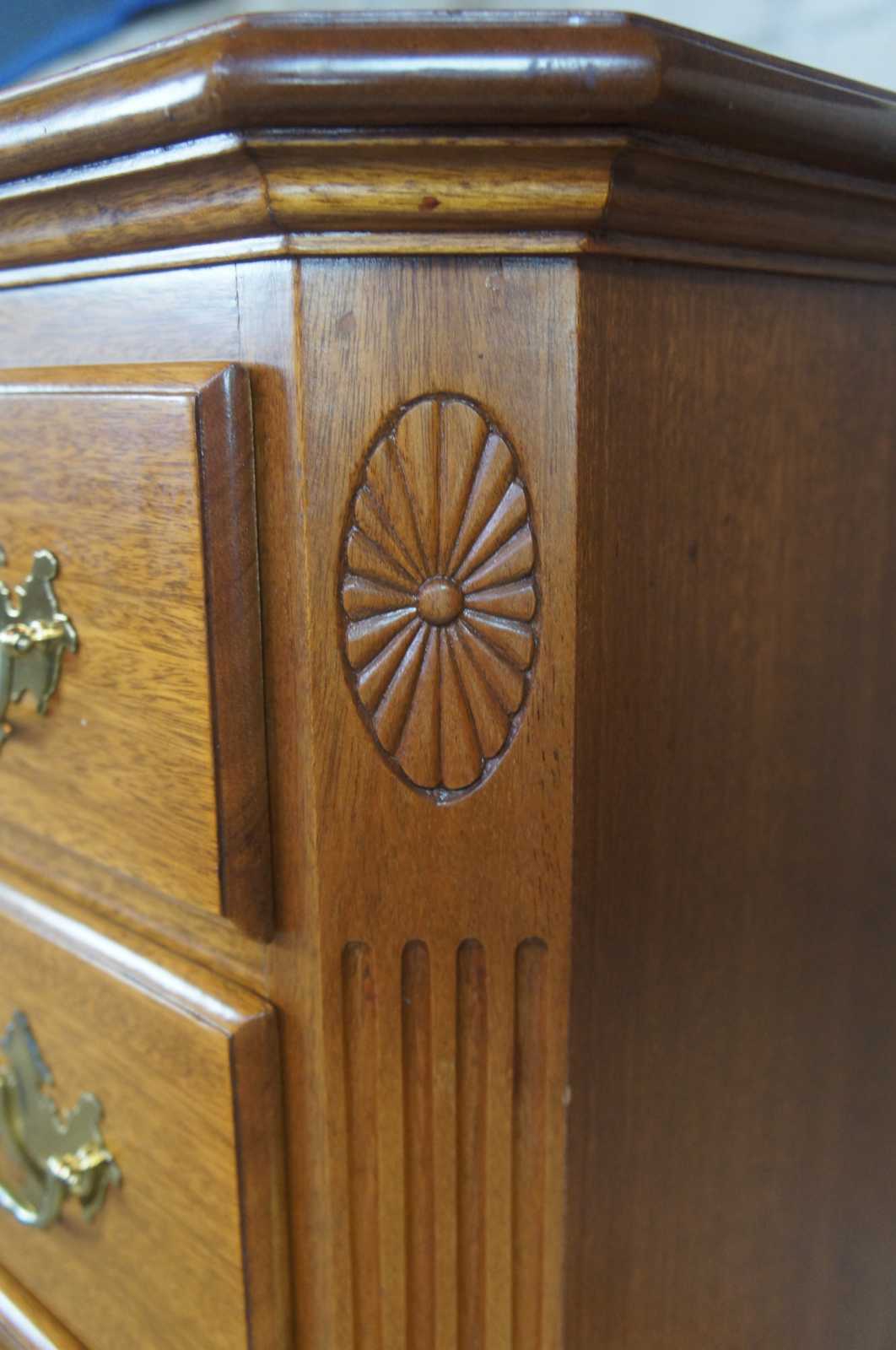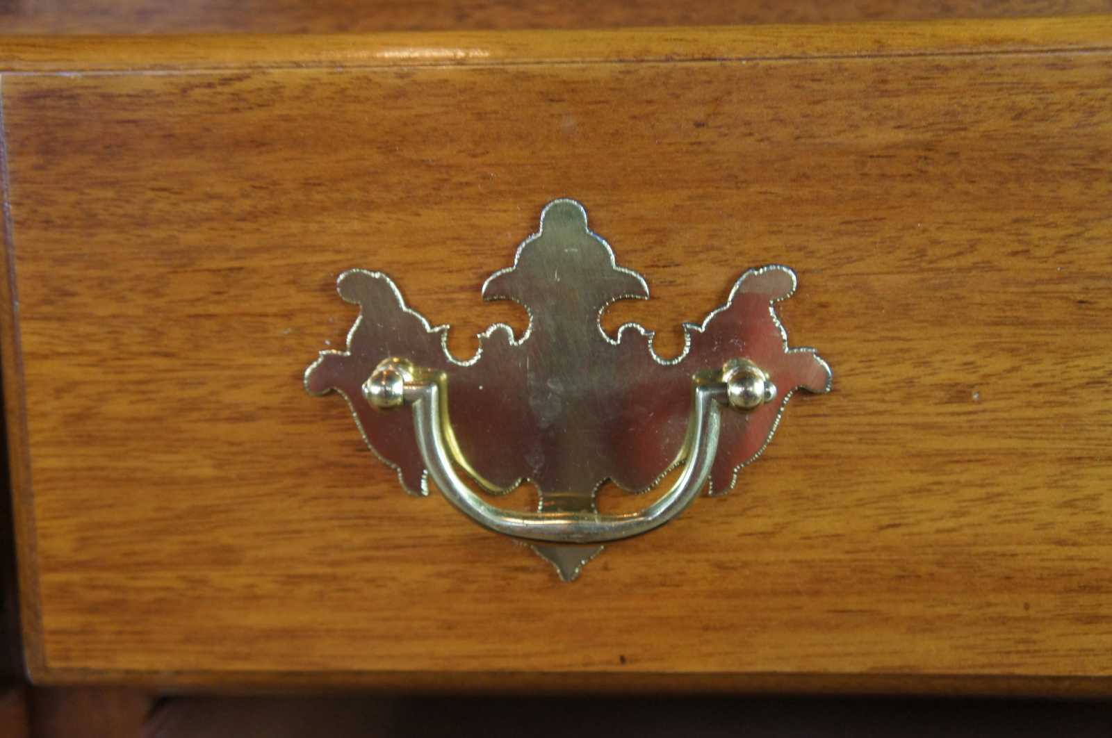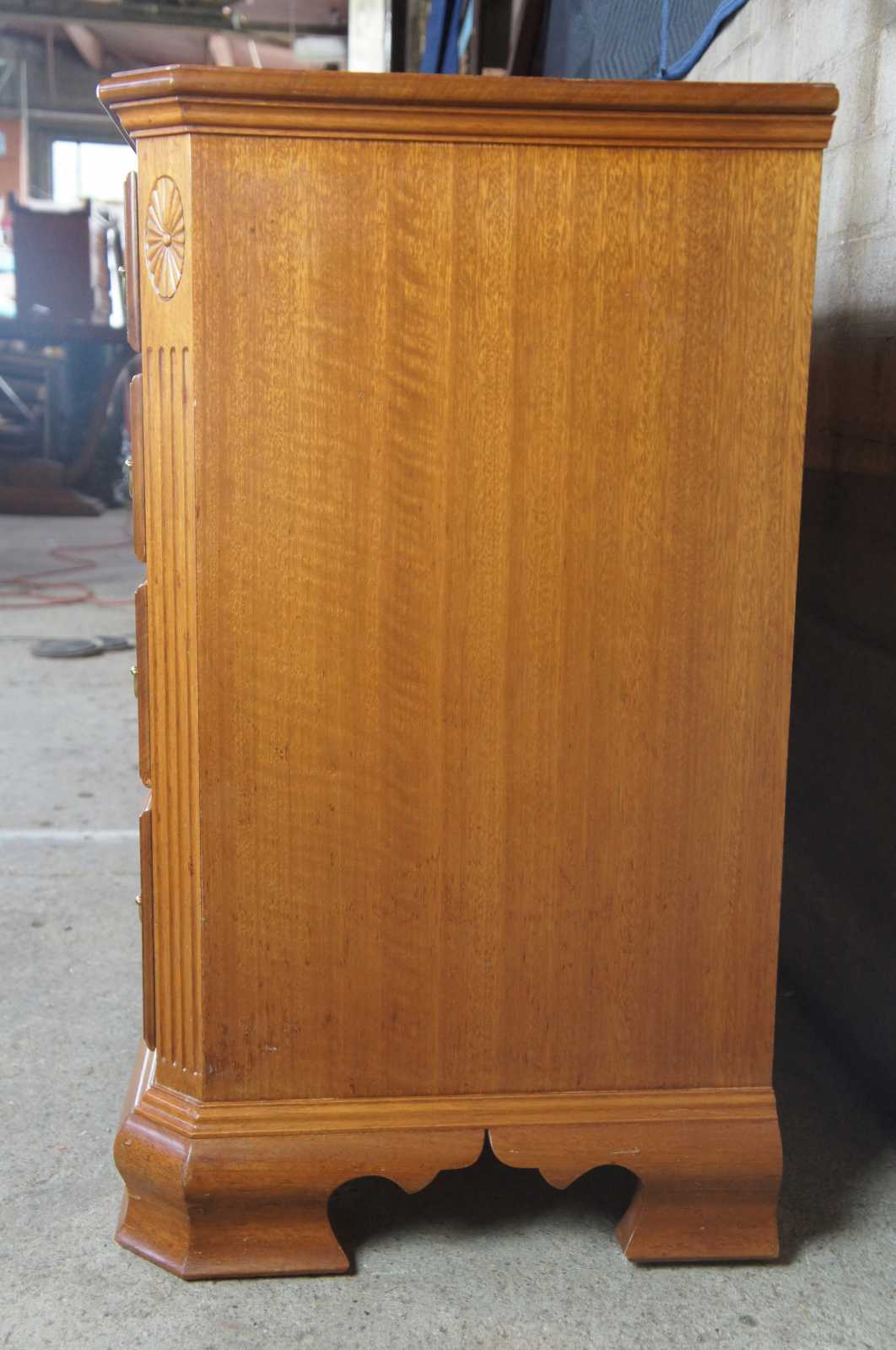 Early American style solid mahogany dresser. Hand made circa late 20th century. Manufactured based off of Ethan Allens 11-5203 eleven drawer triple dresser. Part of their Georgian Court collection. Features central cabinet with tray drawers behind doors.