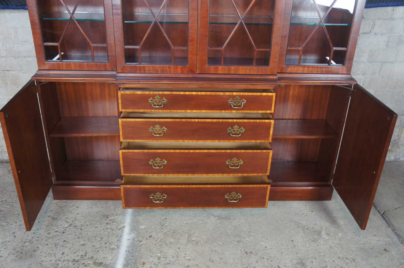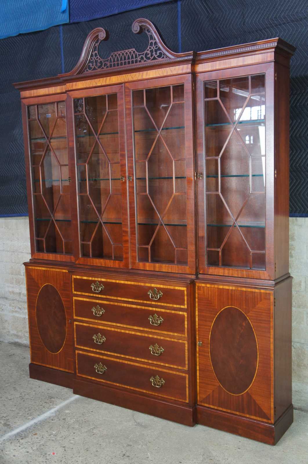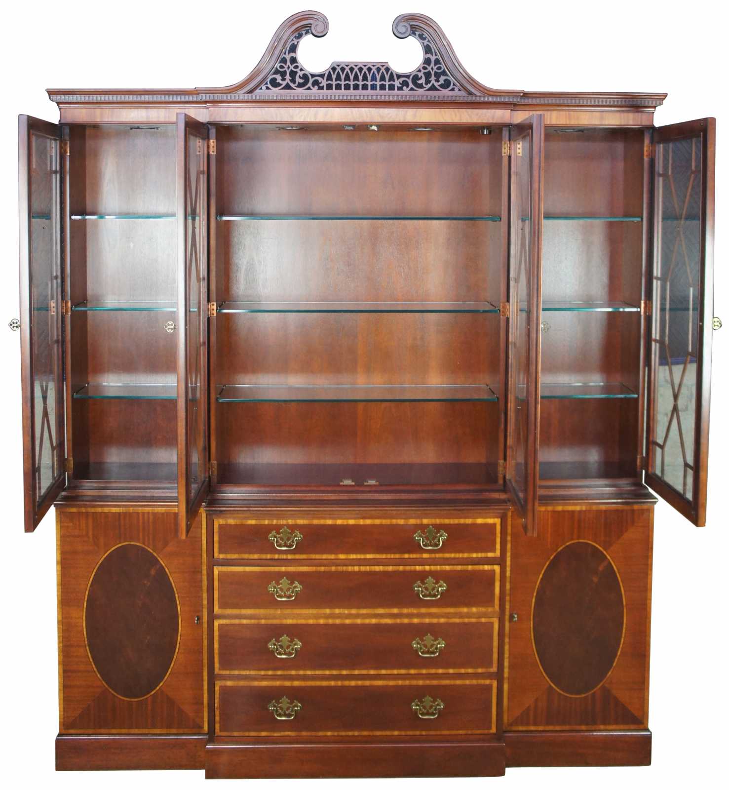 Circa 1980s Baker Furniture banded mahogany breakfront. Features chippendale styling with fretwork over the doors and along the pierced open pediment crown. Includes six drawers and two lower cabinets with walnut burl wood at the center. Opens to an illuminated top and nine glass shelves.