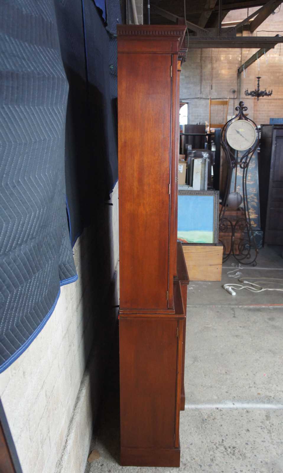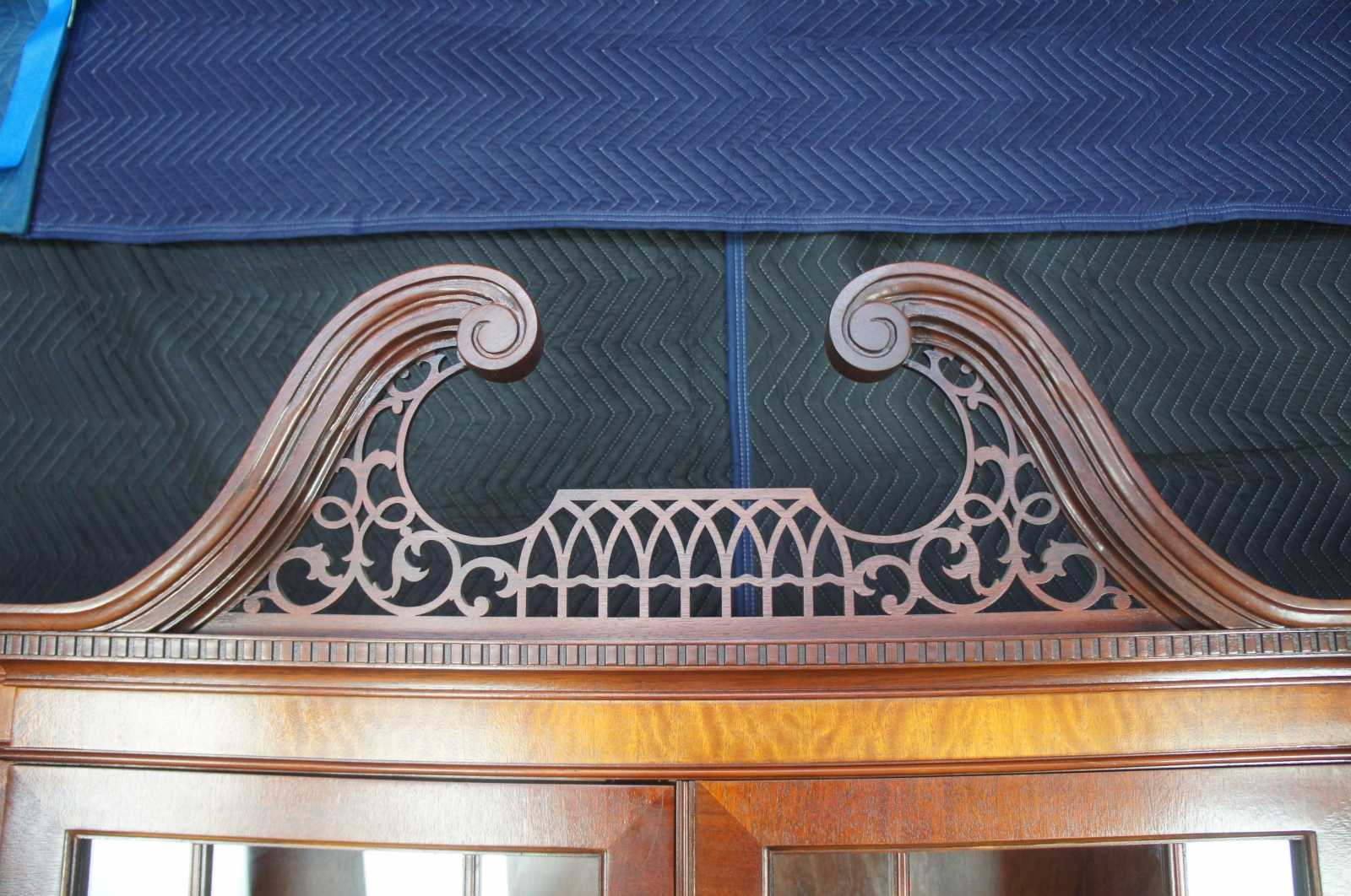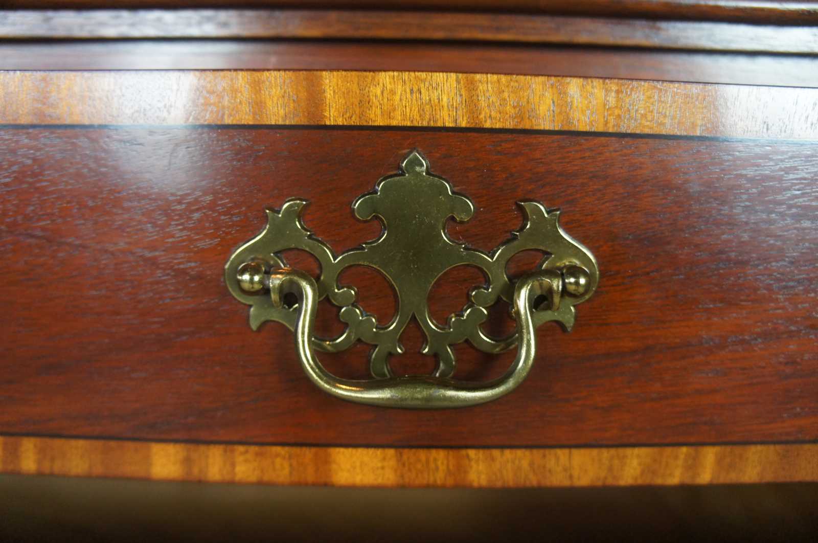 Circa 1980s Baker Furniture banded mahogany breakfront. Features chippendale styling with fretwork over the doors and along the pierced open pediment crown. Includes six drawers and two lower cabinets with walnut burl wood at the center. Opens to an illuminated top and nine glass shelves.