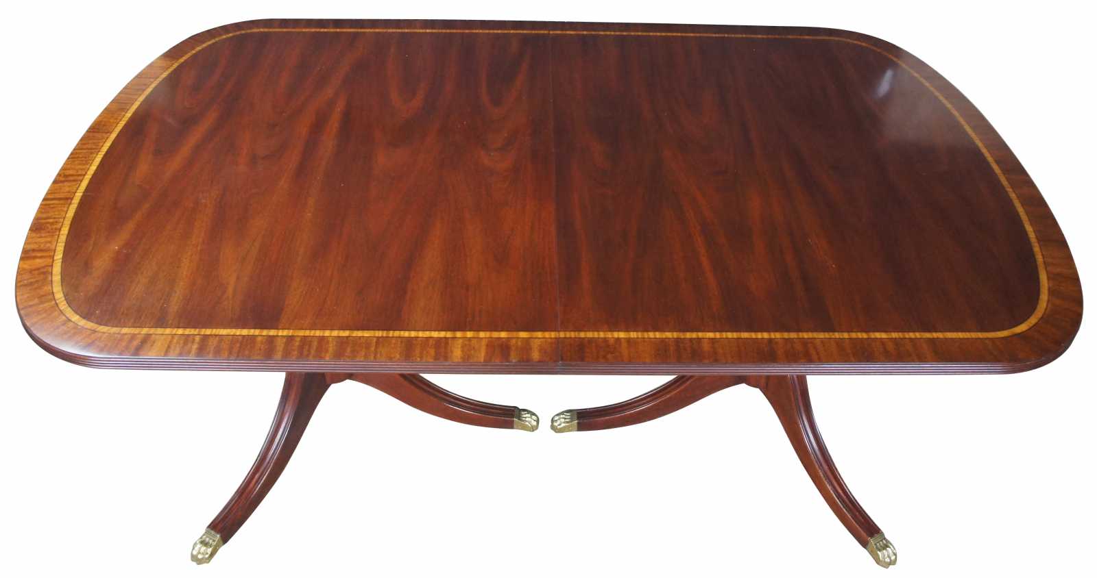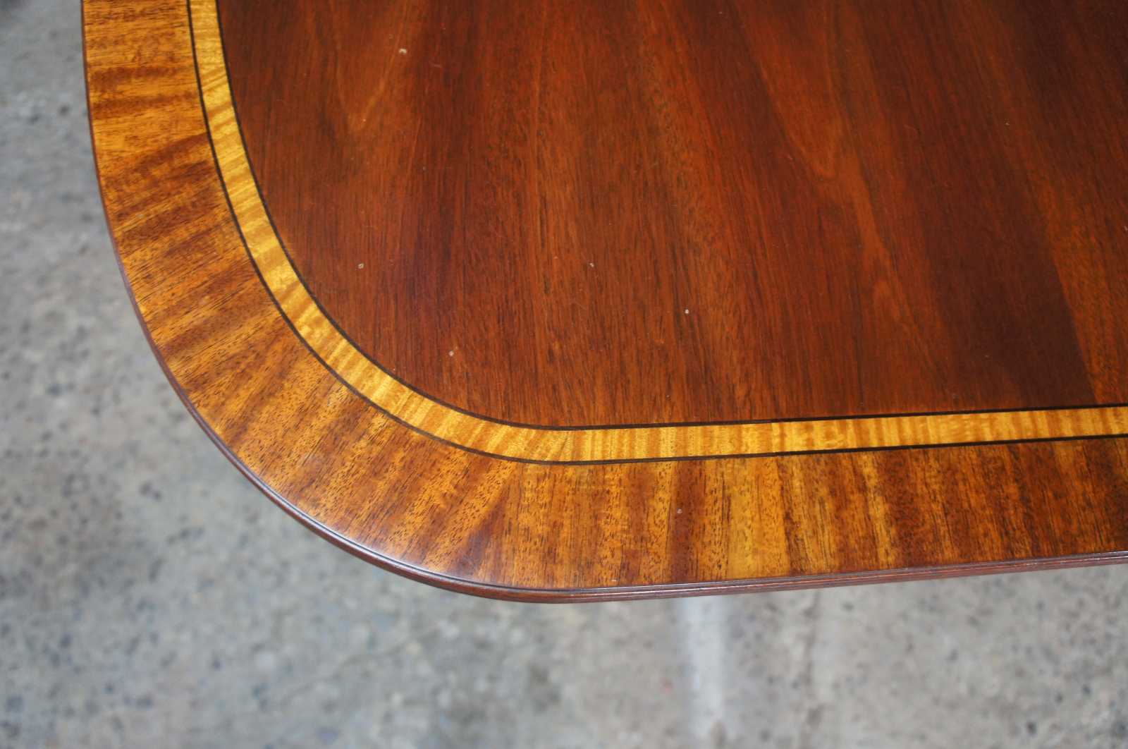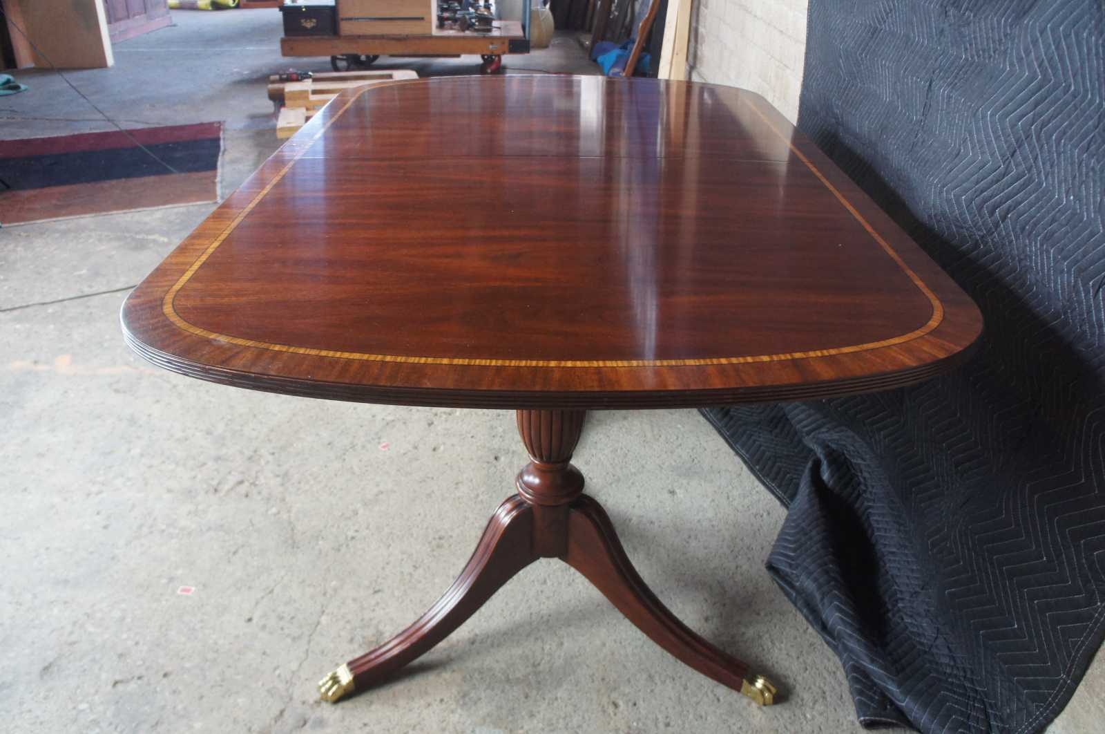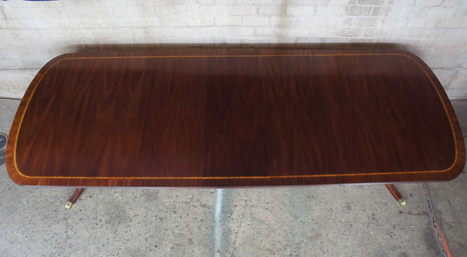 Cathedral figured mahogany veneer top with ribbon stripe border, pau amarilla inlay and anigre separators. Fillers are numbered and matched to each table. Reeded urn pedestal with three sweeps and brass terminals. Pedestals are reversible. Wood table slides. Pads included.